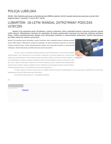 POLICJA LUBELSKA Źródło: http://lubelska.policja.gov.pl/lub/aktualnosci/28818,Lubartow-18-letni-wandal-zatrzymany-podczas-ucieczki.html Wygenerowano: Czwartek, 2 marca 2017, 00:46 LUBARTÓW: 18-LETNI WANDAL ZATRZYMANY PODCZAS UCIECZKI. Nawet 5 lat więzienia grozi 18-latkowi z gminy Lubartów, który uszkodził mienie o łącznej wartości ponad 1300 złotych. Młodzieniec zamiast iść spokojnie do domu postanowił rozerwać się niszcząc reklamę świetlną firmy, roletę antywłamaniową sklepu oraz obrywając lusterko w samochodzie osobowym. Został zatrzymany już kilka minut po swoich wyczynach. Nawet 5 lat więzienia grozi 18-latkowi z gminy Lubartów, który uszkodził mienie o łącznej wartości ponad 1300 złotych. Młodzieniec zamiast iść spokojnie do domu postanowił rozerwać się niszcząc reklamę świetlną firmy, roletę antywłamaniową sklepu oraz obrywając lusterko w samochodzie osobowym. Został zatrzymany już kilka minut po swoich wyczynach. W nocy z soboty na niedzielę lubartowscy policjanci zostali zaalarmowani, że ktoś zniszczył reklamę świetlną jednej z firm mieszczącej się na ulicy Bema w Lubartowie. Na miejscu okazało się, że oprócz zbitej reklamy ktoś uszkodził jeszcze roletę antywłamaniową w sąsiednim sklepie. Już po kilku minutach policjanci na załącznik ulicy Słowackiego w Lubartowie zauważyli młodzieńca, który na widok radiowozu rzucił się do ucieczki. Po chwili był on już w rękach mundurowych. Okazał się nim 18-letni mieszkaniec gminy Lubartów, który według ustaleń funkcjonariuszy mógł być sprawcą uszkodzeń mienia. Młodzieniec był pod wpływem blisko 2 promili alkoholu. Trafił do policyjnego aresztu. Po wytrzeźwieniu przyznał się do wandalizmu. W trakcie dalszych czynności wyszło na jaw, że chłopak oberwał też lusterko w zaparkowanym na ulicy 3-go maja w Lubartowie fiacie. Suma strat spowodowanych przez 18-latka przekroczyła 1300 złotych. Za zniszczenie mienia grozi do 5 – lat pozbawienia wolności. G.P. Ocena: 0/5 (0) Tweetnij