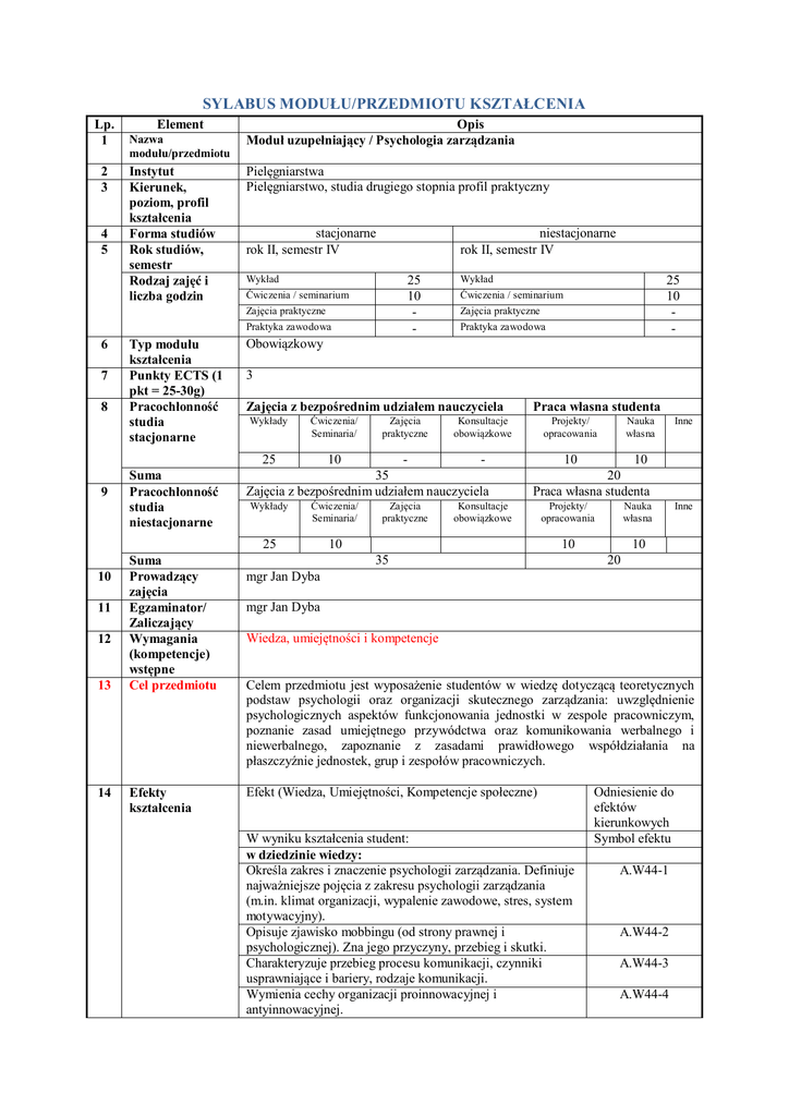 SYLABUS MODUŁU/PRZEDMIOTU KSZTAŁCENIA Lp. 1 2 3 4 5 Element Nazwa modułu/przedmiotu Instytut Kierunek, poziom, profil kształcenia Forma studiów Rok studiów, semestr Rodzaj zajęć i liczba godzin Opis Moduł uzupełniający / Psychologia zarządzania Pielęgniarstwa Pielęgniarstwo, studia drugiego stopnia profil praktyczny stacjonarne rok II, semestr IV niestacjonarne rok II, semestr IV Wykład Ćwiczenia / seminarium Zajęcia praktyczne 25 10 - Praktyka zawodowa 6 7 8 9 10 11 12 13 14 Typ modułu kształcenia Punkty ECTS (1 pkt = 25-30g) Pracochłonność studia stacjonarne Suma Pracochłonność studia niestacjonarne Suma Prowadzący zajęcia Egzaminator/ Zaliczający Wymagania (kompetencje) wstępne Cel przedmiotu Efekty kształcenia Wykład Ćwiczenia / seminarium Zajęcia praktyczne 25 10 - Praktyka zawodowa Obowiązkowy 3 Zajęcia z bezpośrednim udziałem nauczyciela Wykłady Ćwiczenia/ Seminaria/ 25 10 Wykłady Ćwiczenia/ Seminaria/ 25 10 Zajęcia praktyczne 35 Zajęcia z bezpośrednim udziałem nauczyciela Zajęcia praktyczne Praca własna studenta Konsultacje obowiązkowe Projekty/ opracowania Nauka własna Inne 10 20 Praca własna studenta Konsultacje obowiązkowe 10 Projekty/ opracowania Nauka własna 10 35 Inne 10 20 mgr Jan Dyba mgr Jan Dyba Wiedza, umiejętności i kompetencje Celem przedmiotu jest wyposażenie studentów w wiedzę dotyczącą teoretycznych podstaw psychologii oraz organizacji skutecznego zarządzania: uwzględnienie psychologicznych aspektów funkcjonowania jednostki w zespole pracowniczym, poznanie zasad umiejętnego przywódctwa oraz komunikowania werbalnego i niewerbalnego, zapoznanie z zasadami prawidłowego współdziałania na płaszczyźnie jednostek, grup i zespołów pracowniczych. Efekt (Wiedza, Umiejętności, Kompetencje społeczne) W wyniku kształcenia student: w dziedzinie wiedzy: Określa zakres i znaczenie psychologii zarządzania. Definiuje najważniejsze pojęcia z zakresu psychologii zarządzania (m.in. klimat organizacji, wypalenie zawodowe, stres, system motywacyjny). Opisuje zjawisko mobbingu (od strony prawnej i psychologicznej). Zna jego przyczyny, przebieg i skutki. Charakteryzuje przebieg procesu komunikacji, czynniki usprawniające i bariery, rodzaje komunikacji. Wymienia cechy organizacji proinnowacyjnej i antyinnowacyjnej. Odniesienie do efektów kierunkowych Symbol efektu A.W44-1 A.W44-2 A.W44-3 A.W44-4 Forma i warunki potwierdzenia efektu kształcenia Kompetencja społeczne umiejętności wiedza 15 w dziedzinie umiejętności: Stosuje metody diagnozujące sposób zarządzania organizacją A.U35-1 (klimat organizacji, pro/antyinnowacyjność/podatność brak podatności na zmianę). Dokonuje wyboru sposobów motywowania pracownika, A.U35-2 uwzględniając mocne i słabe strony danego sposobu, oraz jego krótko i długofalowe konsekwencje. Potrafi pracować zespołowo, usprawniać pracę zespołu i A.U35-3 przezwyciężać trudności. w dziedzinie kompetencji społecznych: Ponosi odpowiedzialność za udział w podejmowaniu decyzji B.K1 zawodowych Rozwiązuje dylematy etyczne w organizacji pracy własnej i B.K3 zespołu Dba o wizerunek własnego zawodu B.K7 Jest otwarty na rozwój podmiotowości własnej i pacjenta B.K13-1 Efekt kształcenia Sposób potwierdzenia (weryfikacji) osiągany przez moduł/przedmiot (symbol efektu) Symbol efektu A.W44-1 Egzamin ustny, obserwacja przez prowadzącego, dyskusje A.W44-2 Egzamin ustny, obserwacja przez prowadzącego, dyskusje A.W44-3 Egzamin ustny, obserwacja przez prowadzącego, dyskusje A.W44-4 Egzamin ustny, obserwacja przez prowadzącego, dyskusje 16 17 18 Stosowane metody dydaktyczne Forma i warunki zaliczenia modułu, zasady dopuszczenia do egzaminu oraz zaliczenia poszczególnych zajęć Treści merytoryczne przedmiotu A.U35-1 A.U35-2 A.U35-3 Egzamin ustny, obserwacja przez prowadzącego, dyskusje Egzamin ustny, obserwacja przez prowadzącego, dyskusje Egzamin ustny, obserwacja przez prowadzącego, dyskusje B.K1 B.K3 B.K7 B.K13-1 Dyskusja, obserwacja przez prowadzącego Dyskusja, obserwacja przez prowadzącego Dyskusja Dyskusja, obserwacja przez prowadzącego Wykład, ćwiczenia praktyczne, warsztaty, dyskusja, prezentacje multimedialne Aktywny udział w ćwiczeniach, projekt grupowy: przygotowanie interaktywnej prezentacji Zaliczenie z oceną w formie ustnej z treści wykładów na ostatnich zajęciach Tematyka wykładów : 1. Wprowadzenie do psychologii zarządzania. 2. Człowiek a organizacja – interakcje, rodzaje wpływów, konsekwencje. 3. Dynamika małych grup – formy małych grup, grupy zadaniowe, procesy formowania się grup oraz orientacji na zadanie, role społeczne a grupa. 4. Przywództwo w grupie – formy przywództwa oraz ich konsekwencje dla grupy. Perspektywa psychologii społecznej i mikrosocjologii.Komunikacja w grupie i organizacji – modele, konsekwencje, bariery komunikacyjne. 5. Motywacja a organizacja – teorie motywacji, systemy motywacyjne – cechy i konsekwencje. 6. Psychologia podejmowania decyzji – podejmowanie decyzji, motywy epistemiczne, heurystyki, elementy wpływu społecznego. 7. Stres – podstawowe zagadnienia- natura, dynamika, teorie; Stres w organizacji – przyczyny, konsekwencje, strategie radzenia sobie. Konflikty oraz sposoby rozwiązywania sytuacji konfliktowych. Organizacja – cechy, kultura organizacji – rodzaje oraz implikacje dla organizacji oraz jej członków, proinnowacyjność oraz antyinnowacyjność; problemy organizacyjne: stres, wypalenie zawodowe, lobbing. 10. Metodologia – diagnoza organizacji – jej struktury i kultury. Metody ilościowe i jakościowe – charakterystyka oraz wady i zalety. 8. 9. Tematyka ćwiczeń/seminarium 1. Zajęcia wprowadzające, charakterystyka przedmiotu, prezentacja założeń oraz wymagań. 2. Dynamika małych grup – ćwiczenia praktyczne oraz dyskusja; praca grupowa nad problemem jako studium przypadku, diagnoza grupy i przywództwa. 3. Komunikacja – ćwiczenia prak