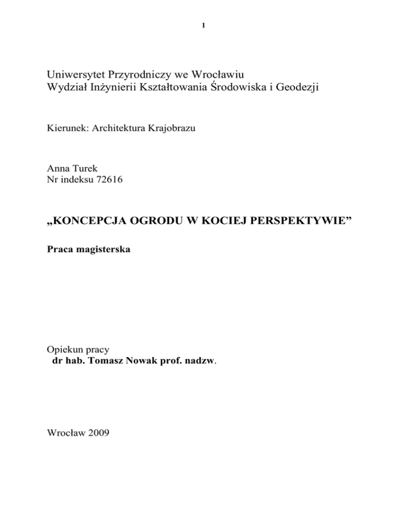 1 Uniwersytet Przyrodniczy we Wrocławiu Wydział Inżynierii Kształtowania Środowiska i Geodezji Kierunek: Architektura Krajobrazu Anna Turek Nr indeksu 72616 „KONCEPCJA OGRODU W KOCIEJ PERSPEKTYWIE” Praca magisterska Opiekun pracy dr hab. Tomasz Nowak prof. nadzw. Wrocław 2009 2 „KONCEPCJA OGRODU W KOCIEJ PERSPEKTYWIE” Naturalne piękno dzikiej przyrody opiera się na harmonijnym współistnieniu świata fauny i flory. Ta myśl powraca od lat nasuwając nurtujące pytanie: czy w ograniczonych powierzchnią ekosystemach ogrodów można stworzyć dzieło sztuki w połączonej kompozycji piękna motywów roślinnych i majestatu naszych bliskich współtowarzyszy ze świata zwierząt. Tradycyjne piękno zarówno tego co zachwyca nas w ogrodach jak i tego co dostarcza nam niepowtarzalnych doznań nie zawsze idzie w parze z potrzebami i przyzwyczajeniami naszych czworonogów. Głęboko wierzę w to, że istnieje kompromis pozwalający nie tylko na zachowanie wszystkiego tego czego oczekujemy od ogrodu, ale i pozwoli na wzbogacenie oazy sztuki zmysłów w nowe doznania jakie wynikają z przyjemności obcowania z naszymi ukochanymi futerkowymi przyjaciółmi. Intencją pracy nie jest stworzenie ogrodu dla potrzeb kota, lecz przedstawienie propozycji rozwiązań mających na celu estetyczne i harmonijne zapewnienie zwierzętom rozrywki i bezpieczeństwa, przy jednoczesnym zachowaniu walorów estetycznych otoczenia. Moim celem jest próba przełamania wyobrażeń o konieczności stosowania prymitywnych rozwiązań konstrukcyjnych przypominających zasieki, klatki czy prymitywnie pozbijane straszące wyglądem konstrukcje wspinaczkowe wyeksponowane pośród wykarczowanych ze wszystkiego co nie jest trawą smutnych okaleczonych przestrzeni. Zwierząt nie obowiązują nasze definicje: środowiska, natury i krajobrazu. Wszystko co je otacza jest dla nich środowiskiem naturalnym, a więc tylko od nas zależy czy to co wykreujemy zasługiwać będzie na miano piękna natury. Kot jest istotą zbyt piękną aby eksponować go w niestosownym otoczeniu Anna Turek 3 OŚWIADCZENIE OPIEKUNA PRACY Oświadczam że niniejsza praca magisterska pt. : „KONCEPCJA OGRODU W KOCIEJ PERSPEKTYWIE” autorstwa studentki Anny Turek została przygotowana pod moim kierunkiem w Zakładzie Kompozycji Krajobrazu, i stwierdzam że spełnia ona warunki do przedstawienia jej w postępowaniu o nadanie tytułu zawodowego. ……………………….. data ………………………………… czytelny podpis opiekuna OŚWIADCZENIE AUTOR PRACY Świadoma odpowiedzialności prawnej oświadczam, że niniejsza praca dyplomowa: Została napisana przeze mnie i nie zawiera treści uzyskanych w sposób niezgodny z obowiązującymi przepisami Ustawy z dnia 4 lutego 1994 r. o prawie autorskim i prawach pokrewnych, Nie była wcześniej przedmiotem procedur związanych z ubieganiem się o tytuł naukowy lub zawodowy na wyższej uczelni, Załączona w wersji elektronicznej jest identyczna z wersją wydrukowaną. ……………………….. data ………………………………… czytelny podpis autora 4 Streszczenie pracy Tematem pracy magisterskiej pt. „Koncepcja Ogrodu W Kociej Perspektywie” jest przedstawienie kompromisu po miedzy często kolidującymi wzajemnie warunkami środowiskowymi przyjaznymi zarówno nam ludziom jak i naszym czworonożnym pupilom. Propozycje przedstawionych rozwiązań organizacyjnych wykazują, że jest możliwe spełnienie wymogów bezpieczeństwa kociego rewiru przy jednoczesnym zachowaniu charakterystycznych cech i przeznaczenia ogrodu. W części opisowej zdefiniowano słowa kluczowe tematu pracy z uwzględnieniem różnic w postrzeganiu otoczenia przez odmienny dla nas świat zwierzęcy. Chodź przeznaczenie obiektu jest takie same to wrażliwość na odbiór barw, natężenia światła, ruchu i otaczających dźwięków intryguje w różnym stopniu zmysły nasze i kocie. Opisy podobieństw i różnic w odbieraniu zarówno bodźców jak i samej perspektywie spojrzenia na otoczenie mają na celu zwrócenie uwagi na konieczność uszanowania potrzeb środowiskowych naszych czworonożnych ulubieńców. Przedstawiona historia roli kota w ludzkiej społeczności skłania do refleksji nad obowiązkiem uwzględnienia zagrożeń wynikających z naszej ingerencji w kształtowanie otaczającego środowiska. Opisane spojrzenie na ogród oczami kota przypomina nam, że dbałość wyłącznie o własne doznania estetyczne może być owszem bodźcem do tworzeniem piękna, ale piękna tylko i wyłącznie w naszej definicji postrzegania. 5 The Conception of Garden from Cat’s Perspective The subject of thesis under the title “The Conception of Garden from Cat’s Perspective” is to present the compromise between often mutually colliding conditions of environment, friendly, both for human like also for our four-footed friends. The propositions of featured solutions relate, that it is possible to discharge the stipulation of cats safe walk with the same contemporary characteristic features and destiny of garden. In description part are determined the key words including the differences in perception of environment different from our - the world of animals. Though the destiny of object is the same the sensitivity for perception of colors, intensity of light, moving and surrounding us voices intrigue on different levels our and cats senses. Description of similarities and dissimilarities in percept impulses, like also perspective of view for environment aim is to point for the respect necessity of needs of our pets. Showed history of the cat rule in human society decline to reflection about the duty to include the threatens come off our interference in modulating our environment. Picture the point of view on garden the eyes of cat remember us not only to take care for human feeling and experience of esthetic but it also could be the impuls to create beauty only our perception definition. 6 Spis tre