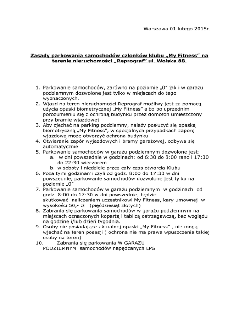Warszawa 01 lutego 2015r. Zasady parkowania samochodów członków klubu „My Fitness” na terenie nieruchomości „Reprograf” ul. Wolska 88. 1. Parkowanie samochodów, zarówno na poziomie „0” jak i w garażu podziemnym dozwolone jest tylko w miejscach do tego wyznaczonych. 2. Wjazd na teren nieruchomości Reprograf możliwy jest za pomocą użycia opaski biometrycznej „My Fitness” albo po uprzednim porozumieniu się z ochroną budynku przez domofon umieszczony przy bramie wjazdowej 3. Aby zjechać na parking podziemny, należy posłużyć się opaską biometryczną „My Fitness”, w specjalnych przypadkach zaporę wjazdową może otworzyć ochrona budynku 4. Otwieranie zapór wyjazdowych i bramy garażowej, odbywa się automatycznie 5. Parkowanie samochodów w garażu podziemnym dozwolone jest: a. w dni powszednie w godzinach: od 6:30 do 8:00 rano i 17:30 do 22:30 wieczorem b. w soboty i niedziele przez cały czas otwarcia Klubu 6. Poza tymi godzinami czyli od godz. 8:00 do 17:30 w dni powszednie, parkowanie samochodów dozwolone jest tylko na poziomie „0” 7. Parkowanie samochodów w garażu podziemnym w godzinach od godz. 8:00 do 17:30 w dni powszednie, będzie skutkować naliczeniem uczestnikowi My Fitness, kary umownej w wysokości 50,- zł (pięćdziesiąt złotych) 8. Zabrania się parkowania samochodów w garażu podziemnym na miejscach oznaczonych kopertą i tablicą ostrzegawczą, bez względu na godzinę i/lub dzień tygodnia. 9. Osoby nie posiadające aktualnej opaski „My Fitness” , nie mogą wjechać na teren posesji ( ochrona nie ma prawa wpuszczenia takiej osoby na teren) 10. Zabrania się parkowania W GARAZU PODZIEMNYM samochodów napędzanych LPG