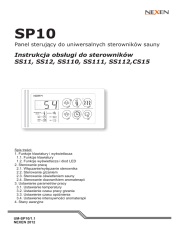 SP10 Panel sterujący do uniwersalnych sterowników sauny Instrukcja obsługi do sterowników SS11, SS12, SS110, SS111, SS112,CS15 Spis treści: 1. Funkcje klawiatury i wyświetlacza 1.1. Funkcje klawiatury 1.2. Funkcje wyświetlacza i diod LED 2. Sterowanie pracą 2.1. Włączanie/wyłączanie sterownika 2.2. Sterowanie grzaniem 2.3. Sterowanie oświetleniem sauny 2.4. Sterowanie dozownikiem aromaterapii 3. Ustawianie parametrów pracy 3.1. Ustawianie temperatury 3.2. Ustawienie czasu pracy grzania 3.3. Ustawienie czasu opóźnienia 3.4. Ustawienie intensywności aromaterapii 4. Stany awaryjne UM-SP10/1.1 NEXEN 2012 SP10 Instrukcja obsługi 1. Funkcje klawiatury i wyświetlacza 1.1. Funkcje klawiszy 1 1 3 5 L7 W1 L8 L1 L4 L5 L6 L2 L3 2 4 6 1.2. Funkcje wyświetlacza i diod LED W1 Wyświetlacz LED. W trakcie pracy wyświetlana jest temperatura zmierzona w saunie. Podczas ustawiania i podglądu parametrów wyświetlana jest wartość parametru. Wraz z wyświetlanym parametrem zapalana jest odpowiednia dioda sygnalizacyjna. W przypadku awarii wyświetlany jest kod błędu (E-1, E-2, E-3,E-4, E-5) L1 Dioda "temperature adjust" Sygnalizuje wyświetlanie temperatury ustawionej na wyświetlaczu LED. L2 Wprowadzanie - zmniejszanie wartości wyświetlanego parametru pracy sterownika. Dla sauny typu MIX wybór pieca (piec elektryczny lub promienniki). 3 Podgląd i ustawianie temperatury. Dla sauny z aromaterapią podgląd i ustawianie intensywności aromaterapii. 4 Przy wyłączonym grzaniu: podgląd i ustawianie czasu pracy sauny oraz czasu opóźnienia. Przy włączonym grzaniu: podgląd czasu jaki upłynął od włączenia grzania, ustawianie czasu opóźnienia. 5 Sterowanie grzaniem. Dioda "delay time" Sygnalizuje wyświetlanie na wyświetlaczu LED (zależnie od stanu pracy): migotanie szybkie - wyświetlany jest ustawiony czas opóźnienia migotanie wolne (1 sek.) - sygnalizuje aktywny tryb opóźnienia L4 2 Dioda "work time" Sygnalizuje wyświetlanie na wyświetlaczu LED (zależnie od stanu pracy): grzanie włączone - wyświetlany jest czas, jaki upłynął od włączenia grzania grzanie wyłączone - wyświetlany jest ustawiony czas pracy grzania L3 Wprowadzanie - zwiększanie wartości wyświetlanego parametru pracy sterownika. Dla sauny z aromaterapią załącza dozownik aromaterapii. 6 Sterowanie oświetleniem sauny. Dioda "aroma" Sygnalizuje wyświetlanie (zależnie od stanu pracy): migotanie - wyświetlana jest na wyświetlaczu LED wartość intensywności aromaterapii świecenie ciągłe - sygnalizuje włączenie aromaterapii L5 Dioda "EL" Dla sauny z piecem elektrycznym zapalona na stałe. Dla sauny MIX sygnalizuje wybór pieca elektrycznego. L6 Dioda "IR" Dla sauny z promiennikami podczerwieni zapalona na stałe. Dla sauny MIX sygnalizuje wybór promienników podczerwieni. L7 Dioda "hetaer" Sygnalizuje załączenie grzania sauny. L8 Dioda "light" Sygnalizuje załączenie oświetlenia sauny SP10 Instrukcja obsługi 2. Sterowanie pracą 2.1. Włączanie/wyłączanie sterownika W celu włączenia sterownika należy załączyć zasilanie główne, którego wyłącznik powinien być umieszczony w oddzielnej skrzynce sterującej. Po włączeniu zasilania należy ustawić parametry pracy sterownika oraz włączyć sterowania urządzeniami sauny. Po zakończeniu kąpieli należy wyłączyć zasilanie główne. Sterownik po wyłączeniu sterowania grzaniem oraz oświetlenia automatycznie po 10 minutach przechodzi w stan oczekiwania. Stan oczekiwania sygnalizowany jest zapaleniem kropki na wyświetlaczu LED. Aby wyjść z stanu oczekiwania należy nacisnąć dowolny klawisz. 2.2. Sterowanie grzaniem W celu załączenia grzania sauny należy: Üustawić temperaturę w saunie Üustawić czas pracy grzania Üustawić czas opóźnienia (dla trybu opóźnienie) Üwłączyć grzanie (dla trybu ręcznego) Ustawione parametry są zapisywane w pamięci wewnętrznej i nie wymagają ponownego wprowadzenia po wyłączeniu zasilania. Czas pracy grzania ograniczony jest do wartości ustawionej przez użytkownika. Po upływie ustawionego czasu grzania, piec wyłączany jest automatycznie. Stan załączenia grzania sygnalizowany jest przez zapalenie diody przy klawiszu sterującym.Włączanie grzania może odbywać się na dwa sposoby: tryb ręczny i tryb opóźnienie. Tryb ręczny heater. Włączenie grzania następuje ręcznie przez użytkownika za pomocą klawisza Tryb opóźnienie Włączenie grzania następuje automatycznie po upływie czasu opóźnienia. Czas opóźnienia ustawiany jest przez użytkownika i wynosi maksymalnie 12 godzin. Ustawianie trybu opóźnienie Aby uaktywnić tryb opóźnienia, należy ustawić czas opóźnienia większy heater. Aktywny tryb sygnalizowany jest od 00.0 i następnie nacisnąć klawisz migotaniem diody oraz diody przy klawiszu heater, sterownik odlicza ustawiony heater można w dowolnym momencie załączyć czas opóźnienia. Za pomocą klawisza grzanie sauny (przerwanie opóźnienia). Tryb opóźnienia może być automatycznie aktywowany po włączeniu zasilania, wymagane jest ustawienie parametru "Auto-Start" na wartość A-1 podczas konfigurowania sterownika. Wybór pieca: elektryczny / podczerwień (tylko dla sterownika w wersji MIX) mode. Wybrany piec Wyboru pieca dokonujemy za pomocą klawisza sygnalizowany jest przez zapalenie odpowiedniej diody LED: EL- wybrany piec elektryczny IR - wybrane promienniki podczerwieni Zmiany typu pieca można dokonać tylko przy wyłączonym grzaniu. 2.3. Sterowanie oświetleniem sauny Oświetlenie włączamy i wyłączamy za pomocą klawisza light. Stan załączenia sygnalizowany jest przez zapalenie diody przy klawiszu. 2.4. Sterowanie dozownikiem aromaterapii Sterowanie dozownikiem umożliwia załączanie pompy olejków aromatycznych w trakcie grzania.Pracę dozownika wybieramy za pomocą klawisza aroma. Wybór sygnalizowany jest przez zapalenie diody aroma. Po wybraniu dozownika włączany i wyłączany jest automatycznie 
