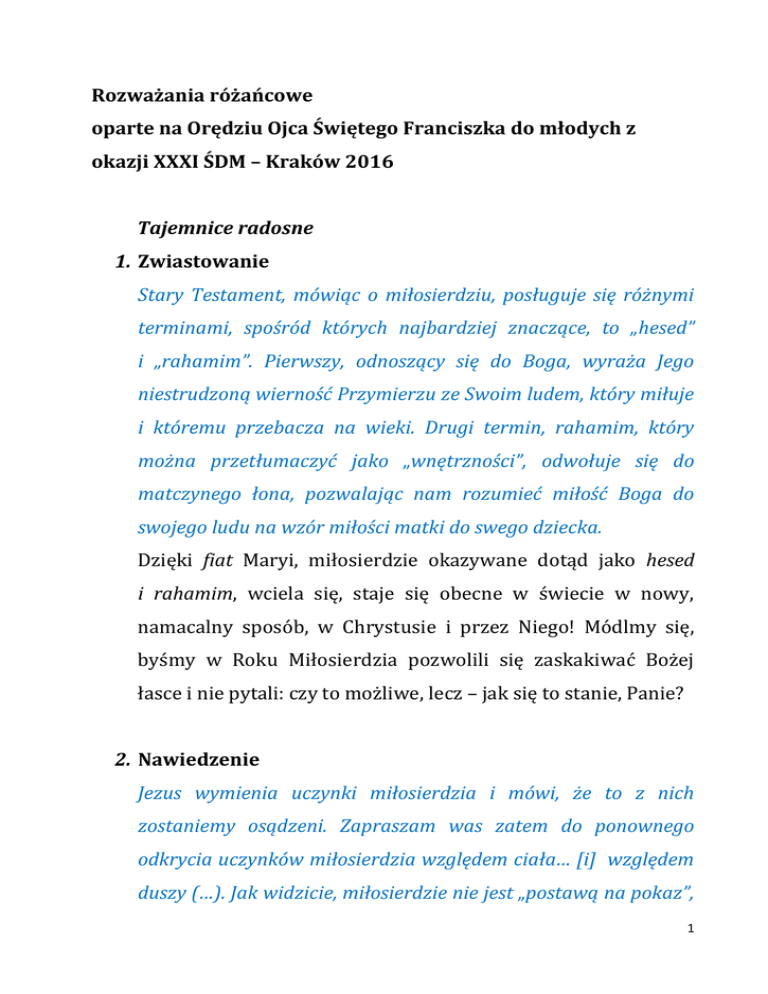 Rozważania różańcowe oparte na Orędziu Ojca Świętego Franciszka do młodych z okazji XXXI ŚDM – Kraków 2016 Tajemnice radosne 1. Zwiastowanie Stary Testament, mówiąc o miłosierdziu, posługuje się różnymi terminami, spośród których najbardziej znaczące, to „hesed” i „rahamim”. Pierwszy, odnoszący się do Boga, wyraża Jego niestrudzoną wierność Przymierzu ze Swoim ludem, który miłuje i któremu przebacza na wieki. Drugi termin, rahamim, który można przetłumaczyć jako „wnętrzności”, odwołuje się do matczynego łona, pozwalając nam rozumieć miłość Boga do swojego ludu na wzór miłości matki do swego dziecka. Dzięki fiat Maryi, miłosierdzie okazywane dotąd jako hesed i rahamim, wciela się, staje się obecne w świecie w nowy, namacalny sposób, w Chrystusie i przez Niego! Módlmy się, byśmy w Roku Miłosierdzia pozwolili się zaskakiwać Bożej łasce i nie pytali: czy to możliwe, lecz – jak się to stanie, Panie? 2. Nawiedzenie Jezus wymienia uczynki miłosierdzia i mówi, że to z nich zostaniemy osądzeni. Zapraszam was zatem do ponownego odkrycia uczynków miłosierdzia względem ciała… [i] względem duszy (…). Jak widzicie, miłosierdzie nie jest „postawą na pokaz”, 1 nie jest też zwykłym sentymentalizmem. Jest sprawdzianem autentyczności naszej postawy jako uczniów Jezusa, naszej wiarygodności jako chrześcijan we współczesnym świecie. Maryja spieszyła się do Elżbiety, gdyż chciała jej pomóc, usłużyć, towarzyszyć. Módlmy się, byśmy rozważając i praktykując uczynki miłosierdzia, czynili to zawsze z miłością, z Chrystusem, który – niczym w tabernakulum – upodobał sobie mieszkanie w ludzkim sercu. 3. Narodzenie W Nowym Testamencie jest mowa o Bożym Miłosierdziu (eleos), jako syntezie dzieła, dla którego Jezus przyszedł na świat, aby wypełnić je w imię Ojca. Największe objawienie Bożego Miłosierdzia dokonało się dzięki pośrednictwu Matki Najświętszej. Módlmy się, byśmy wsłuchując się w wolę Bożą, pozwolili Panu działać i posługiwać się nami, zwłaszcza w czasie przygotowań do Światowych Dni Młodzieży. Niech również przez nasze zaangażowanie będzie w świecie więcej Boga. 4. Ofiarowanie Pier Giorgio był młodzieńcem, który zrozumiał, co znaczy mieć serce miłosierne, wrażliwe na najbardziej potrzebujących. Ofiarowywał im o wiele więcej niż dary materialne, dawał samego siebie, poświęcał czas, słowa, zdolność słuchania. Służył 2 ubogim z wielką dyskrecją, nigdy się z tym nie obnosząc. Prawdziwie żył Ewangelią(…). Maryja i Józef przybyli do świątyni także po to, by powierzyć Jezusa, swój skarb, najwyższemu Bogu. Módlmy się o czyste i hojne serca, byśmy nie szczędzili czasu, sił i talentów, lecz zawierzając się Miłosiernemu, ofiarnie służyli tym, do których Pan nas posyła. 5. Odnalezienie Miałem pewność, że w osobie tego kapłana Bóg czekał na mnie, zanim jeszcze zrobiłem pierwszy krok w stronę kościoła. My Go poszukujemy, ale On nas zawsze uprzedza, szuka nas od zawsze i jako pierwszy nas odnajduje. Być może ktoś z was nosi w swoim sercu ciężar i myśli: zrobiłem to czy tamto… Nie bójcie się! On na was czeka! Gdy wydaje się nam, że Jezus gdzieś się zagubił – dobrze się rozejrzyjmy. Nie bójmy się też pytać o Niego krewnych czy znajomych, ludzi, którym ufamy. Módlmy się także, byśmy w każdych okolicznościach szukali Go uparcie i wytrwale, zwłaszcza w Kościele. Bóg jest zawsze u siebie, to tylko my czasem tracimy Go z oczu. 3 Tajemnice światła 1. Chrzest Jezusa Być może niektórzy z was zadają sobie pytanie: czym jest ów Rok Jubileuszowy obchodzony w Kościele? (…) co pięćdziesiąt lat Żydzi słyszeli rozbrzmiewający dźwięk rogu (jobel), który zwoływał ich (jobil) do obchodów roku świętego, jako czasu pojednania (jobal) dla wszystkich. W tym czasie należało odbudować, oparte na darmowości, dobre relacje z Bogiem, bliźnim i całym stworzeniem. Zachęcano więc, między innymi, do darowania długów, pomagania żyjącym w nędzy, naprawiania relacji międzyludzkich i uwalniania niewolników. Chrzest jest początkiem nowego życia, jest zanurzeniem w Bogu i Jego miłosierdziu, i bardzo ściśle wiąże się z misją. Jezus rozpoczyna swoją publiczną działalność właśnie od chrztu w Jordanie. Módlmy się, by święty czas jubileuszu stał się czasem pojednania i pomógł nam na nowo odczytać i podjąć misję jaką Pan każdemu powierza. 2. Cud w Kanie Spotykam wielu młodych, którzy mówią, że są zmęczeni życiem w tak bardzo podzielonym świecie, w którym ścierają się zwolennicy różnych poglądów, jest wiele wojen, a niektórzy używają nawet swojej religii do usprawiedliwienia przemocy. (…) Tak bardzo chciałbym, byśmy zjednoczyli się w chóralnej 4 modlitwie płynącej z głębi naszych serc, błagając Boga o miłosierdzie dla nas i całego świata! Czasem, nasze najlepsze nawet pomysły, piękne marzenia, nasza ciężka praca i trud – idą na marne. Wielkie dzieła wymagają poświęceń, ale bywa, że dochodzimy do ściany. Módlmy się, byśmy – jak Maryja – umieli te sytuacje pokornie pokazywać Jezusowi i mocno ufali, że On, nawet z największej porażki potrafi wyprowadzić najbardziej nieoczekiwane dobro. 3. Ogłaszanie Królestwa i wzywanie do nawrócenia Jezus Chrystus przyszedł, aby oznajmić i wypełnić czas łaski od Pana, przynosząc dobrą nowinę ubogim, uwolnienie więźniom, wzrok niewidomym i wolność uciśnionym (por. Łk 4,18-19). Głosząc Ewangelię, przebaczając, pełniąc Jego dzieła – nigdy nie jesteśmy sami. Przed nami idzie Jezus, który poprzedza nasze kroki, przygotowuje drogę. Módlmy się, by wszystkie starania jakie czynimy w przygotowaniach do ŚDM, nawróciły przede wszystkim nas samych. 4. Przemienienie Sam Kościół jest powołany do hojnego dzielenia si