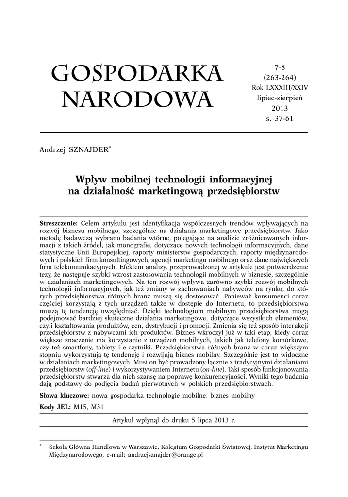 GOSPODARKA NARODOWA 7-8 (263-264) Rok LXXXIII/XXIV lipiec-sierpień 2013 s. 37-61 Andrzej SZNAJDER* Wpływ mobilnej technologii informacyjnej na działalność marketingową przedsiębiorstw Streszczenie: Celem artykułu jest identyfikacja współczesnych trendów wpływających na rozwój biznesu mobilnego, szczególnie na działania marketingowe przedsiębiorstw. Jako metodę badawczą wybrano badania wtórne, polegające na analizie zróżnicowanych informacji z takich źródeł, jak monografie, dotyczące nowych technologii informacyjnych, dane statystyczne Unii Europejskiej, raporty ministerstw gospodarczych, raporty międzynarodowych i polskich firm konsultingowych, agencji marketingu mobilnego oraz dane największych firm telekomunikacyjnych. Efektem analizy, przeprowadzonej w artykule jest potwierdzenie tezy, że następuje szybki wzrost zastosowania technologii mobilnych w biznesie, szczególnie w działaniach marketingowych. Na ten rozwój wpływa zarówno szybki rozwój mobilnych technologii informacyjnych, jak też zmiany w zachowaniach nabywców na rynku, do których przedsiębiorstwa różnych branż muszą się dostosować. Ponieważ konsumenci coraz częściej korzystają z tych urządzeń także w dostępie do Internetu, to przedsiębiorstwa muszą tę tendencję uwzględniać. Dzięki technologiom mobilnym przedsiębiorstwa mogą podejmować bardziej skuteczne działania marketingowe, dotyczące wszystkich elementów, czyli kształtowania produktów, cen, dystrybucji i promocji. Zmienia się też sposób interakcji przedsiębiorstw z nabywcami ich produktów. Biznes wkroczył już w taki etap, kiedy coraz większe znaczenie ma korzystanie z urządzeń mobilnych, takich jak telefony komórkowe, czy też smartfony, tablety i e-czytniki. Przedsiębiorstwa różnych branż w coraz większym stopniu wykorzystują tę tendencję i rozwijają biznes mobilny. Szczególnie jest to widoczne w działaniach marketingowych. Musi on być prowadzony łącznie z tradycyjnymi działaniami przedsiębiorstw (off-line) i wykorzystywaniem Internetu (on-line). Taki sposób funkcjonowania przedsiębiorstw stwarza dla nich szansę na poprawę konkurencyjności. Wyniki tego badania dają podstawy do podjęcia badań pierwotnych w polskich przedsiębiorstwach. Słowa kluczowe: nowa gospodarka technologie mobilne, biznes mobilny Kody JEL: M15, M31 Artykuł wpłynął do druku 5 lipca 2013 r. * Szkoła Główna Handlowa w Warszawie, Kolegium Gospodarki Światowej, Instytut Marketingu Międzynarodowego, e-mail: [email protected] 38 GOSPODARKA NARODOWA Nr 7-8/2013 Wprowadzenie Wiek XXI charakteryzuje się szybkimi i istotnymi zmianami w otoczeniu przedsiębiorstw, wpływającymi na sposoby ich funkcjonowania i koniecznością dostosowania się do nich zarządzania dotyczącego wszystkich funkcji przedsiębiorstw – produkcji, zaopatrzenia, zarządzania zasobami ludzkimi, badań i rozwoju, marketingu i sprzedaży. Szczególnie dotyczy to marketingu, dlatego też artykuł koncentruje się na wpływie mobilnych technologii informacyjnych na działania marketingowe przedsiębiorstw. Niniejszy artykuł ma zrealizować jeden z celów, jaki stawia się nauce – cel poznawczy, polegający na dążeniu do wyjaśnianiu zjawisk w przedmiocie badawczym. Jest nim w tym przypadku przedstawienie wpływu nowych technologii informacyjnych, czyli rozwoju technologii mobilnych, na działalność przedsiębiorstw. Aby ten cel zrealizować, została dokonana identyfikacja współczesnych trendów wpływających na rozwój biznesu mobilnego. Główna uwaga została poświęcona trendom w technologii i w zachowaniach nabywczych konsumentów, które sprzyjają, czy nawet wymuszają zmianę w funkcjonowaniu przedsiębiorstw. Artykuł ma udowodnić tezę, że obecnie coraz większe znaczenie ma korzystanie z urządzeń mobilnych, takich jak telefony komórkowe, czy też smartfony, tablety i e-czytniki. Ponieważ konsumenci coraz częściej korzystają z tych urządzeń także w dostępie do Internetu, to przedsiębiorstwa muszą tę tendencję uwzględniać, szczególnie w swych działaniach marketingowych. Dzięki technologiom mobilnym przedsiębiorstwa mogą podejmować bardziej skuteczne działania marketingowe, dotyczące wszystkich elementów, czyli kształtowania produktów, cen, dystrybucji i promocji. Zmienia się też sposób interakcji przedsiębiorstw z nabywcami ich produktów [ReportBoston Consulting Group, 2012]. Dzięki technologii mobilnej powstaje też szansa na obniżenie kosztów przedsiębiorstw i w ten sposób zwiększenie konkurencyjności cenowej tych, którzy potrafią ją wykorzystać najlepiej. Ta sytuacja wynika także z trendów konsumenckich, z zachowania się konsumentów na rynku. Tezą artykułu jest także stwierdzenie, że współcześnie mobilne technologie informacyjne bardzo silnie wpływają na biznes i musi on być prowadzony łącznie z tradycyjnymi działaniami przedsiębiorstw (off-line) i wykorzystywaniem Internetu (on-line). Często stosuje się obrazowe określenie, że współczesny biznes jest prowadzony z wykorzystaniem trzech ekranów – telewizora (tradycyjne działania biznesowe), komputera (wykorzystanie Internetu) i urządzeń mobilnych. Metodą badawczą, przyjętą do weryfikacji tezy jest metoda badań wtórnych, polegająca na analizie zróżnicowanych informacji z takich źródeł, jak monografie, dotyczące nowych technologii informacyjnych, dane statystyczne Unii Europejskiej, raporty ministerstw gospodarczych, raporty międzynarodowych i polskich firm konsultingowych, agencji marketingu mobilnego oraz dane największych firm telekomunikacyjnych. Andrzej Sznajder, Wpływ mobilnej technologii informacyjnej... 39 Jeśli teza artykułu się potwierdzi, to będzie to wskazywało na niezbędne kierunki badań nad znaczeniem biznesu mobilnego w polskiej gospodarce, a dla autora artykułu będzie stanowiło podstawę do kontynuowania analizy wpływu informacyjnych techn