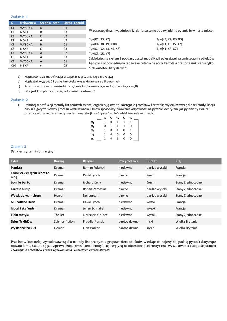 przedstawiono reprezentację macierzową relacji: zbiór pytań – zbiór obiektów relewantnych: