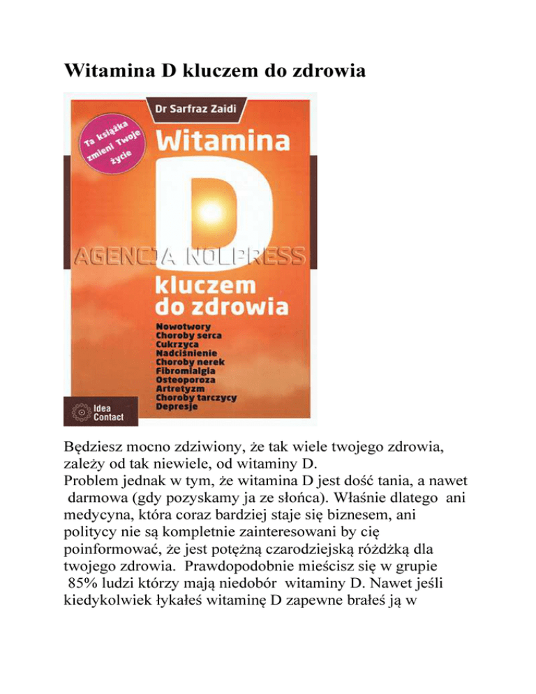 Witamina D kluczem do zdrowia Będziesz mocno zdziwiony, że tak wiele twojego zdrowia, zależy od tak niewiele, od witaminy D. Problem jednak w tym, że witamina D jest dość tania, a nawet darmowa (gdy pozyskamy ja ze słońca). Właśnie dlatego ani medycyna, która coraz bardziej staje się biznesem, ani politycy nie są kompletnie zainteresowani by cię poinformować, że jest potężną czarodziejską różdżką dla twojego zdrowia. Prawdopodobnie mieścisz się w grupie 85% ludzi którzy mają niedobór witaminy D. Nawet jeśli kiedykolwiek łykałeś witaminę D zapewne brałeś ją w zalecanych oficjalnie dawkach, które jak się teraz okazuje są wielokrotnie za małe i właśnie dlatego nie przynosiły efektu. Dzięki niniejszej prawdopodobnie jedynej w Polsce książce o witaminie D, będziesz mógł skorzystać z rad amerykańskiego lekarza Sarfraz Zaidi, który od lat skutecznie leczy tysiące pacjentów właśnie uzupełniając niedoborów witaminy D. Prawdopodobnie nigdy nie będziesz w stanie udać się do niego z wizytą osobiście, ale to on pomyślał o tobie i napisał tę książkę. Czy masz może symptomy niedoboru Witaminy D? Wszyscy wiedzą, że witamina D zapobiega krzywicy u dzieci, ale mało kto jest zorientowany, że nie przestaje być potrzebna u dorosłych, zabezpieczając ich przed chorobami serca, rakiem piersi czy jelit. Według ogromnej ilości badań witamina D przeciwdziała nadciśnieniu, cukrzycy, astmie, przedwczesnym urodzeniom, autyzmowi, reumatoidalnemu zapaleniu stawów, osteoporozie, chorobom autoimmunologicznym, infekcjom, gruźlicy, PMS, migrenom, krótkowzroczności, depresjom, chorobie Alzheimera a nawet otyłości. Czy jakikolwiek dentysta zalecił ci kiedykolwiek, byś sprawdził poziom witaminy D, skoro psują ci się zęby? Spośród 30 000 naszych genów witamina D ma wpływ aż na 2000! Bierze udział w 200 różnych reakcjach chemicznych w organizmie. Znaleziono ją prawie w każdym typie komórek ludzkiego ciała i w każdej ludzkiej tkance. Amerykański magazyn Time oszacował, że witamina D jest jednym z 10 największych przełomów w medycynie. Wielu jednak uważa, że powinno się postawić ją na pierwszym miejscu – jako najbardziej kluczową dla życia i zdrowia ludzi. Czy wiesz, że tylko w jednym 2012 roku na całym świecie opublikowano ponad 3000 artykułów medycznych świadczących o niezwykle pożytecznej roli witaminy D? Niestety, większość ludzi nie tylko nie wie o dobroczynnym wpływie witaminy D, ale, co gorsze, nie zdaje sobie sprawy, że ma jej ostry niedobór. To zastanawiające, że gdy kilka osób zmarło na świńską grypę, WHO błyskawicznie ogłosiło epidemię i nagłośniło ją we wszystkich głównych mediach, ale gdy 85 procent ludzi w krajach rozwiniętych cierpi z powodu niedoboru witaminy D – totalna cisza. Przecież właśnie to jest prawdziwą epidemią! Gdyby w krajach rozwiniętych każdy człowiek choć na 15 minut dziennie wystawił się w stroju kąpielowym na słońce, to liczba samych tylko nowotworów i zawałów serca zmalałaby aż o 600 000 rocznie. Pomyślmy – media całego świata z namaszczeniem nagłośniły strzelaninę w amerykańskim kinie, gdzie zginęło kilka osób, a jednocześnie milczą, gdy niepotrzebnie umiera kilkaset tysięcy ludzi rocznie. Mało tego, te same media straszą nas słońcem, które przecież produkuje na naszej skórze witaminę D. Straszą nas dziurą ozonową, zaćmą na oczach itd., zamiast informować o korzyściach płynących z opalania. Czy zwróciłeś uwagę, że telewizyjne i radiowe programy zawsze biadolą, że brakuje pieniędzy na leki, ale nigdy nie narzekają, że nie poszedłeś na 15 minutowe opalanie? Czy dostrzegasz, jak bardzo byłeś trzymany w ciemności, w przenośni i dosłownie? Niestety, prawda jest taka, że zapomniano albo zatajono ten cudowny środek z prostego powodu – przez kilka miesięcy w roku jest darmowy, gdyż pochodzi ze Słońca i nikt nie może na tym zarobić. Na przykład w bardziej niż Polska nasłonecznionym USA aż 70 procent ludzi cierpi na chroniczny niedobór witaminy D, a kobiety w ciąży aż w 80 procentach. Czy sądzisz, że w mniej nasłonecznionej Polsce mamy lepszą sytuację? Czy może znasz swój poziom witaminy D? Czy kiedykolwiek słyszałeś o tym, że można zbadać poziom tej witaminy we krwi? Albo czy słyszałeś, że ktoś słyszał, że można to zbadać? Tymczasem w całym twoim życiu może to być najbardziej opłacalne badanie dla twojego zdrowia. Tej wiedzy nie da się już dłużej ukrywać ani zatrzymać. Dzięki książce, którą trzymasz w ręku, masz szansę być jednym z pierwszych, którzy zrozumieją, dlaczego witamina D jest czarodziejską różdżką dla naszego organizmu”.