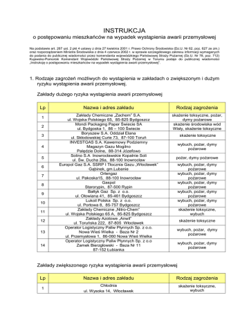 INSTRUKCJA o postępowaniu mieszkańców na wypadek wystąpienia awarii przemysłowej Na podstawie art. 267 ust. 2 pkt 4 ustawy z dnia 27 kwietnia 2001 r. Prawo Ochrony Środowiska (Dz.U. Nr 62, poz. 627 ze zm.) oraz rozporządzeniem Ministra Środowiska z dnia 4 czerwca 2002 r. w sprawie szczegółowego zakresu informacji wymaganych do podania do publicznej wiadomości przez komendanta wojewódzkiego Państwowej StraŜy PoŜarnej (Dz.U. Nr 78, poz. 712) Kujawsko-Pomorski Komendant Wojewódzki Państwowej StraŜy PoŜarnej w Toruniu podaje do publicznej wiadomości „Instrukcję o postępowaniu mieszkańców na wypadek wystąpienia awarii przemysłowej”. 1. Rodzaje zagroŜeń moŜliwych do wystąpienia w zakładach o zwiększonym i duŜym ryzyku wystąpienia awarii przemysłowej. Zakłady duŜego ryzyka wystąpienia awarii przemysłowej Lp 1 2 3 4 5 6 7 8 9 10 11 12 13 14 Nazwa i adres zakładu Rodzaj zagroŜenia Zakłady Chemiczne „Zachem” S.A. ul. Wojska Polskiego 65, 85-825 Bydgoszcz Mondi Packaging Paper Świecie SA ul. Bydgoska 1, 86 – 100 Świecie Boryszew S.A. Oddział Elana ul. Skłodowskiej Curie 73, 87-100 Toruń INVESTGAS S.A. Kawernowy Podziemny Magazyn Gazu Mogilno Palędzie Dolne, 88-314 Józefowo Solino S.A Inowrocławskie Kopalnie Soli ul. Św. Ducha 26a, 88-100 Inowrocław Europol Gaz S.A. SSRP I Tłocznia Gazu „Włocławek” Gąbinek, gm.Lubanie Orlengaz ul. Pakoska15, 88-100 Inowrocław Gaspol Starorypin, 87-500 Rypin Bałtyk Gaz Sp. z o.o. ul. Ołowiana 41, 85-461 Bydgoszcz Lukoil Polska Sp. z o.o. ul. Portowa 8, 85-757 Bydgoszcz Zakłady Chemiczne „Nitro-Chem” ul. Wojska Polskiego 65 A, 85-825 Bydgoszcz Zakłady Azotowe „Anwil” ul. Toruńska 222, 87-805 Włocławek Operator Logistyczny Paliw Płynnych Sp. z o.o. Nowa Wieś Wielka - Baza Nr 2 ul. Przemysłowa 1, 86-060 Nowa Wieś Wielka Operator Logistyczny Paliw Płynnych Sp. z o.o Zamek Bierzgłowski - Baza Nr 11 87-152 Łubianka skaŜenie toksyczne, poŜar, dymy poŜarowe skaŜenie środowiska wód Wisły, skaŜenie toksyczne skaŜenie toksyczne wybuch, poŜar, dymy poŜarowe poŜar, dymy poŜarowe wybuch, poŜar, dymy poŜarowe wybuch, poŜar, dymy poŜarowe wybuch, poŜar, dymy poŜarowe wybuch, poŜar, dymy poŜarowe wybuch, poŜar, dymy poŜarowe skaŜenie toksyczne, wybuch skaŜenie toksyczne wybuch, poŜar, dymy poŜarowe wybuch, poŜar, dymy poŜarowe Zakłady zwiększonego ryzyka wystąpienia awarii przemysłowej Lp Nazwa i adres zakładu Rodzaj zagroŜenia 1 Chłodnia ul. Wysoka 14, Włocławek skaŜenie toksyczne, wybuch 2 3 4 5 6 7 8 9 10 11 Polmos ul. Olbrachta 14/16, 87-100 Toruń Natural Chemical Products ul. Wojska Polskiego 65, Bydgoszcz Linde Gaz Sp. z o.o. ul. Chemiczna 1, Bydgoszcz Zakłady Tłuszczowe „Kruszwica” S.A. ul. Niepodległości 42, 88-150 Kruszwica Huta Szkła Gospodarczego „IRENA” S.A. Inowrocław Elana - Energetyka ul. M.C.Skłodowskiej 73, 87-100 Toruń MD Projekt ul.Wojska Polskiego 65 a, Bydgoszcz Suszarnia i magazyn zboŜa w Szarleju Szarlej 18, 88-150 Inowrocław Rozlewnia Gazu Płynnego „OILGAZ” - Zdziarsko 1a, Gm. Łabiszyn PURINOVA Spółka z o.o. ul. Wojska Polskiego 65, 85-825 Bydgoszcz skaŜenie toksyczne, poŜar, dymy poŜarowe skaŜenie toksyczne, poŜar, dymy poŜarowe wybuch, poŜar, dymy poŜarowe skaŜenie toksyczne, poŜar, dymy poŜarowe skaŜenie toksyczne skaŜenie toksyczne, poŜar, dymy poŜarowe skaŜenie toksyczne, poŜar, dymy poŜarowe wybuch, poŜar, dymy poŜarowe wybuch, poŜar, dymy poŜarowe skaŜenie toksyczne, poŜar, dymy poŜarowe 2. Sposoby powiadamiania i alarmowania mieszkańców na wypadek wystąpienia zagroŜenia. a) syrena alarmowa - alarm o skaŜeniach: dźwięk syreny 10 sekund z przerwami 15-25 sekund przez 3 min, - alarm o klęskach Ŝywiołowych i zagroŜeniu środowiska: ciągły dźwięk przez 3 minuty, - odwołanie alarmu: dźwięk ciągły trwający 3 minuty b) przy pomocy rozgłośni radiowych, telewizyjnych, radiofonii przewoźnej i megafonów - powtarzana trzykrotnie zapowiedź słowna: UWAGA, UWAGA, UWAGA ! Ogłaszam alarm o skaŜeniach (podana nazwa skaŜenia i lokalizacja) lub inne np. UWAGA, UWAGA, UWAGA ! Osoby znajdujące się na terenie … około godziny …, minut … moŜe nastąpić skaŜenie (podana nazwa skaŜenia i lokalizacja), UWAGA, UWAGA, UWAGA ! Odwołuję alarm o skaŜeniach dla … (podana nazwa skaŜenia i lokalizacja) c) przy pomocy systemów teleinformacyjnych - telefonia cyfrowa: SMS (Short Message Service) - radiofonia: RDS (Radio Data System) - telewizja: telegazeta - portale internetowe, w tym strona KW PSP Toruń – www.kujawy.psp.gov.pl d) inne - dzwony kościelne lub inne: szybkie uderzenia w ciągu 3 minut 3. Sposoby zachowania się mieszkańców na wypadek wystąpienia zagroŜenia Po usłyszeniu sygnału o skaŜeniach: Nie zbliŜać się do rejonu zagroŜenia ! Przebywając na terenie otwartym: - zwrócić uwagę na kierunek wiatru, - opuścić zagroŜony teren prostopadle do kierunku wiatru, - postępować zgodnie z poleceniami zawartymi w komunikatach radiowych, telewizyjnych lub przekazywanych w inny sposób, - chronić drogi oddechowe, wykonać filtr ochronny z dostępnych materiałów. Przebywając w pomieszczeniu, domu, biurze, sklepie itd.: - zabrać do mieszkań dzieci i osoby niepełnosprawne, a zwierzęta gospodarcze zamknąć w ich pomieszczeniach, - zawiadomić sąsiadów, - włączyć telewizor lub radioodbiornik na częstotliwość stacji lokalnej, - bezwzględnie wykonać przekazywane polecenia wydawane przez lokalne władze lub słuŜby ratownicze, - wygasić i nie uŜywać otwartych źródeł ognia (junkersy, piece, papierosy itp.), - uszczelnić otwory okienne i wentylacyjne oraz drzwi mokrym papierem, tkaniną lub okleić taśmą klejącą, - przygotować środki ochrony dróg oddechowych, wykonać filtr ochronny z dostępnych materiałów (zwilŜona w wodzie lub w wodnym roztworze sody oczyszczonej chusteczka, tampon, ręcznik, szalik itp.) oraz