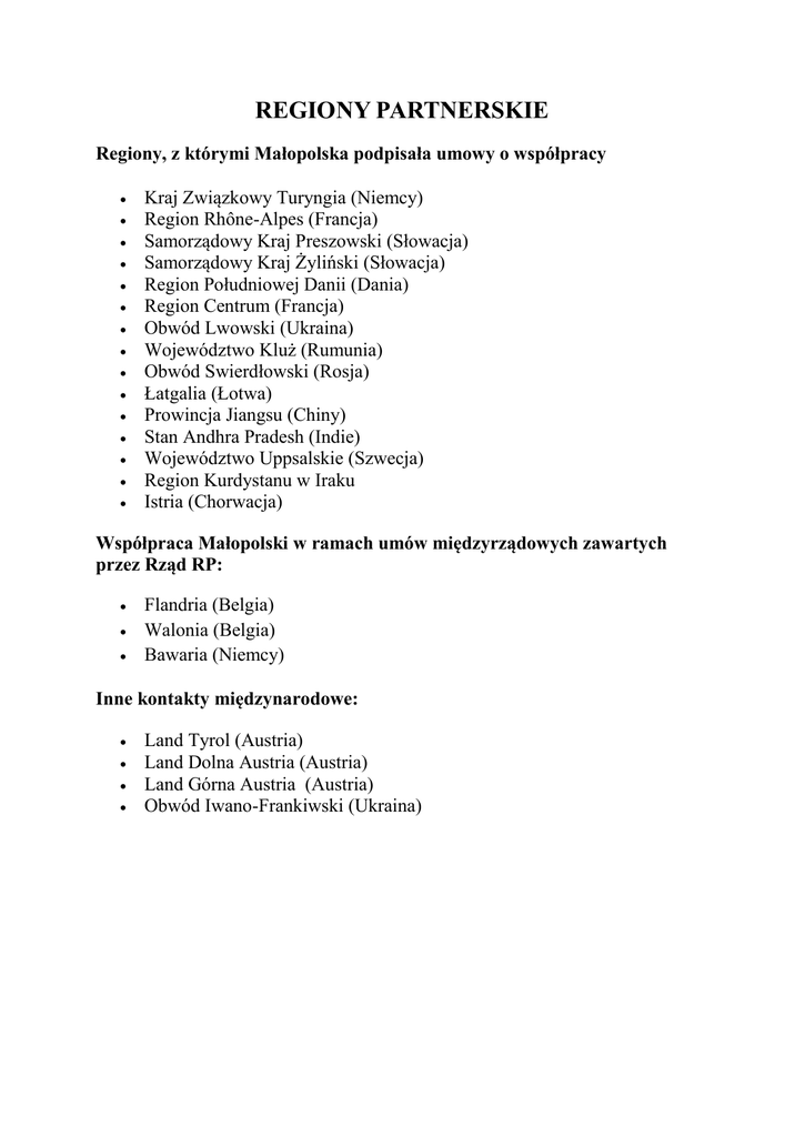 REGIONY PARTNERSKIE Regiony, z którymi Małopolska podpisała umowy o współpracy Kraj Związkowy Turyngia (Niemcy) Region Rhône-Alpes (Francja) Samorządowy Kraj Preszowski (Słowacja) Samorządowy Kraj Żyliński (Słowacja) Region Południowej Danii (Dania) Region Centrum (Francja) Obwód Lwowski (Ukraina) Województwo Kluż (Rumunia) Obwód Swierdłowski (Rosja) Łatgalia (Łotwa) Prowincja Jiangsu (Chiny) Stan Andhra Pradesh (Indie) Województwo Uppsalskie (Szwecja) Region Kurdystanu w Iraku Istria (Chorwacja) Współpraca Małopolski w ramach umów międzyrządowych zawartych przez Rząd RP: Flandria (Belgia) Walonia (Belgia) Bawaria (Niemcy) Inne kontakty międzynarodowe: Land Tyrol (Austria) Land Dolna Austria (Austria) Land Górna Austria (Austria) Obwód Iwano-Frankiwski (Ukraina)