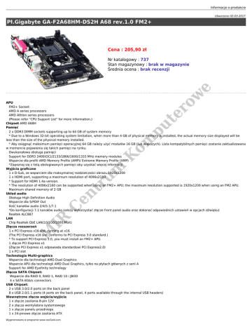 Informacje o produkcie Utworzono 02-03-2017 Pł.Gigabyte GA-F2A68HM-DS2H A68 rev.1.0 FM2+ Cena : 205,90 zł ow e Nr katalogowy : 737 Stan magazynowy : brak w magazynie Średnia ocena : brak recenzji M IR C en tr um K om pu te r APU FM2+ Socket: AMD A series processors AMD Athlon series processors (Please refer "CPU Support List" for more information.) Chipset AMD A68H Pamięć 2 x DDR3 DIMM sockets supporting up to 64 GB of system memory * Due to a Windows 32-bit operating system limitation, when more than 4 GB of physical memory is installed, the actual memory size displayed will be less than the size of the physical memory installed. * Aby osiągnąć maksimum pamięci operacyjnej 64 GB należy użyć modułów 16 GB (lub większych). Lista kompatybilnych pamięci zostanie zaktualizowana w momencie pojawienia się takich pamięci na rynku. Dwukanałowa obsługa pamięci Support for DDR3 2400(OC)/2133/1866/1600/1333 MHz memory modules Wsparcie dla profili AMD Memory Profile (AMP)/ Extreme Memory Profile (XMP) *Zapoznaj się z listą obsługiwanych pamięci aby uzyskać więcej informacji Wyjścia graficzne 1 x D-Sub, ze wsparciem dla maksymalnej rozdzielczości obrazu 1920x1200 1 x HDMI port, supporting a maximum resolution of 4096x2160 * Support for HDMI 1.4a version. * The resolution of 4096x2160 can be supported when using an FM2+ APU; the maximum resolution supported is 1920x1200 when using an FM2 APU. Maximum shared memory of 2 GB Układ audio Obsługa High Definition Audio Wsparcie dla S/PDIF Out Ilość kanałów audio 2/4/5.1/7.1 *Do konfiguracji 7.1 kanałów audio należy wykorzystać złącze front panel audio oraz dokonać odpowiednich ustawień w opcjach dźwięku) Realtek ALC887 LAN Chip Realtek GbE LAN(10/100/1000 Mbit) Złącza rozszerzeń 1 x PCI Express x16 slot, running at x16 (The PCI Express x16 slot conforms to PCI Express 3.0 standard.) * To support PCI Express 3.0, you must install an FM2+ APU. 1 złącze PCI Express x1 (Złącze PCI Express x1 odpowiada standardowi PCI Express2.0) 1 x PCI slot Technologia Multi-graphics Wsparcie dla technologii AMD Dual Graphics Wsparcie APU dla technologii AMD Dual Graphics, tylko na płytach głównych z serii A Support for AMD Eyefinity technology Złącza SATA Chipset: Wsparcie dla RAID 0, RAID 1, RAID 10 i JBOD 4 x SATA 6Gb/s connectors USB Chipset: 2 x USB 3.0/2.0 ports on the back panel 8 x USB 2.0/1.1 ports (4 ports on the back panel, 4 ports available through the internal USB headers) Wewnętrzne złącza wejścia/wyjścia 1 x złącze zasilania 8-pin 12V 2 x złącza wentylatora systemowego 1 x złącze panelu przedniego 1 x 24-pinowe złącze zasilania ATX Wygenerowano w programie www.oscGold.com M IR C en tr um K e ow om pu te r 1 x złącze front panel audio 4 złącza SATA 6Gb/s 2 x złącza USB 2.0/1.1 1 x złącze wentylatora APU 1 x złącze pinowe Clear CMOS 1 x złącze pinowe S/PDIF Out Złącza wejścia/wyjścia na tylnym panelu 4 x USB 2.0/1.1 ports 2 x USB 3.0/2.0 ports 1 x LPT 1 x HDMI port 1 x port szeregowy 1 x port RJ-45 1 x port klawiatury/myszy PS/2 1 x port D-Sub 3 x audio jacks (Line In, Line Out, Mic In) Kontroler I/O iTE I/O Controller Chip Monitoring sprzętowy Ostrzeżenie awarii wentylatora APU/Systemu Ostrzeżenie przed przegrzaniem APU Monitoring napięć zasilania Monitoring temperatury APU/Systemu Kontrola prędkości wentylatora APU/Systemu APU/System fan speed control * Whether the fan speed control function is supported will depend on the cooler you install. BIOS 2 x 64-Mbitowe układy pamięci flash Wsparcie dla technologii DualBIOS Use of licensed AMI UEFI BIOS PnP 1.0a, DMI 2.7, WfM 2.0, SM BIOS 2.7, ACPI 5.0 Inne funkcje Obsługa Q-Flash wsparcie dla Xpress Install Support for @BIOS Obsługa ON/OFF Charge Obsługa EasyTune * Dostępne funkcje programu EasyTune mogą się różnić w zależności od modelu płyty głównej. Wsparcie dla Smart Recovery 2 Pakiet oprogramowania Norton Internet Security (wersja OEM) System operacyjny Support for Windows XP 32-bit Support for Windows 8.1/7 32-bit/64-bit * It requires Service Pack 3 to support Windows XP driver installation. * To support Windows XP 32-bit, you must install an AMD FM2+ Kaveri APU. Wymiary Micro ATX Form Factor; 22.6cm x 18.2cm