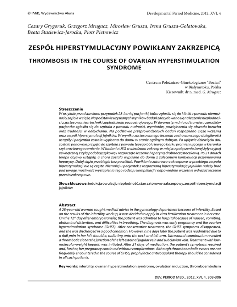 © IMiD, Wydawnictwo Aluna Developmental Period Medicine, 2012, XVI,303 4 Cezary Grygoruk, Grzegorz Mrugacz, Mirosław Grusza, Irena Grusza-Golatowska, Beata Stasiewicz-Jarocka, Piotr Pietrewicz ZESPÓŁ HIPERSTYMULACYJNY POWIKŁANY ZAKRZEPICĄ THROMBOSIS IN THE COURSE OF OVARIAN HYPERSTIMULATION SYNDROME Centrum Położniczo-Ginekologiczne “Bocian” w Białymstoku, Polska Kierownik: dr n. med. G. Mrugacz Streszczenie W artykule przedstawiono przypadek 28-letniej pacjentki, która zgłosiła się do kliniki z powodu niemożności zajścia w ciążę. Na podstawie uzyskanych wyników badań zdecydowano się na leczenie niepłodności z zastosowaniem techniki zapłodnienia pozaustrojowego. W dwunastym dniu od transferu zarodków pacjentka zgłosiła się do szpitala z powodu nudności, wymiotów, powiększenia się obwodu brzucha oraz trudności w oddychaniu. Na podstawie przeprowadzonych badań rozpoznano ciążę wczesną oraz zespół hiperstymulacji jajników. W wyniku zastosowanego leczenia zachowawczego dolegliwości ustąpiły i pacjentka została wypisana do domu w stanie ogólnym dobrym. Po upływie dziewięciu dni, została ponownie przyjęta do szpitala z powodu tępego bólu lewego barku promieniującego w kierunku szyi oraz lewego ramienia. W badaniu USG stwierdzono zakrzep w miejscu połączenia lewej żyły szyjnej zewnętrznej z żyłą podobojczykową i rozpoczęto leczenie heparyną drobnocząsteczkową. Po 21 dniach terapii objawy ustąpiły, a chora została wypisana do domu z zaleceniem kontynuacji przyjmowania heparyny. Dalej ciąża przebiegła bez powikłań. Powikłania zatorowo-zakrzepowe w przebiegu zespołu hiperstymulacji nie są częste. Niemniej u pacjentek z rozpoznaną hiperstymulacją jajników należy brać pod uwagę możliwość wystąpienia tego rodzaju komplikacji i odpowiednio wcześnie wdrażać leczenie przeciwzakrzepowe. Słowa kluczowe: indukcja owulacji, niepłodność, stan zatorowo-zakrzepowy, zespół hiperstymulacji jajników Abstract A 28-year-old woman sought medical advice in the gynecology department because of infertility. Based on the results of the infertility workup, it was decided to apply in vitro fertilization treatment in her case. On the 12th day after embryo transfer, the patient was admitted to hospital because of nausea, vomiting, abdominal distention, and difficulties in breathing. The diagnosis was early pregnancy and the ovarian hyperstimulation syndrome (OHSS). After conservative treatment, the OHSS symptoms disappeared, and she was discharged in a good condition. However, nine days later the patient was readmitted due to a dull pain in her left shoulder, radiating onto the neck and left arm. Ultrasound examination revealed a thrombotic clot at the junction of the left external jugular vein and subclavian vein. Treatment with lowmolecular-weight heparin was initiated. After 21 days of medication, the patient’s symptoms resolved and, further, her pregnancy continued without complications. Although thromboembolic events are not frequently encountered in the course of OHSS, prophylactic anticoagulant therapy should be considered in all such patients. Key words: infertility, ovarian hyperstimulation syndrome, ovulation induction, thromboembolism DEV. PERIOD MED., 2012, XVI, 4, 303306 304 Cezary Grygoruk i wsp. WSTĘP Zespół hiperstymulacji jajników (ang. Ovarian Hyperstimulation Syndrome; OHSS) jest najpoważniejszym powikłaniem indukcji jajeczkowania, potencjalnie zagrażającym życiu pacjentki (1). U podstaw patofizjologii OHSS leży wzrost przepuszczalności naczyń krwionośnych na skutek zwiększonego wydzielania przez jajniki szeregu wazoaktywnych substancji, w tym: czynnika wzrostu śródbłonka naczyń (VEGF), angiotensyny, histaminy, insulinopodobnego czynnika wzrostu 1 (IGF-1), naskórkowego czynnika wzrostu (EGF), interleukin oraz prostaglandyn (2-5). Ryzyko wystąpienia OHSS wzrasta u pacjentek młodych (poniżej 30 roku życia), cierpiących na alergię, z niską masą ciała, z policystycznymi jajnikami, z OHSS w wywiadzie oraz wysokim stężeniem estradiolu (E2) w surowicy na koniec stymulacji jajeczkowania. Stężenie E2 pomiędzy 3500-6000 pg/mL sprzyja wystąpieniu tego powikłania u 1,5% kobiet, natomiast powyżej 6000 pg/mL – u 38% pacjentek. Ponadto, ryzyko wystąpienia OHSS jest od dwóch do pięciu razy wyższe w przypadku uzyskania ciąży (6, 7). Nasilenie objawów klinicznych, zmian biochemicznych oraz ultrasonograficznych towarzyszących OHSS, stało się podstawą do zaproponowania podziału OHSS na kategorie kliniczne oraz stopnie zaawansowania (8-11). Częstotliwość występowania ciężkiej postaci OHSS określa się na 0,2-3% leczonych, a w obrazie klinicznym dominują: powiększenie się jajników z rozwojem torbieli, gromadzenie się płynu w jamie otrzewnowej, osierdziu i opłucnej oraz duszność. W badaniach dodatkowych stwierdza się hemokoncentrację, hipowolemię, zaburzenia gospodarki wodno-elektrolitowej i kwasowo-zasadowej (2, 3). Pogorszeniu ulegają biochemiczne wykładniki funkcji wątroby i nerek. Niekiedy dochodzi do uaktywnienia się mechanizmów wykrzepiania śródnaczyniowego z rozwojem najcięższego powikłania jakim jest tworzenie zakrzepów i zatorów (12-14). Przedstawiamy opis takiego przypadku. OPIS PRZYPADKU Dwudziestoośmioletnia pacjentka zgłosiła się do kliniki z powodu niemożności zajścia w ciążę pomimo trzyletnich starań. Pacjentka miesiączkowała nieregularnie co 21-40 dni. Badania hormonalne wykonane w 4 dniu cyklu miesięcznego wykazały: folikulotropina (FSH) – 5 IU/mL [norma: 3-12 mIU/mL], lutropina (LH) – 8,4 IU/ ml [norma: 2-13 mIU/mL], E2 – 81,9 pg/mL [norma: 12,5-166 pg/mL], testosteron (T) – 0,78 ng/mL [norma: 0,2-0,8 ng/mL]. W ultrasonografii (USG) narządu rodnego stwierdzono jajniki policystyczne. W badaniu nasienia męża pacjentki stwierdzono oligoastenoteratozoospermię. Z wywiadu wynikało, iż w wieku 20 lat choro