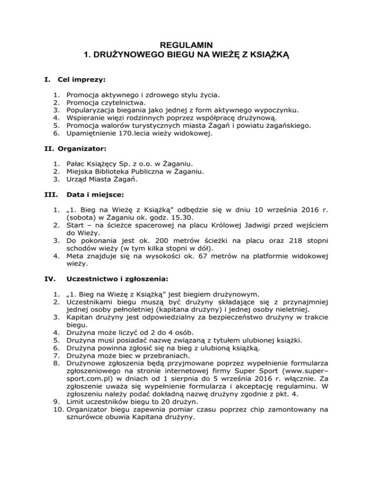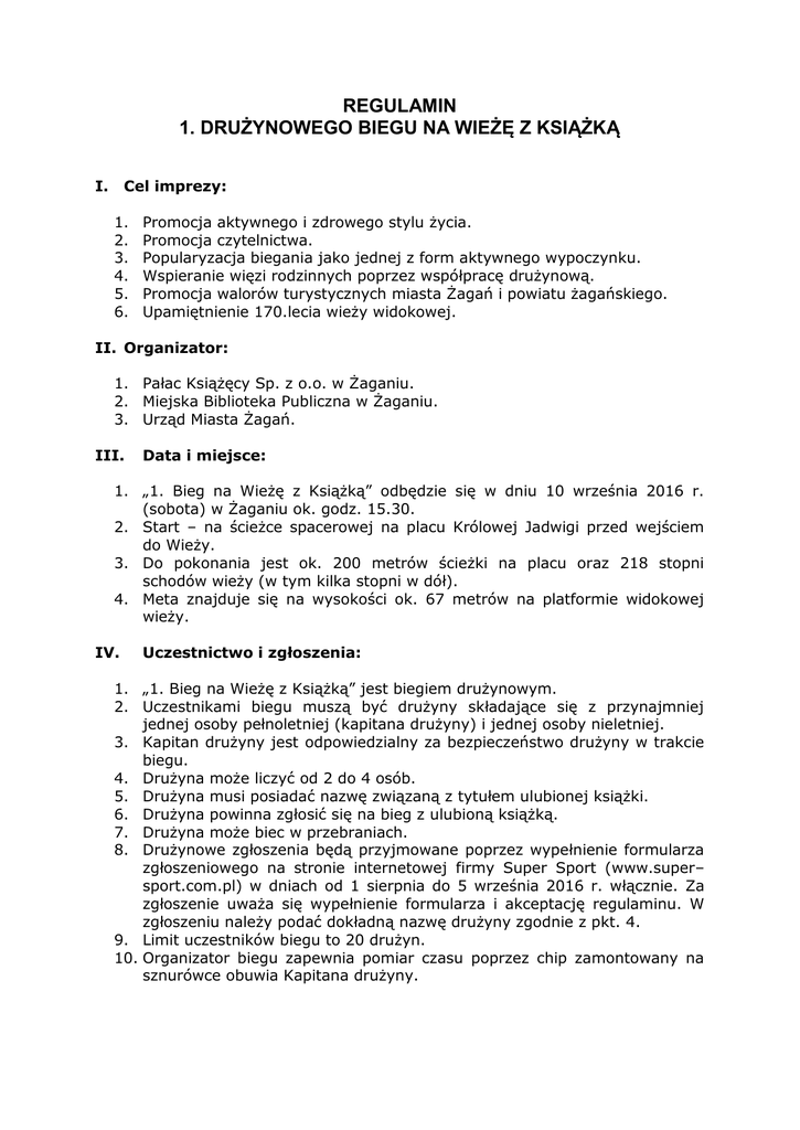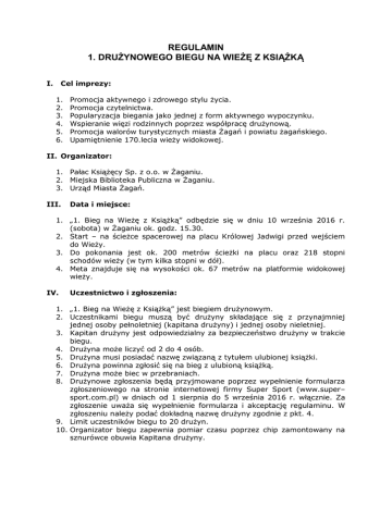 REGULAMIN 1. DRUŻYNOWEGO BIEGU NA WIEŻĘ Z KSIĄŻKĄ I. Cel imprezy: 1. 2. 3. 4. 5. 6. Promocja aktywnego i zdrowego stylu życia. Promocja czytelnictwa. Popularyzacja biegania jako jednej z form aktywnego wypoczynku. Wspieranie więzi rodzinnych poprzez współpracę drużynową. Promocja walorów turystycznych miasta Żagań i powiatu żagańskiego. Upamiętnienie 170.lecia wieży widokowej. II. Organizator: 1. Pałac Książęcy Sp. z o.o. w Żaganiu. 2. Miejska Biblioteka Publiczna w Żaganiu. 3. Urząd Miasta Żagań. III. Data i miejsce: 1. „1. Bieg na Wieżę z Książką” odbędzie się w dniu 10 września 2016 r. (sobota) w Żaganiu ok. godz. 15.30. 2. Start – na ścieżce spacerowej na placu Królowej Jadwigi przed wejściem do Wieży. 3. Do pokonania jest ok. 200 metrów ścieżki na placu oraz 218 stopni schodów wieży (w tym kilka stopni w dół). 4. Meta znajduje się na wysokości ok. 67 metrów na platformie widokowej wieży. IV. Uczestnictwo i zgłoszenia: 1. „1. Bieg na Wieżę z Książką” jest biegiem drużynowym. 2. Uczestnikami biegu muszą być drużyny składające się z przynajmniej jednej osoby pełnoletniej (kapitana drużyny) i jednej osoby nieletniej. 3. Kapitan drużyny jest odpowiedzialny za bezpieczeństwo drużyny w trakcie biegu. 4. Drużyna może liczyć od 2 do 4 osób. 5. Drużyna musi posiadać nazwę związaną z tytułem ulubionej książki. 6. Drużyna powinna zgłosić się na bieg z ulubioną książką. 7. Drużyna może biec w przebraniach. 8. Drużynowe zgłoszenia będą przyjmowane poprzez wypełnienie formularza zgłoszeniowego na stronie internetowej firmy Super Sport (www.super– sport.com.pl) w dniach od 1 sierpnia do 5 września 2016 r. włącznie. Za zgłoszenie uważa się wypełnienie formularza i akceptację regulaminu. W zgłoszeniu należy podać dokładną nazwę drużyny zgodnie z pkt. 4. 9. Limit uczestników biegu to 20 drużyn. 10. Organizator biegu zapewnia pomiar czasu poprzez chip zamontowany na sznurówce obuwia Kapitana drużyny. 11. Kapitan drużyny jest zobowiązany wbiec na metę jako ostatni, w przypadku pokonania linii mety w innej kolejności drużyna zostanie zdyskwalifikowana. 12. Organizator zapewnia pakiet startowy, w skład którego wchodzi: Numer startowy, Agrafki, 13. Pakiety startowe wydawane będą w Biurze Zawodów zlokalizowanym przy Wieży Widokowej w dniu 10 września 2016 r. od godz. 13.00 do godz. 15.00, po przedstawieniu przez uczestnika oświadczenia o braku zdrowotnych przeciwwskazań do startu w biegu oraz zgody opiekuna prawnego na jego uczestnictwo w biegu. 14. Pobranie numeru startowego i podpisanie oświadczenia jest równoznaczne z akceptacją regulaminu biegu oraz zgodą na przetwarzanie danych osobowych i wykorzystanie wizerunku uczestnika dla potrzeb organizatora. 15. Opłata startowa opiera się na idei bookcrossingu, czyli każda drużyna biegu musi przekazać na rzecz Miejskiej Biblioteki Publicznej w Żaganiu co najmniej jedną pozycję wydawniczą – książkę wydaną nie wcześniej niż 2 lata temu. Przekazanie książki nastąpi w chwili odbioru pakietu startowego. V. Oświadczenia i zgody opiekunów prawnych: 1. Oświadczenia oraz zgody na uczestnictwo osoby niepełnoletniej są do pobrania na stronie www.super-sport.com.pl oraz będą dostępne w Biurze Zawodów przy odbiorze pakietów startowych. VI. Rozstrzygnięcie biegu i nagrody: 1. Każda pełna drużyna, która przekroczy linię mety otrzyma pamiątkowe medale. 2. Wygrywa drużyna, która osiągnie najlepszy wynik minutowy netto. 3. Nagrody w postaci pamiątkowych pucharów otrzymają drużyny, które zdobędą I, II i III miejsce w klasyfikacji generalnej. 4. Wszyscy uczestnicy biegu mają zagwarantowaną wodę na mecie. VII. Program zawodów: 1. 13.00 – 15.00 – wydawanie pakietów startowych oraz rejestracja uczestników biegu, podpisanie oświadczeń i zgód na udział dziecka w biegu. 2. 12.00 - 15.30 – strefa chilloutowego relaksu (leżaki, animacje czytelnicze, kącik dla dzieci). 3. 15.20 – rozgrzewka. 4. 15.30 – start biegu. 5. 16.45-17.30 – rozdanie medali uczestnikom biegu oraz wręczenie pucharów zwycięzcom. 6. 17.30 – zakończenie imprezy. VIII. Postanowienia końcowe: 1. Uczestnicy biegu nie są ubezpieczeni od następstw nieszczęśliwych wypadków. 2. Organizator zapewnia pierwszą pomoc przedmedyczną. 3. Uczestników biegu obowiązuje strój oraz obuwie sportowe w czasie biegu. 4. Bieg odbędzie się bez względu na pogodę. 5. Organizator nie odpowiada za przedmioty pozostawione bez zabezpieczenia lub skradzione w czasie imprezy. 6. W trakcie imprezy odbywać się będą animacje związane z czytelnictwem. 7. Prawo interpretacji niniejszego regulaminu przysługuje organizatorowi. ORGANIZATORZY