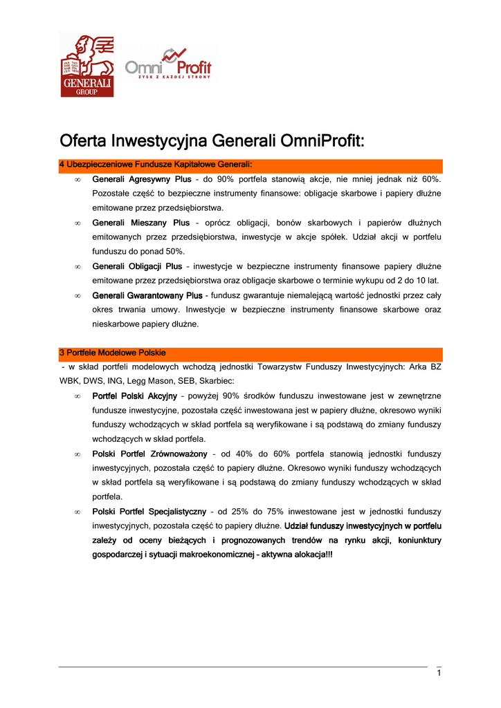 Oferta Inwestycyjna Generali OmniProfit: OmniProfit: 4 Ubezpieczeniowe Fundusze Kapitałowe Generali: • Generali Agresywny Plus – do 90% portfela stanowią akcje, nie mniej jednak niż 60%. Pozostałe część to bezpieczne instrumenty finansowe: obligacje skarbowe i papiery dłużne emitowane przez przedsiębiorstwa. • Generali Mieszany Plus – oprócz obligacji, bonów skarbowych i papierów dłużnych emitowanych przez przedsiębiorstwa, inwestycje w akcje spółek. Udział akcji w portfelu funduszu do ponad 50%. • Generali Obligacji Plus Plus – inwestycje w bezpieczne instrumenty finansowe papiery dłużne emitowane przez przedsiębiorstwa oraz obligacje skarbowe o terminie wykupu od 2 do 10 lat. • Generali Gwarantowany Plus - fundusz gwarantuje niemalejącą wartość jednostki przez cały okres trwania umowy. Inwestycje w bezpieczne instrumenty finansowe skarbowe oraz nieskarbowe papiery dłużne. 3 Portfele Modelowe Polskie - w skład portfeli modelowych wchodzą jednostki Towarzystw Funduszy Inwestycyjnych: Arka BZ WBK, DWS, ING, Legg Mason, SEB, Skarbiec: • Portfel Polski Akcyjny – powyżej 90% środków funduszu inwestowane jest w zewnętrzne fundusze inwestycyjne, pozostała część inwestowana jest w papiery dłużne, okresowo wyniki funduszy wchodzących w skład portfela są weryfikowane i są podstawą do zmiany funduszy wchodzących w skład portfela. • Polski Portfel Zrównoważony – od 40% do 60% portfela stanowią jednostki funduszy inwestycyjnych, pozostała część to papiery dłużne. Okresowo wyniki funduszy wchodzących w skład portfela są weryfikowane i są podstawą do zmiany funduszy wchodzących w skład portfela. • Polski Portfel Specjalistyczny – od 25% do 75% inwestowane jest w jednostki funduszy inwestycyjnych, pozostała część to papiery dłużne. Udział funduszy inwestycyjnych w portfelu zależy od oceny bieżących i prognozowanych trendów na rynku akcji, koniunktury gospodarczej i sytuacji makroekonomicznej – aktywna alokacja!!! 1 3 Portfele Modelowe Zagraniczne - skład portfeli modelowych tworzą jednostki uznanych międzynarodowych funduszy inwestycyjnych m.in. Fortis Investments, BlackRock/Merrill Lynch Investment Managers, Oppenheim Pramerica, Schroders : • Portfel Zagraniczny „Cztery Strony Świata” Akcyjny – portfel tworzą jednostki uczestnictwa lub certyfikaty inwestycyjne zagranicznych funduszy inwestycyjnych inwestujących w akcje spółek z całego świata. • Portfel Zagraniczny Nieruchomości – portfel lokuje środki w jednostki uczestnictwa lub certyfikaty inwestycyjne zagranicznych funduszy inwestycyjnych inwestujących w bezpośrednio w nieruchomości lub akcje spółek związanych z rynkiem nieruchomości (deweloperzy) lub spółki budowlane. • Portfel Zagraniczny Surowcowy – portfel grupuje jednostki uczestnictwa lub certyfikaty inwestycyjne zagranicznych funduszy inwestycyjnych inwestujących bezpośrednio w surowce lub w akcje spółek związanych z rynkiem surowców lub przemysłem wydobywczym. 33 ubezpieczeniowe fundusze kapitałowe, tworzone ze współpracy z zewnętrznymi funduszami funduszami inwestycyjnymi: • UFK Generali – Alior Aktywnej Selekcji • UFK Generali – Alior Short Equity • UFK Generali - Arka BZ WBK Akcji • UFK Generali - Arka BZ WBK Zrównoważony • UFK Generali - Arka BZ WBK Obligacji • UFK Generali – Legg Mason Akcji • UFK Generali – Legg Mason Strateg • UFK Generali – Legg Mason Pieniężny • UFK Generali – Skarbiec Akcja • UFK Generali – ING Akcji • UFK Generali – NOVO Akcji • UFK Generali – NOVO Stabilnego Wzrostu • UFK Generali – NOVO Obligacji Przedsiębiorstw 2 • UFK Generali – Inwestor Akcji Dużych Spółek • UFK Generali – Inwestor Płynna Lokata • UFK Generali – Noble Akcji • UFK Generali – Noble Mieszany • UFK Generali – UniKorona Akcji • UFK Generali – BlackRock New Energy Fund (EUR) • UFK Generali – BlackRock World Gold Fund (EUR) • UFK Generali – BlackRock Asian Dragon Fund (EUR) • UFK Generali – Templeton Global Total Return Fund (USD) • UFK Generali – Templeton Latin America Fund (USD) • UFK Generali – Franklin MENA Fund (EUR) • UFK Generali – Franklin India Fund (USD) • UFK Generali – HSBC Global Emerging Markets Equity (USD) • UFK Generali – HSBC BRIC Markets Equity (USD) • UFK Generali - HSBC Asia ex Japan Equity Smaller Companies(USD) • UFK Generali – BNP Paribas Fortis L FUND Equity Turkey (EUR) • UFK Generali – BNP Paribas Fortis OBAM Equity World (EUR) • UFK Generali – East Capital Eastern European Fund (EUR) • UFK Generali – Schroder US Small&Mid-Cap Equity (EUR) • UFK Generali – Schroder ISF Greater China (USD) 3
