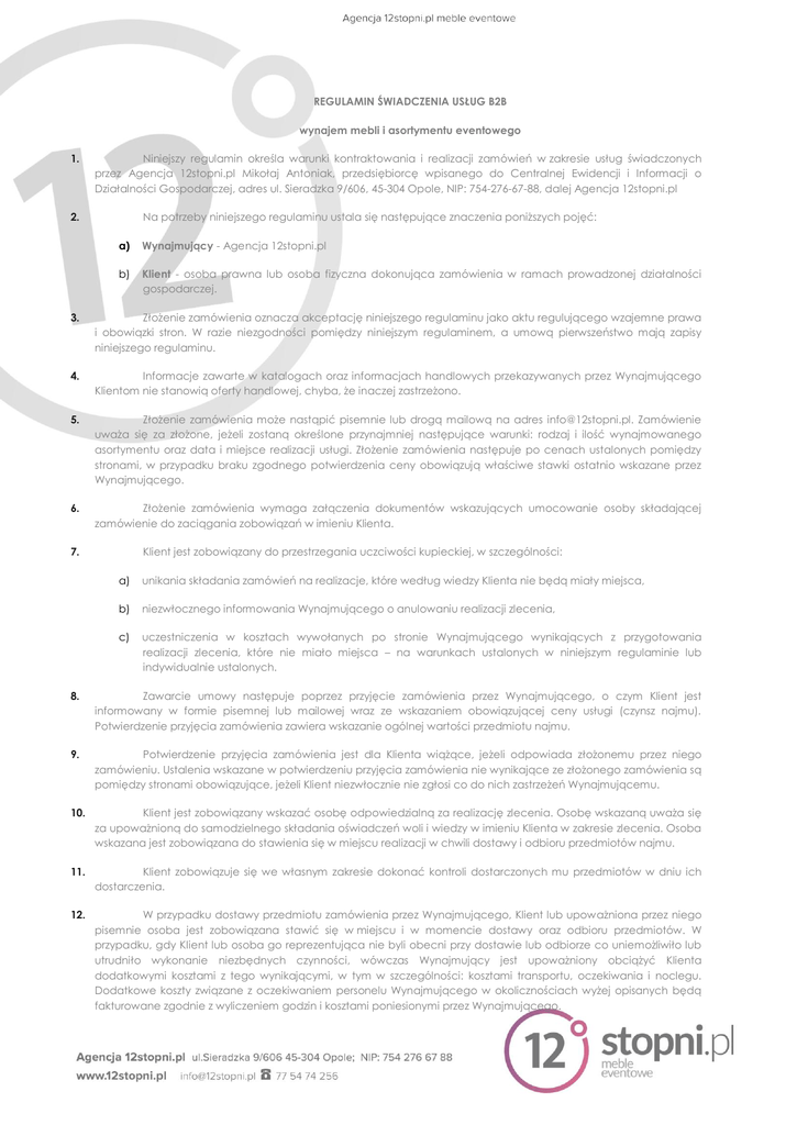 REGULAMIN ŚWIADCZENIA USŁUG B2B wynajem mebli i asortymentu eventowego 1. Niniejszy regulamin określa warunki kontraktowania i realizacji zamówień w zakresie usług świadczonych przez Agencja 12stopni.pl Mikołaj Antoniak, przedsiębiorcę wpisanego do Centralnej Ewidencji i Informacji o Działalności Gospodarczej, adres ul. Sieradzka 9/606, 45-304 Opole, NIP: 754-276-67-88, dalej Agencja 12stopni.pl 2. Na potrzeby niniejszego regulaminu ustala się następujące znaczenia poniższych pojęć: a) Wynajmujący - Agencja 12stopni.pl b) Klient - osoba prawna lub osoba fizyczna dokonująca zamówienia w ramach prowadzonej działalności gospodarczej. 3. Złożenie zamówienia oznacza akceptację niniejszego regulaminu jako aktu regulującego wzajemne prawa i obowiązki stron. W razie niezgodności pomiędzy niniejszym regulaminem, a umową pierwszeństwo mają zapisy niniejszego regulaminu. 4. Informacje zawarte w katalogach oraz informacjach handlowych przekazywanych przez Wynajmującego Klientom nie stanowią oferty handlowej, chyba, że inaczej zastrzeżono. 5. Złożenie zamówienia może nastąpić pisemnie lub drogą mailową na adres [email protected]. Zamówienie uważa się za złożone, jeżeli zostaną określone przynajmniej następujące warunki: rodzaj i ilość wynajmowanego asortymentu oraz data i miejsce realizacji usługi. Złożenie zamówienia następuje po cenach ustalonych pomiędzy stronami, w przypadku braku zgodnego potwierdzenia ceny obowiązują właściwe stawki ostatnio wskazane przez Wynajmującego. 6. Złożenie zamówienia wymaga załączenia dokumentów wskazujących umocowanie osoby składającej zamówienie do zaciągania zobowiązań w imieniu Klienta. 7. Klient jest zobowiązany do przestrzegania uczciwości kupieckiej, w szczególności: a) unikania składania zamówień na realizacje, które według wiedzy Klienta nie będą miały miejsca, b) niezwłocznego informowania Wynajmującego o anulowaniu realizacji zlecenia, c) uczestniczenia w kosztach wywołanych po stronie Wynajmującego wynikających z przygotowania realizacji zlecenia, które nie miało miejsca – na warunkach ustalonych w niniejszym regulaminie lub indywidualnie ustalonych. 8. Zawarcie umowy następuje poprzez przyjęcie zamówienia przez Wynajmującego, o czym Klient jest informowany w formie pisemnej lub mailowej wraz ze wskazaniem obowiązującej ceny usługi (czynsz najmu). Potwierdzenie przyjęcia zamówienia zawiera wskazanie ogólnej wartości przedmiotu najmu. 9. Potwierdzenie przyjęcia zamówienia jest dla Klienta wiążące, jeżeli odpowiada złożonemu przez niego zamówieniu. Ustalenia wskazane w potwierdzeniu przyjęcia zamówienia nie wynikające ze złożonego zamówienia są pomiędzy stronami obowiązujące, jeżeli Klient niezwłocznie nie zgłosi co do nich zastrzeżeń Wynajmującemu. 10. Klient jest zobowiązany wskazać osobę odpowiedzialną za realizację zlecenia. Osobę wskazaną uważa się za upoważnioną do samodzielnego składania oświadczeń woli i wiedzy w imieniu Klienta w zakresie zlecenia. Osoba wskazana jest zobowiązana do stawienia się w miejscu realizacji w chwili dostawy i odbioru przedmiotów najmu. 11. Klient zobowiązuje się we własnym zakresie dokonać kontroli dostarczonych mu przedmiotów w dniu ich dostarczenia. 12. W przypadku dostawy przedmiotu zamówienia przez Wynajmującego, Klient lub upoważniona przez niego pisemnie osoba jest zobowiązana stawić się w miejscu i w momencie dostawy oraz odbioru przedmiotów. W przypadku, gdy Klient lub osoba go reprezentująca nie byli obecni przy dostawie lub odbiorze co uniemożliwiło lub utrudniło wykonanie niezbędnych czynności, wówczas Wynajmujący jest upoważniony obciążyć Klienta dodatkowymi kosztami z tego wynikającymi, w tym w szczególności: kosztami transportu, oczekiwania i noclegu. Dodatkowe koszty związane z oczekiwaniem personelu Wynajmującego w okolicznościach wyżej opisanych będą fakturowane zgodnie z wyliczeniem godzin i kosztami poniesionymi przez Wynajmującego. 13. Płatność czynszu za wynajem jest płatna na 7 dni przed datą realizacji zamówienia. W przypadku zamówień pilnych, złożonych na mniej niż 7 dni przed wydarzeniem płatność powinna zostać dokonana nie później niż na 3 dni przed terminem wynajmu lub w dniu złożenia zamówienia. Płatności dokonywane są na podstawie wystawionej faktury VAT, w terminie w niej określonym i na rachunek w niej wskazany. 14. W przypadku braku płatności w wymaganym terminie Wynajmujący jest uprawniony do naliczania odsetek ustawowych. 15. Wynajmujący może udzielić Klientowi rabatu na całość lub część zamówienia. Wysokość rabatu będzie wynikała z formularza zamówienia. Wszelkie rabaty udzielane Klientowi przez Wynajmującego są przyznawane warunkowo tj. pod warunkiem uiszczenia należności głównej w terminach wynikających z zawartej umowy. W przypadku opóźnienia Klienta w terminowej płatności Wynajmujący jest uprawniony do jednostronnego cofnięcia udzielonego rabatu i wystawienia faktury korygującej (powiększenie o kwotę udzielonego rabatu). Doręczenie faktury korygującej uważa się za złożenie oświadczenia o cofnięciu rabatu. 16. Wynajmujący, nawet po zawarciu umowy, ma prawo odmówić wykonania umowy w przypadku braku zapłaty w umówionym terminie. W takiej sytuacji Wynajmujący ma również prawo od umowy odstąpić i obciążyć Klienta kosztami wynikającymi z przygotowania realizacji umowy. 17. Wynajmujący w przypadku opóźnienia płatności jest uprawniony do odstąpienia od umowy i odmowy dostawy lub odbioru przedmiotu najmu przed terminem zakończenia najmu. 18. W przypadku kwestionowania zasadności wystawionej i dostarczonej faktury VAT Klient jest zobowiązany o tym poinformować na piśmie lub mailowo Wynajmującego w ciągu 14 dni od daty otrzymania faktury. Zgłoszenie zastrzeżeń dla swej skuteczności wymaga uzasadnienia. Strony zgo