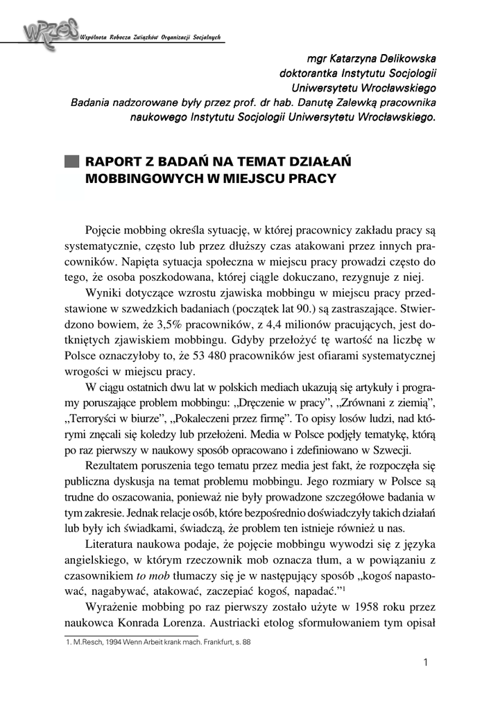 Wspólnota Robocza Związków Organizacji Socjalnych mgr Katarzyna Delikowska doktorantka Instytutu Socjologii Uniwersytetu Wrocławskiego Badania nadzorowane były przez prof. dr hab. Danutę Zalewką pracownika naukowego Instytutu Socjologii Uniwersytetu Wrocławskiego. RAPORT Z BADAŃ NA TEMAT DZIAŁAŃ MOBBINGOWYCH W MIEJSCU PRACY Pojęcie mobbing określa sytuację, w której pracownicy zakładu pracy są systematycznie, często lub przez dłuższy czas atakowani przez innych pra− cowników. Napięta sytuacja społeczna w miejscu pracy prowadzi często do tego, że osoba poszkodowana, której ciągle dokuczano, rezygnuje z niej. Wyniki dotyczące wzrostu zjawiska mobbingu w miejscu pracy przed− stawione w szwedzkich badaniach (początek lat 90.) są zastraszające. Stwier− dzono bowiem, że 3,5% pracowników, z 4,4 milionów pracujących, jest do− tkniętych zjawiskiem mobbingu. Gdyby przełożyć tę wartość na liczbę w Polsce oznaczyłoby to, że 53 480 pracowników jest ofiarami systematycznej wrogości w miejscu pracy. W ciągu ostatnich dwu lat w polskich mediach ukazują się artykuły i progra− my poruszające problem mobbingu: „Dręczenie w pracy”, „Zrównani z ziemią”, „Terroryści w biurze”, „Pokaleczeni przez firmę”. To opisy losów ludzi, nad któ− rymi znęcali się koledzy lub przełożeni. Media w Polsce podjęły tematykę, którą po raz pierwszy w naukowy sposób opracowano i zdefiniowano w Szwecji. Rezultatem poruszenia tego tematu przez media jest fakt, że rozpoczęła się publiczna dyskusja na temat problemu mobbingu. Jego rozmiary w Polsce są trudne do oszacowania, ponieważ nie były prowadzone szczegółowe badania w tym zakresie. Jednak relacje osób, które bezpośrednio doświadczyły takich działań lub były ich świadkami, świadczą, że problem ten istnieje również u nas. Literatura naukowa podaje, że pojęcie mobbingu wywodzi się z języka angielskiego, w którym rzeczownik mob oznacza tłum, a w powiązaniu z czasownikiem to mob tłumaczy się je w następujący sposób „kogoś napasto− wać, nagabywać, atakować, zaczepiać kogoś, napadać.”1 Wyrażenie mobbing po raz pierwszy zostało użyte w 1958 roku przez naukowca Konrada Lorenza. Austriacki etolog sformułowaniem tym opisał 1. M.Resch, 1994 Wenn Arbeit krank mach. Frankfurt, s. 88 1 SPOŁECZNIK NR swoje badania dotyczące sytuacji, kiedy grupa zwierząt broniąc się, atakuje inne zwierzę, aby je odstraszyć.2 Pod koniec lat 60. szwedzki lekarz Peter P. Heinemann pojęciem mob− bingu określił stosunki panujące między ludźmi. Opisał nim zachowanie grupy dzieci, które doprowadziły jedno z nich do samobójstwa. Po publikacji jego pracy w 1972 roku pojęcie mobbingu weszło na stałe do słownika języka szwedzkiego. Zjawisku mobbingu zaczęto poświęcać co raz więcej uwagi. Zorganizowano badania najpierw na terenie szkół państw skandynawskich, a później niektórych państw europejskich. Na początku lat 80. znaczenie mobbingu zostało rozszerzone. Stało się to za sprawą Heinza Leymanna, psychologa pracy niemieckiego pochodze− nia, osiedlonego na stałe w Szwecji. H. Leymann użył tego pojęcia do opisa− nia zjawiska występującego w świecie ludzi pracujących. Zjawisko to doty− czyło sytuacji, w której pojedyncze osoby albo grupa skupia się na jednym słabszym koledze. Współpracownicy, przełożeni atakują go, często i przez dłuższy czas, w celu „wykluczenia go z pracy.”3 W mojej pracy pojęcie mobbingu będzie używane do opisywania syste− matycznego wrogiego działania w miejscu pracy. Niezwykle ważne jest usta− lenie zakresu pojęcia mobbingu, bowiem używanie go w języku potocznym wykazuje tendencje do zmiany jego sensu naukowego. Często już pojedyn− cze sprzeczki lub okazywanie obojętności określane są mianem mobbingu, dlatego zdaniem H. Leymanna istnieje niebezpieczeństwo, że „pojęcie to sta− nie się modnym wyrazem, który nic innego nie oznacza jak konflikt.”4 Mobbing określa pewien proces lub przebieg działań, który zaczyna się konfliktem. Konflikt pojawiał się w organizacjach w przeszłości, pojawia się obecnie i najprawdopodobniej będzie w przyszłości. Można zatem stwier− dzić, że jest zjawiskiem nie do uniknięcia, powstającym we wszystkich dzie− dzinach i formach życia społecznego. Może przybierać postać konfliktu in− dywidualnego, jak i społecznego o charakterze powszechnym. Konflikt zda− niem J. Szczepańskiego „jest procesem, w którym jednostka lub grupa dąży do osiągnięcia własnych celów przez wyeliminowanie, podporządkowanie sobie lub zniszczenie jednostki lub grupy dążącej do celów podobnych lub identycznych.”5 Rozpatrując konflikt z punktu widzenia teorii socjologicz− nej należy stwierdzić, że powstaje w wyniku zmian stosunków i procesów 2. K. Niedl, 1995 Mobbing/Bullying am Arbeitsplatz München, s.12 3. H. Leymann, 1995 Das Koncept und seine Resonanz in Deutschland.w:H. Leymann Der neue Mobbing−Bericht s.18 4. Ibidem, s. 17 5. W. Piwowarski,1993 Słownik Katolickiej Nauki Społecznej. W−wa 2 7 Wspólnota Robocza Związków Organizacji Socjalnych społecznych o charakterze ekonomicznym, politycznym, ideologicznym itp. Jego naturalną tendencją jest to, że trwa krótko i obie strony są zainteresowa− ne jego rozwiązaniem. W przypadku mobbingu konflikt trwa długo, narasta i przybiera wyszukane formy. Zamiast podejmować próby jego rozwiązania jedna ze stron konfliktu podtrzymuje go i doprowadza do jego eskalacji. Pojawia się wtedy swoisty rodzaj nękania definiowany przez R. Edelmanna, jako „zachowanie, które wywołuje u narażonej na nie jednostki poczucie dyskomfortu fizycznego lub emocjonalnego. Termin nękanie oznacza do− słownie pozbawienie spokoju, męczenie lub niepokojenie poprzez nieustan− ne ataki, pytania.”6 Konflikt, który przybiera taką postać z pewnością jest konflikt
