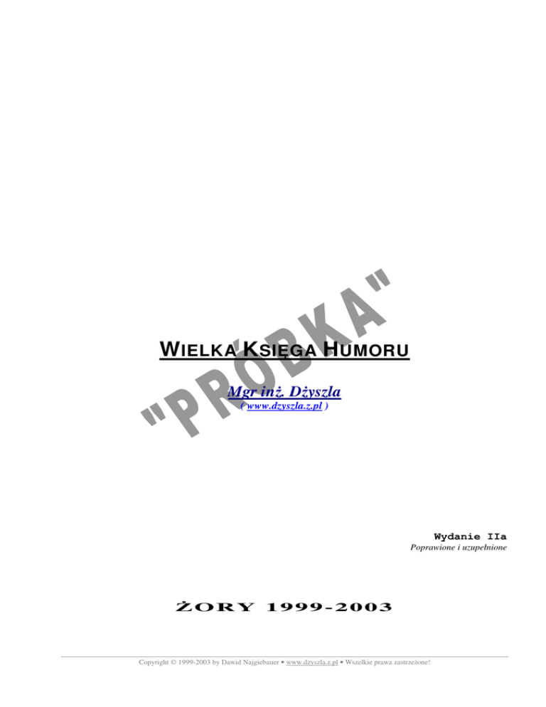 W IELKA K SI GA H UMORU Mgr in . D yszla ( www.dzyszla.z.pl ) Wydanie IIa Poprawione i uzupełnione ORY 1999-2003 Copyright © 1999-2003 by Dawid Najgiebauer • www.dzyszla.z.pl • Wszelkie prawa zastrze one! Spis tre ci 3 SPIS TRE CI Spis tre ci .......................................................................3 Wst p .............................................................................5 O Babie ..........................................................................7 O Bacy..........................................................................13 O Blondynkach.............................................................21 O Czerwonym Kapturku ..............................................27 O Dziewczynach i Kobietach .......................................29 O Hrabim......................................................................35 O Jasiu..........................................................................37 O Małyszu ....................................................................45 O Potworach.................................................................47 O Ksi ach ...................................................................49 O Lekarzach .................................................................53 O M u i onie ............................................................61 O Nauczycielach ..........................................................69 O Pijakach ....................................................................77 O Polakach i ich s siadach ...........................................81 O Policjantach ..............................................................87 O Górnikach i Rolnikach..............................................97 O Studentach ..............................................................101 O Szefach ...................................................................107 O Szkotach .................................................................109 O Te ciowej ...............................................................111 O Wariatach................................................................113 O W chocku ...............................................................115 O Wi niach ...............................................................121 O Wojsku....................................................................123 O Zaj czku .................................................................129 Dowcipy polityczne....................................................137 Głupie pytania i głupsze odpowiedzi..........................143 Graffiti........................................................................151 Hakerzy ......................................................................157 Ogłoszenia..................................................................159 Komputery..................................................................161 Opowiadania i anegdotki............................................165 Piwo - napój bogów....................................................167 Prawa Murphy’ego .....................................................169 Skróty .........................................................................177 Szczyty .......................................................................179 Szedł facet... ...............................................................181 W restauracji ..............................................................183 A. Fredro – „Pan Tadeusz” - ksi ga XIII ...................187 Z notatnika milicjanta.................................................189 Ze szkolnych zeszytów...............................................195 Ró ne..........................................................................199 Bajki... ........................................................................235 Wierszyki ...................................................................237 Copyright © 1999-2003 by Dawid Najgiebauer • www.dzyszla.z.pl • Wszelkie prawa zastrze one! Wst p 5 WST P Wielka Ksi ga Humoru jest plikiem z ró nego rodzaju dowcipami humorami i artami, jakie udało mi si zabra do tej pory. Wi kszo pochodzi ze zbiorów własnych, ale tak e gro „zapo yczyłem” z internetu, gazet i innych ródeł. Znajduj si tu arty zarówno bardziej, jak i mniej znane, ale my l , e ka dy znajdzie tu co dla siebie, czym umili sobie czas. Zebrałem tu jak na razie do du dawk humoru; ilo ci artów nie jestem w stanie zliczy , ale zajmuj one ponad 230 stron. Wielka Ksi ga Humoru to tak e ponad 3 000 minut naszej pracy. Wszystkie dowcipy podzielone s na działy, cho wiele z nich mogłoby si znale tak e w innym dziale, ni ten, do którego został sklasyfikowany. Mo e si zdarzy , e który z artów wyst puje w dwóch miejscach – po prostu niekiedy b dzie pasował do dwóch kategorii. Nie gwarantuj równie poprawno ci ortograficznej wszystkich tekstów. Wszystkie dowcipy, które w swej tre ci zawieraj mniej moralne w tki lub s mało etyczne i nie powinny by czytane przez dzieci ;-) s oznaczone specjalnym znakiem – „!”. Cały dokument został tak skonstruowany, aby nadawał si do druku dwustronnego, cho w tpi , czy kto b dzie gotów po wi ci si dla drukowania takiej ilo ci tekstu. Postarałem si o jak najefektywniejsze zmniejszenie liczby stron poprzez zastosowanie podziału na dwie szpalty; jednak starałem si , aby ! wszystko było jak najbardziej czytelne, dlatego m.in. ka dy rozdział zaczyna si na prawej (nieparzystej) stronie. My l , e lektura Ksi gi pomo e Wam si rozerwa , a tak e wzbogacicie swój repertuar artów o nowe, którymi b dziecie mogli zabłysn w towarzystwie. Jednocze nie prosz o wszelkie uwagi, tak e te krytyczne na temat Ksi gi. B d wdzi czni za wskazywanie wszelkich niedoci gni i bł dów oraz za sugestie dotycz ce kolejnych wyda Ksi gi, które b d ci gle rozszerzane i poprawiane. Jednak wszystko zale y od Was. Wszelkie informacje na temat kontaktu ze mn oraz wiele innych ciekaw