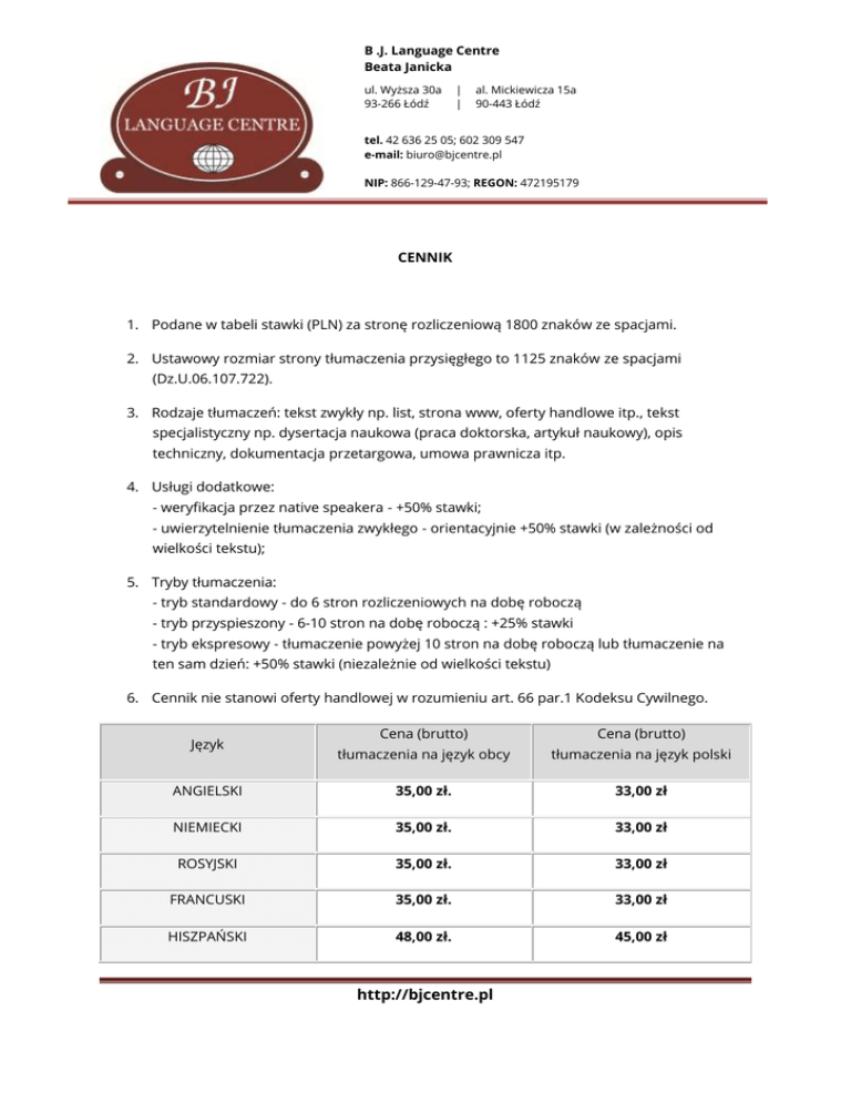 B .J. Language Centre Beata Janicka ul. Wyższa 30a 93-266 Łódź | | al. Mickiewicza 15a 90-443 Łódź tel. 42 636 25 05; 602 309 547 e-mail: [email protected] NIP: 866-129-47-93; REGON: 472195179 CENNIK 1. Podane w tabeli stawki (PLN) za stronę rozliczeniową 1800 znaków ze spacjami. 2. Ustawowy rozmiar strony tłumaczenia przysięgłego to 1125 znaków ze spacjami (Dz.U.06.107.722). 3. Rodzaje tłumaczeń: tekst zwykły np. list, strona www, oferty handlowe itp., tekst specjalistyczny np. dysertacja naukowa (praca doktorska, artykuł naukowy), opis techniczny, dokumentacja przetargowa, umowa prawnicza itp. 4. Usługi dodatkowe: - weryfikacja przez native speakera - +50% stawki; - uwierzytelnienie tłumaczenia zwykłego - orientacyjnie +50% stawki (w zależności od wielkości tekstu); 5. Tryby tłumaczenia: - tryb standardowy - do 6 stron rozliczeniowych na dobę roboczą - tryb przyspieszony - 6-10 stron na dobę roboczą : +25% stawki - tryb ekspresowy - tłumaczenie powyżej 10 stron na dobę roboczą lub tłumaczenie na ten sam dzień: +50% stawki (niezależnie od wielkości tekstu) 6. Cennik nie stanowi oferty handlowej w rozumieniu art. 66 par.1 Kodeksu Cywilnego. Cena (brutto) Cena (brutto) tłumaczenia na język obcy tłumaczenia na język polski ANGIELSKI 35,00 zł. 33,00 zł NIEMIECKI 35,00 zł. 33,00 zł ROSYJSKI 35,00 zł. 33,00 zł FRANCUSKI 35,00 zł. 33,00 zł HISZPAŃSKI 48,00 zł. 45,00 zł Język http://bjcentre.pl B .J. Language Centre Beata Janicka ul. Wyższa 30a 93-266 Łódź | | al. Mickiewicza 15a 90-443 Łódź tel. 42 636 25 05; 602 309 547 e-mail: [email protected] NIP: 866-129-47-93; REGON: 472195179 SZWEDZKI 48,00 zł. 45,00 zł WŁOSKI 48,00 zł. 45,00 zł PORTUGALSKI 48,00 zł. 45,00 zł GRECKI 80,00 zł 77,00 zł JAPOŃSKI 100,00 zł 95,00 zł CHIŃSKI 100,00 zł 95,00 zł DODATKOWO : tłumaczenia ANGIELSKI / NIEMIECKI 60,00 zł NIEMIECKI / ANGIELSKI 60,00 zł tłumaczenia ANGIELSKI / SZWEDZKI 75,00 zł SZWEDZKI/ ANGIELSKI 85,00 zł tłumaczenia ANGIELSKI / JAPOŃSKI 90,00 zł JAPOŃSKI/ ANGIELSKI 100,00 zł tłumaczenia ROSYJSKI/ CHIŃSKI 110,00 zł CHIŃSKI /ROSYJSKI 100,00 zł TŁUMACZENIA USTNE : ANGIELSKI / POLSKI / NIEMIECKI 65,00 zł/godz. ROSYJSKI / POLSKI / ANGIELSKI 65,00 zł/godz. FRANCUSKI / POLSKI / ANGIELSKI 65,00 zł/godz. SZWEDZKI / POLSKI / ANGIELSKI 75,00 zł/godz. CHIŃSKI / POLSKI / ROSYJSKI 120,00 zł/godz. JAPOŃSKI / POLSKI / ANGIELSKI 120,00 zł/godz. RABATY PRZY WIĘKSZEJ LICZBIE GODZIN http://bjcentre.pl