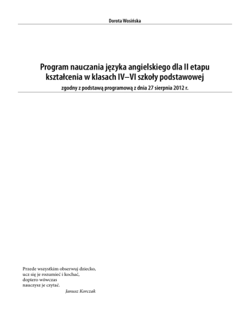 Dorota Wosińska Program nauczania języka angielskiego dla II etapu kształcenia w klasach IV–VI szkoły podstawowej zgodny z podstawą programową z dnia 27 sierpnia 2012 r. Przede wszystkim obserwuj dziecko, ucz się je rozumieć i kochać, dopiero wówczas nauczysz je czytać. Janusz Korczak Konsultacja merytoryczna: Barbara Tittenbrun, Halina Tyliba Redakcja merytoryczna: Małgorzata Mostek Redakcja językowa: Elżbieta Gola © NOWA ERA Sp z o.o. ISBN 978-83-267-0883-1 Nowa Era Sp. z o.o. Aleje Jerozolimskie 146D, 02-305 Warszawa Skład i łamanie: Studio BELLE-AMI, www.belleami.pl 1. Spis treści 1. Charakterystyka programu 5 1.1. Metryczka programu 1.2. O Autorce 1.3. Uczestnicy procesu edukacyjnego 1.3.1.Uczniowie 1.3.2.Nauczyciele 1.3.3.Rodzice 5 5 5 5 7 7 2. 8 Warunki realizacji programu 2.1. Liczebność klas/grup 2.2. Miejsce pracy 8 8 3. Założenia programu 8 3.1. 3.2. 3.3. 3.4. 3.5. 3.6. 3.7. Podejście holistyczne Kompetencja interkulturowa Podejście komunikacyjno-zadaniowe Indywidualizacja nauczania Autonomia i umiejętność dokonywania samooceny Korelacja międzyprzedmiotowa Umiejętność zdawania egzaminów 8 9 9 9 9 10 10 4. Cele edukacyjne i zadania szkoły 10 4.1. 4.2. 4.3. 4.4. 4.5. Ogólne cele kształcenia Cele kształcenia w zakresie języków obcych Cele edukacji językowej według europejskiego systemu opisu kształcenia językowego Cele w zakresie komunikacji interkulturowej Cele w zakresie autonomii pracy ucznia 10 10 11 11 11 5. Treści nauczania 12 5.1. Zakres tematyczny – słownictwo 5.2.Gramatyka 5.3. Funkcje językowe 5.4. Sprawności językowe 12 12 13 14 6. 15 Realizacja programu – procedury osiągania celów 6.1. Metody nauczania 6.2. Formy pracy 6.3. Techniki pracy 6.3.1. Techniki nauczania słownictwa 6.3.2. Techniki nauczania gramatyki 6.3.3. Sprawności receptywne 6.3.3.1.Techniki rozwijające sprawność rozumienia ze słuchu 6.3.4. Techniki rozwijające sprawność czytania ze zrozumieniem 6.3.5. Sprawności produktywne 6.3.5.1.Techniki rozwijające sprawność mówienia 6.3.5.2.Techniki rozwijające sprawność pisania 6.4. Korelacja międzyprzedmiotowa 6.5. Realizacja treści kulturoznawczych i proeuropejskich 15 16 16 16 18 19 19 20 21 21 22 23 24 6.6. Wdrażanie indywidualizacji nauczania 6.6.1. Uczeń o specjalnych potrzebach edukacyjnych 6.6.1.1.Praca z uczniem dyslektycznym 6.6.1.2.Uczeń z nadpobudliwością ruchową 6.6.1.3.Uczeń zdolny 6.7. Wdrażanie autonomii i samodoskonalenia 25 25 26 27 28 29 7. Przewidywane osiągnięcia uczniów 29 8. Kontrola i ocena osiągnięć uczniów 30 8.1. 8.2. 8.3. 8.4. Kontrola bieżąca Kontrola okresowa Przykładowe kryteria oceniania Wdrażanie do samooceny 8.4.1. Karty samooceny 8.4.2. Portfolio językowe 8.5. Ocena pracy nauczyciela 30 30 34 37 37 38 38 9. 39 Motywowanie uczniów do nauki 10. Przykładowe scenariusze lekcji 41 11. Sugerowane środki dydaktyczne przydatne w realizacji programu 47 11.1. Literatura do nauki języka angielskiego 11.2. Literatura z zakresu doradztwa metodycznego 47 47 12.Bibliografia 47 1. Charakterystyka programu 1.1. Metryczka programu Przedmiot nauczania: język angielski Etap edukacyjny: klasy IV–VI szkoły podstawowej (II etap edukacyjny) Wymiar godzinowy: Zgodnie z podstawą programową kształcenia ogólnego z 27 sierpnia 2012 r. program zakłada realizację 290 godzin języka angielskiego w klasach IV-VI szkoły podstawowej, w sumie 9 godzin tygodniowo w trzyletnim cyklu kształcenia. Rozkład godzin nie jest ściśle określony dla poszczególnych lat. Dyrektor szkoły decyduje, ile godzin zostanie przeznaczonych na naukę języka obcego w klasie czwartej, piątej i szóstej w danym roku szkolnym. Rozkład godzin może zatem być następujący: po 3 godziny tygodniowo w klasie IV, V i VI. Adresaci programu: Program jest adresowany do nauczycieli języka angielskiego uczących w klasach IV–VI, dyrektorów sprawujących nadzór pedagogiczny oraz rodziców, zainteresowanych przebiegiem kształcenia językowego swoich dzieci. Podstawa prawna: Rozporządzenie Ministra Edukacji z dnia 27 sierpnia 2012 roku (załącznik nr 2 do Rozporządzenia Ministra Edukacji Narodowej z dnia 27 sierpnia 2012 r. w sprawie podstawy programowej wychowania przedszkolnego oraz kształcenia ogólnego w poszczególnych typach szkół (Dz. U. Nr 0 z 2012 r., poz. 977) w sprawie podstawy programowej wychowania przedszkolnego oraz kształcenia ogólnego w poszczególnych typach szkół. Poziom biegłości językowej: W kontekście europejskiego systemu opisu kształcenia językowego II etap edukacyjny nawiązuje w większości wymagań do poziomu A1, z zastrzeżeniem, że ESOKJ został opracowany dla uczniów dorosłych. Podstawa programowa dopuszcza uzyskanie wyższego poziomu, wykraczającego poza A1, jeśli grupa uczniów zaczęła naukę na wyższym poziomie niż zakładany i /lub jest to grupa uczniów utalentowanych, którzy dzięki podziałowi na grupy zaawansowania mieli sposobność pracy w zwiększonym tempie i o wyższym stopniu trudności. 1.2. O Autorce Dorota Wosińska jest absolwentką filologii angielskiej Uniwersytetu Opolskiego. Obecnie pracuje jako nauczyciel akademicki i metodyk nauczania języków obcych w pracowni nauczania językowego dzieci w Wyższej Szkole Lingwistycznej w Częstochowie. Jest współtwórcą koncepcji programowej prywatnej szkoły podstawowej Akademia „Soward” powstałej przy Wyższej Szkole Lingwistycznej. Od 2011 r. piastuje stanowisko koordynatora projektu unijnego „WSL liderem w efektywnym kształceniu nauczycieli”, którego celem jest wypracowanie nowego, skutecznego modelu praktyk pedagogicznych. Jest autorką wielu publikacji, w tym współautorką książki Nauczanie języka angielskiego: dobre lekcje – ciekawe pomysły. 1.3. Uczestnicy procesu edukacyjnego 1.3.1. Uczniowie W ofercie szkół język angielski znajduje się na pierwszym miejscu wśród propozycji w zakresie nauki języków obcych. Wprowadza się go st