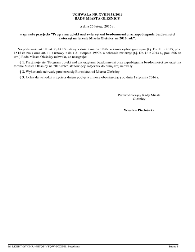UCHWAŁA NR XVIII/138/2016 RADY MIASTA OLEŚNICY z dnia 26 lutego 2016 r. w sprawie przyjęcia "Programu opieki nad zwierzętami bezdomnymi oraz zapobiegania bezdomności zwierząt na terenie Miasta Oleśnicy na 2016 rok". Na podstawie art.18 ust. 2 pkt 15 ustawy z dnia 8 marca 1990r. o samorządzie gminnym (t.j. Dz. U. z 2015, poz. 1515 ze zm.) oraz art. 11 a ustawy z dnia 21 sierpnia 1997r. o ochronie zwierząt (t.j. Dz. U. z 2013 r., poz. 856 ze zm.) Rada Miasta Oleśnicy uchwala, co następuje: § 1. Przyjmuje się "Program opieki nad zwierzętami bezdomnymi oraz zapobiegania bezdomności zwierząt na terenie Miasta Oleśnicy na 2016 rok", stanowiący załącznik do niniejszej uchwały. § 2. Wykonanie uchwały powierza się Burmistrzowi Miasta Oleśnicy. § 3. Uchwała wchodzi w życie z dniem podjęcia z mocą obowiązującą od dnia 1 stycznia 2016 r. Przewodniczący Rady Miasta Oleśnicy Wiesław Piechówka Id: LKEDT-QYCMR-NHTQT-VTQJV-DXXNB. Podpisany Strona 1 Uzasadnienie W myśl art. 11 a ustawy z dnia 21 sierpnia 1997 r. o ochronie zwierząt (t.j. Dz. U. z 2013 r. poz. 856) Rada Miasta określa corocznie w drodze uchwały program opieki nad zwierzętami bezdomnymi oraz zapobiegania bezdomności zwierząt. Stanowi to wypełnienie obowiązku wynikającego z art. 11 ust. 1 w/w. ustawy. Obligatoryjne uchwalanie przez gminy programu opieki nad zwierzętami bezdomnymi oraz zapobiegania bezdomności zwierząt, przyczyni się do ograniczenia bezdomności zwierząt oraz poprawy bytu tych zwierząt. W związku z powyższym przygotowany został "Program opieki nad zwierzętami bezdomnymi oraz zapobiegania bezdomności zwierząt na terenie Miasta Oleśnicy na 2016 rok", który stanowi załącznik do niniejszej uchwały. Obejmuje on swoim zakresem realizację takich zadań jak: zapewnienie bezdomnym zwierzętom miejsca w schronisku, opiekę nad wolno żyjącymi kotami, w tym ich dokarmianie, odławiane bezdomnych zwierząt, obligatoryjną sterylizację albo kastrację zwierząt w schroniskach, poszukiwanie właścicieli dla bezdomnych zwierząt, usypianie ślepych miotów, wskazanie gospodarstwa rolnego w celu zapewnienia miejsca dla zwierząt gospodarskich, zapewnienie całodobowej opieki weterynaryjnej w przypadku zdarzeń drogowych z udziałem zwierząt. Projekt programu został zaopiniowany przez: Powiatowego Lekarza Weterynarii w Oleśnicy, organizacje społeczne, których statutowym celem jest ochrona zwierząt, Koło Łowieckie „JELEŃ”, zarządcę obwodu łowieckiego nr 137, działającego na obszarze miasta Oleśnicy, Koło Łowieckie „KNIEJA”, zarządcę obwodu łowieckiego nr 169, działającego na obszarze miasta Oleśnicy, Koło Łowieckie SOKÓŁ, zarządcę obwodu łowieckiego nr 170, działających na obszarze miasta Oleśnicy. Program zawiera wskazanie wysokości środków finansowych przeznaczonych na jego realizację. Koszty realizacji programu ponosi Miasto Oleśnica. Id: LKEDT-QYCMR-NHTQT-VTQJV-DXXNB. Podpisany Strona 1 Załącznik Nr 1 do Uchwały Nr XVIII/138/2016 Rady Miasta Oleśnicy z dnia 26 lutego 2016 r. "Program opieki nad zwierzętami bezdomnymi oraz zapobiegania bezdomności zwierząt na terenie Miasta Oleśnicy na 2016 rok" Rozdział 1. Postanowienia ogólne § 1. Ilekroć w uchwale jest mowa o: 1) "urzędzie", należy przez to rozumieć Urząd Miasta Oleśnicy; 2) "programie", należy przez to rozumieć "Program opieki nad zwierzętami bezdomnymi oraz zapobiegania bezdomności zwierząt na terenie Miasta Oleśnicy na 2016 rok"; 3) "organizacji społecznej", należy przez to rozumieć organizację społeczną, której statutowym celem jest ochrona zwierząt, współpracującą z urzędem; 4) "opiekunie", należy przez to rozumieć osobę wpisaną do rejestru opiekunów wolno żyjących kotów w okresie realizacji programu; 5) "zakładzie leczniczym dla zwierząt", należy przez to rozumieć m.in. gabinet weterynaryjny, przychodnie weterynaryjną, lecznicę weterynaryjną, klinikę weterynaryjną, weterynaryjne laboratorium diagnostyczne, spełniające warunki określone w ustawie z dnia 18 grudnia 2003 r. o zakładach leczniczych dla zwierząt. § 2. Program ma zastosowanie do wszystkich bezdomnych zwierząt domowych oraz zwierząt gospodarskich przebywających w granicach administracyjnych Miasta Oleśnicy. § 3. Funkcję koordynatora działań dotyczących ograniczenia bezdomności zwierząt pełni Burmistrz Miasta Oleśnicy. § 4. Realizatorem programu jest Burmistrz Miasta Oleśnicy za pośrednictwem pracowników urzędu. Rozdział 2. Cele programu § 5. Celem programu jest zapobieganie bezdomności zwierząt oraz opieka nad zwierzętami bezdomnymi znajdującymi się na terenie Miasta Oleśnicy. § 6. Program swoim zakresem obejmuje następujące obszary działań: 1) zapewnienie bezdomnym zwierzętom miejsca w schronisku dla zwierząt; 2) opiekę nad wolno żyjącymi kotami, w tym ich dokarmianie; 3) odławiane (dalej jako wyłapywanie) bezdomnych zwierząt; 4) obligatoryjną sterylizację albo kastrację zwierząt w schroniskach dla zwierząt; 5) poszukiwanie właścicieli dla bezdomnych zwierząt; 6) usypianie ślepych miotów; 7) wskazanie gospodarstwa rolnego w celu zapewnienia miejsca dla zwierząt gospodarskich; 8) zapewnienie całodobowej opieki weterynaryjnej, w przypadku zdarzeń drogowych z udziałem zwierząt. Rozdział 3. Realizacja programu § 7. Zwierzęta bezdomne, wyłapane z terenu Oleśnicy, są umieszczane w schronisku dla bezdomnych zwierząt w Raciborzu, położonemu przy ul. Komunalnej 9, z którym Miasto Oleśnica ma podpisaną umowę. Id: LKEDT-QYCMR-NHTQT-VTQJV-DXXNB. Podpisany Strona 1 § 8. Opieka nad wolno żyjącymi kotami na terenie Miasta Oleśnica obejmuje: 1) Dokarmianie: a) dokarmianie jest realizowane przy współpracy z organizacją społeczną na podstawie zawartego porozumienia, która w imieniu Miasta Oleśnicy, wydaje raz w miesiącu suchą karmę dla kotów w ilości 1 kg opiekunom wpisanym do rejestru o