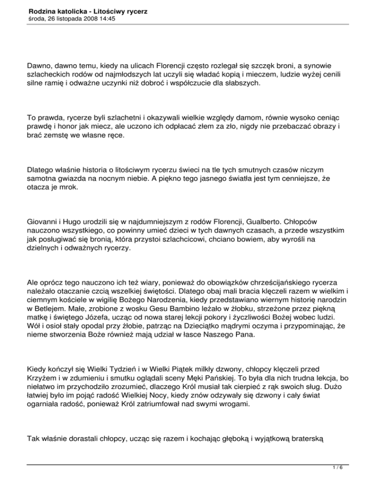 Rodzina katolicka - Litościwy rycerz środa, 26 listopada 2008 14:45 Dawno, dawno temu, kiedy na ulicach Florencji często rozlegał się szczęk broni, a synowie szlacheckich rodów od najmłodszych lat uczyli się władać kopią i mieczem, ludzie wyżej cenili silne ramię i odważne uczynki niż dobroć i współczucie dla słabszych. To prawda, rycerze byli szlachetni i okazywali wielkie względy damom, równie wysoko ceniąc prawdę i honor jak miecz, ale uczono ich odpłacać złem za zło, nigdy nie przebaczać obrazy i brać zemstę we własne ręce. Dlatego właśnie historia o litościwym rycerzu świeci na tle tych smutnych czasów niczym samotna gwiazda na nocnym niebie. A piękno tego jasnego światła jest tym cenniejsze, że otacza je mrok. Giovanni i Hugo urodzili się w najdumniejszym z rodów Florencji, Gualberto. Chłopców nauczono wszystkiego, co powinny umieć dzieci w tych dawnych czasach, a przede wszystkim jak posługiwać się bronią, która przystoi szlachcicowi, chciano bowiem, aby wyrośli na dzielnych i odważnych rycerzy. Ale oprócz tego nauczono ich też wiary, ponieważ do obowiązków chrześcijańskiego rycerza należało otaczanie czcią wszelkiej świętości. Dlatego obaj mali bracia klęczeli razem w wielkim i ciemnym kościele w wigilię Bożego Narodzenia, kiedy przedstawiano wiernym historię narodzin w Betlejem. Małe, zrobione z wosku Gesu Bambino leżało w żłobku, strzeżone przez piękną matkę i świętego Józefa, ucząc od nowa starej lekcji pokory i życzliwości Bożej wobec ludzi. Wół i osioł stały opodal przy żłobie, patrząc na Dzieciątko mądrymi oczyma i przypominając, że nieme stworzenia Boże również mają udział w łasce Naszego Pana. Kiedy kończył się Wielki Tydzień i w Wielki Piątek milkły dzwony, chłopcy klęczeli przed Krzyżem i w zdumieniu i smutku oglądali sceny Męki Pańskiej. To była dla nich trudna lekcja, bo niełatwo im przychodziło zrozumieć, dlaczego Król musiał tak cierpieć z rąk swoich sług. Dużo łatwiej było im pojąć radość Wielkiej Nocy, kiedy znów odzywały się dzwony i cały świat ogarniała radość, ponieważ Król zatriumfował nad swymi wrogami. Tak właśnie dorastali chłopcy, ucząc się razem i kochając głęboką i wyjątkową braterską 1/6 Rodzina katolicka - Litościwy rycerz środa, 26 listopada 2008 14:45 miłością. Byli jedynymi dziećmi w starym ponurym pałacu, dlatego przeżywali wspólnie każdą radość i smutek, jakie im się przydarzyły. Ich życie pełne było radości i słońca, a przyszłość zdawała się szykować dla nich wyłącznie przyjemności, gdy nagle spadł cios, który, zdawało się, na zawsze zgasił światło w życiu Giovanniego. Gdyż Hugo wyruszył pewnego ranka z domu pełen życia i radości, zaś wieczorem został przyniesiony do pałacu z nożem wbitym w serce ręką wroga. Niewykluczone, że wybuchła na mieście jakaś gorąca sprzeczka, ale wiadomo było na pewno tylko tyle, że chłopiec poniósł okrutną śmierć przez zdradę. A choć takie nieszczęście niemal nie dawało się pojąć, rzeczywistość okazywała się aż nadto prawdziwa. Hugo nie żył, zaś w niebo wzbił się głęboki jęk smutku i dziki okrzyk żądzy zemsty. Stary ojciec stał niczym posąg, skamieniały w rozpaczy, zaś załamana matka płakała tak długo, aż zabrakło jej łez. Ale gdy doszli do siebie, zwrócili się oboje do Giovanniego, ich jedynej nadziei, i prosili, by pomścił okrutną śmierć brata. Giovanniemu nie były potrzebne żadne zachęty. Jego serce płonęło gniewem niczym pochodnia, zaś ognia zemsty, jaki błyszczał w jego oczach, nie były w stanie ugasić łzy. Chwycił w mocarną dłoń miecz i patrząc w niebo poprzysiągł, że nie spocznie, ni w dzień ni w nocy, póki nie zgładzi zabójcy swego brata i że go odnajdzie, gdziekolwiek się skrył. Nic nie ocali mordercy od zemsty, na jaką zasłużył. Po tych słowach wyruszył na poszukiwania, zaś wszystkim wydawało się, że w ciągu kilku krótkich godzin lekkomyślny chłopiec zmienił się w poważnego mężczyznę. Była wiosna, ale Giovanniemu wszystkie pory roku wydawały się teraz jednakie. Choć niebo było błękitne a ziemia rozkwitała kwiatami, dla niego równie dobrze mogła panować mroźna zima. Na jego niebie nie było słońca, wszystko zdawało mu się mroczne, rozświetlane jedynie blaskiem rzucanym przez płomień zemsty. Dzień po dniu, godzina po godzinie szukał mordercy, ale nie znajdował nawet śladu swego wroga. Wreszcie opuścił miasto i ruszył dalej, zaś we Florencji rodzice czekali na wieści. Był Wielki Piątek wieczorem, a nad całym światem zdawała się trwać pełna powagi cisza. Ale Giovanni wcale nie zauważył, że dzwony zamilkły i że ich dźwięk nie odmierza już mijających 2/6 Rodzina katolicka - Litościwy rycerz środa, 26 listopada 2008 14:45 godzin. Powoli wspinał się na strome wzgórze drogą, która wiodła od bram miasta do kościoła San Miniato, który musiał minąć w drodze do domu. W połowie wzgórza odchodziła w prawo wąska ścieżka i tu, na tym skrzyżowaniu, Giovanni stanął nagle twarzą w twarz z człowiekiem, którego szukał, zdrajcą, który okrutnie zabił jego brata. Szybko niczym błyskawica wyciągnął miecz, a jego serce napełniła dzika radość. Oto stał przed nim wróg, którego los oddał w jego ręce samotnego i bez broni. Zdrajca nie miał dokąd uciekać i teraz zatriumfuje zemsta. Nieszczęsny człowiek również pojął, że nie ma szans na ucieczkę, nie mógł też walczyć o życie, ponieważ nie miał broni. Zrozumiał, że znalazł się na łasce swego przeciwnika i może zrobić tylko jedno, więc padłszy na kolana zaczął błagać o litość. – Na miłość Chrystusa, błagam cię byś darował mi życie! – wykrzyknął. – Czyż Ten, który w tym dniu zawisł na Krzyżu, by zbawić ludzkość, nie nakazał nam okazywać sobie litości