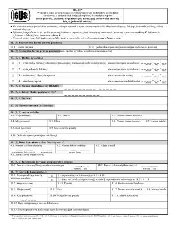 RG-OP Wniosek o wpis do krajowego rejestru urzędowego podmiotów gospodarki narodowej, o zmianę cech objętych wpisem, o skreślenie wpisu osoby prawnej, jednostki organizacyjnej niemającej osobowości prawnej lub jej jednostki lokalnej We wniosku należy podać dane podmiotu, którego wniosek o wpis, zmianę wpisu albo skreślenie dotyczy, lub jego jednostki lokalnej, której wniosek dotyczy. Informacje o podmiocie, tj.: osobie prawnej/jednostce organizacyjnej niemającej osobowości prawnej oznaczone są literą P, informacje o jednostce lokalnej ww. podmiotu – literą L. Wniosek należy wypełnić drukowanymi literami, w przypadku pól wyboru zaznaczyć właściwe pole. 01. (P) Podstawowa forma prawna podmiotu □ 1 – osoba prawna □ 2 – jednostka organizacyjna niemająca osobowości prawnej 02. (P) Szczególna forma prawna podmiotu(np.: spółka cywilna, wspólnota mieszkaniowa) 03. (P, L) Rodzaj zgłoszenia □ 1 – wpis osoby prawnej/jednostki organizacyjnej niemającej osobowości prawnej data rozpoczęcia działalności ____-__-__ □ 2 – wpis jednostki lokalnej data rozpoczęcia działalności ____-__-__ (RRRR – (RRRR – MM – MM – DD) DD) □ 3 – zmiana cech objętych wpisem data zaistnienia zmiany ____-__-__ □ 4 – skreślenie wpisu data zakończenia działalności ____-__-__ 04. (P, L) Numer identyfikacyjny REGON 05. (P, L) Identyfikator podatkowy NIP (RRRR – (RRRR – MM – MM – DD) DD) _________ _____ __________ 06. (P, L) Nazwa 07. (P) Nazwa skrócona (jeśli istnieje) 08. (P, L) Adres siedziby 8.1. Województwo 8.2. Powiat 8.3. Gmina/miasto/dzielnica 8.4. Miejscowość 8.5. Ulica 8.6. Numer nieruchomości 8.8. Kod pocztowy 8.9. Miejscowość poczty 8.7. Numer lokalu _ _- _ _ _ 8.10. Opis nietypowego miejsca lokalizacji 09. (P) Dane kontaktowe (dane fakultatywne )* 9.1. Numer telefonu siedziby 9.2. Numer faksu siedziby ……….……........ bezpośredni lub centrala ……........ wewnętrzny ……….……………………… numer faksu 9.4. Adres strony internetowej 10. (P, L) Informacje dotyczące gospodarstwa rolnego 10.1. Powierzchnia ogólna gospodarstwa rolnego ………. , ……. hektary 11. (P) Adres do korespondencji 11.1. Korespondencję należy kierować na adres 11.2. Województwo □ □ 9.3. Adres e-mail 10.2. Powierzchnia użytków rolnych ary ………. , ……. hektary 1 – wymieniony w informacji nr 8.1 – 8.10 2 – inny lub do skrytki pocztowej; wypełnij odpowiednio informacje nr 11.2 – 11.13 11.3. Powiat 11.4. Gmina/miasto/dzielnica 11.5. Miejscowość 11.6. Ulica 11.7. Numer nieruchomości 11.9. Kod pocztowy 11.10. Miejscowość poczty 11.11. Skrytka pocztowa _ _- _ _ _ ary 11.8. Numer lokalu 11.12. Opis nietypowego miejsca lokalizacji 11.13. Nazwa podmiotu, na którego adres kierowana jest korespondencja * W przypadku wypełnienia pozycji 9.1, 9.2, 9.3, 9.4 informacje w nich podane podlegają udostępnieniu z rejestru REGON zgodnie z art. 45 ust. 1 ustawy z dnia 29 czerwca 1995 r. o statystyce publicznej (Dz. U. z 2012 r. poz. 591, z późn. zm.). 12. (P) Elektroniczny adres do korespondencji Wyrażam zgodę na doręczanie pism za pomocą środków komunikacji elektronicznej na adres e-mail: □ 1 – podany w informacji nr 9.3 □ 2 – inny: ………………………………………… 13. (P) Sposób powstania podmiotu Podmiot powstał □ 1 – jako jednostka nowo zorganizowana □ a) _ _ _ _ _ _ _ _ _ 14. (P, L) Rejestracja 14.1. Podstawa prawna działania 14.2. Nazwa rejestru/ewidencji □ □ □ 2 – na bazie innych podmiotów; w pozycji a–d podaj (maksymalnie cztery) numery identyfikacyjne REGON (9-cyfrowe) i nazwy podmiotów, na których bazie powstał podmiot b) _ _ _ _ _ _ _ _ _ c) _ _ _ _ _ _ _ _ _ d) _ _ _ _ _ _ _ _ _ 1 – rejestracja w organie rejestrowym/ewidencyjnym; wypełnij informacje nr 14.2 – 14.6 2 – powołanie ustawą; wypełnij informację nr 14.6 3 – inna; wypełnij informację nr 14.6 14.3. Nazwa organu rejestrowego/ewidencyjnego 14.4. Numer nadany przez organ rejestrowy/ewidencyjny 14.5. Data wpisu do rejestru/ewidencji ____-__-__ (RRRR – 15. (P) Forma własności Procentowy udział % własności w ogólnej wartości kapitału 14.6. Data powstania podmiotu ____-__-__ DD) własność Skarbu Państwa państwowych osób prawnych jednostek samorządu terytorialnego lub samorządowych osób prawnych □ □ 16. (P) Typ jednostki prawa budżetowego MM – (RRRR – % MM – DD) własność krajowych osób fizycznych pozostałych krajowych jednostek prywatnych osób zagranicznych 1 – jednostka budżetowa 2 – samorządowy zakład budżetowy 17. (L) Czy jednostka lokalna jest samodzielnie bilansująca? □ □ 1 – tak 2 – nie 18. (P) Nazwa organu założycielskiego/nadzorującego 19. (P, L) Przewidywana liczba pracujących ……….. 20. (P, L) Kody wykonywanych rodzajów działalności według Polskiej Klasyfikacji Działalności 1 Rodzaj przeważającej działalności 1 Pozostałe rodzaje działalności (10 i dalsze w załączniku RG-RD) 2 3 4 5 2 Liczba załączników RG-RD _____ _____ _____ _____ _____ (RRRR – a) _ _ _ _ _ _ _ _ _ □ □ wykreślenie 7 □ wykreślenie 8 □ wykreślenie 9 □ wykreślenie _____ _____ _____ _____ □ wykreślenie □ wykreślenie □ wykreślenie 22. (P, L) Data wznowienia działalności ____-__-__ □ 6 ____ 21. (P, L) Data zawieszenia działalności 23. (P) Sposób likwidacji Podmiot został zlikwidowany □ wykreślenie MM – DD) ____-__-__ (RRRR – MM – DD) 1 – całkowicie 2 – w wyniku podziału, połączenia i innych przekształceń; w poz. a–d podaj (maksymalnie cztery) numery identyfikacyjne REGON (9-cyfrowe) i nazwy następców prawnych b) _ _ _ _ _ _ _ _ _ c) _ _ _ _ _ _ _ _ _ d) _ _ _ _ _ _ _ _ _ 24. (P) Liczba załączników RG-SC ____ ................................................................................................. .................................... ...................................