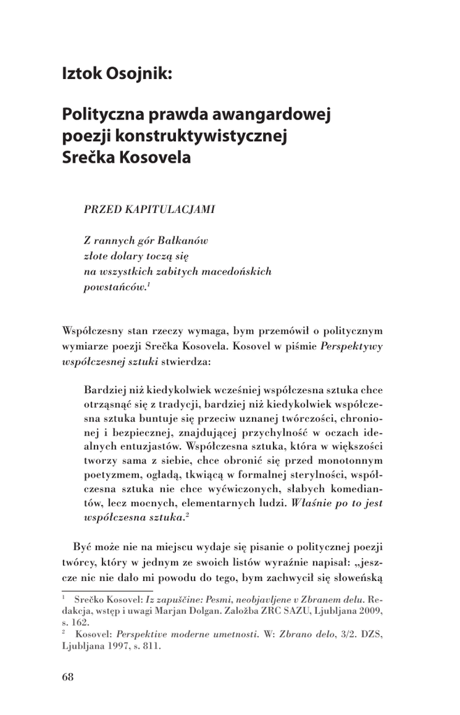 Iztok Osojnik: Polityczna prawda awangardowej poezji konstruktywistycznej Srečka Kosovela PRZED KAPITULACJAMI Z rannych gór Bałkanów złote dolary toczą się na wszystkich zabitych macedońskich powstańców.1 Współczesny stan rzeczy wymaga, bym przemówił o politycznym wymiarze poezji Srečka Kosovela. Kosovel w piśmie Perspektywy współczesnej sztuki stwierdza: Bardziej niż kiedykolwiek wcześniej współczesna sztuka chce otrząsnąć się z tradycji, bardziej niż kiedykolwiek współczesna sztuka buntuje się przeciw uznanej twórczości, chronionej i bezpiecznej, znajdującej przychylność w oczach idealnych entuzjastów. Współczesna sztuka, która w większości tworzy sama z siebie, chce obronić się przed monotonnym poetyzmem, ogładą, tkwiącą w formalnej sterylności, współczesna sztuka nie chce wyćwiczonych, słabych komediantów, lecz mocnych, elementarnych ludzi. Właśnie po to jest współczesna sztuka.2 Być może nie na miejscu wydaje się pisanie o politycznej poezji twórcy, który w jednym ze swoich listów wyraźnie napisał: „jeszcze nic nie dało mi powodu do tego, bym zachwycił się słoweńską 1 Srečko Kosovel: Iz zapuščine: Pesmi, neobjavljene v Zbranem delu. Redakcja, wstęp i uwagi Marjan Dolgan. Založba ZRC SAZU, Ljubljana 2009, s. 162. 2 Kosovel: Perspektive moderne umetnosti. W: Zbrano delo, 3/2. DZS, Ljubljana 1997, s. 811. 68 współczesnością na którejkolwiek płaszczyźnie (wziąwszy również pod uwagę płaszczyznę polityczną, która nas jednak nie interesuje)”3 (podkreślenie – I.O.). Stwierdzenie to musimy jednakże przyjąć z rezerwą. Ktokolwiek zna entuzjazm Kosovela związany z jego działalnością w Klubie Ivan Cankar wie, że poeta był wyjątkowo zaangażowanym społecznie intelektualistą i artystą, o czym świadczy również jego ostatni odczyt pt. Sztuka i proletariusz, wygłoszony 23 lutego 1926 w Zagorju4. Wyżej wymienione stwierdzenie Kosovela trzeba zatem gruntownie przemyśleć w świetle jego wyraźnego i manifestowanego zaangażowania politycznego. Zapewne miał na myśli specyficzne, wąskie pojmowanie tego, co polityczne, które uznawał za niewystarczające, kontynuując bowiem odczyt w Zagorju jasno zaznaczył, że liczy się tylko ten artysta, „który przyłączył się do tegoż ruchu, również walczącego o pełną wolność człowieka, o pełne prawa człowieka, ruchu toczącego walkę klas o społeczeństwo bezklasowe...”5. Najwyraźniej słoweńska polityka, odrzucona przez poetę wcześniej w liście, nie spełniała wymienionych żądań. I właśnie dlatego nie miało sensu zajmować się nią poważnie. Porównując daty obu wypowiedzi widzimy, że między nimi minęło tylko pół roku. Również w innych artykułach z tego okresu widać, że Kosovel był bardzo zaangażowany politycznie, nie chodzi więc tutaj o przemianę w jego światopoglądzie i pracy, lecz o dwie rozmijające się wizje tego, co polityczne. I właśnie biorąc od uwagę różnice w obu pojmowaniach tego, co polityczne, być może uda nam się dogłębnie zrozumieć autentyczne estetyczne sedno poezji Kosovela, właściwy polityczny wymiar jego poezji, która „tworzy w większości sama z siebie”. Najwyraźniej właśnie przez rozważania o przeciwstawnej naturze obu pojmowań tego, co polityczne w poezji, można dotrzeć do zrozumienia, czym jest 3 Kosovel: Pismo Cirilu Debevcu z 9/VII 1925 (List do Cirila Debevca z 9 VII 1925). W: Izbrana pisma. Wybór Ludwig Hartinger. Mladinska knjiga, Ljubljana 2006 (Klasiki Kondorja, 47), s. 210. 4 Miasto w środkowej Słowenii, gdzie 23 lutego 1926r. Kosovel wygłosił odczyt poprzedzający wieczór poetycki, zorganizowany przez kółko literacko-teatralne Klub „Ivan Cankar”. To właśnie po tym odczycie poeta czekając cała noc na pociąg przeziębił się. Mimo troskliwej opieki w rodzinnym Tomaju, choroba rozwinęła się w zapalenie opon mózgowych, które było bezpośrednim powodem przedwczesnej śmierci poety 27 maja 1926 roku. (Przyp. tłum.) 5 Kosovel: Zbrano delo, 3/1. DZS, Ljubljana 1977, s. 24. 69 poezja polityczna jako indywidualna struktura estetyczna. Dzięki temu zdobędziemy więc klucz do zrozumienia, jak nie odczytywać poezji Kosovela jako politycznej w sensie programowym, przedstawieniowym, lecz w sensie poetyckim, zaangażowanym. Dopiero na podstawie tych wniosków będziemy mogli powiedzieć coś również o zapomnieniu lub stłumieniu „agonistycznej” sprzeczności poezji jako jej podstawowej polityczności. Najpierw powinienem wyjaśnić niektóre pojęcia, za pomocą których będę analizował wyżej zarysowaną sytuację. W części teoretycznej tego eseju na temat sprzecznej w zasadzie natury poezji i jej politycznej determinacji opieram się na teoretycznych rozważaniach francuskiego filozofa Jacques’a Rancière’a. Zobaczmy, jak widzi politykę literatury: Polityka literatury nie jest polityką jej autorów. Nie zajmuje się osobistym zaangażowaniem w sprawy społeczne i polityczne oraz spory przypadającego czasu. Nie zajmuje się nawet sposobami reprezentacji wydarzeń politycznych lub też struktur społecznych i walk społecznych w ich książkach. Syntagma „polityka literatury” oznacza, że literatura „uprawia” politykę jak literaturę – że istnieje szczególny związek między polityką jako określonym sposobem działania oraz literaturą jako określonym sposobem pisania.6 Różnicowania tego mogę użyć również do omówienia ostatniej fazy poezji Kosovela, dla której charakterystyczny jest na przykład cykl pt. Rdeči atom (Czerwony atom). Zarówno to poetyzowanie zapatrzone w polityczny aktywizm i „propagandową tendencyjność”, jak również odczyt w Zagorju, oznaczają pewne przesunięcie w tym, co nazywamy poezją polityczną, a mianowicie przesunięcie z powrotem do literatury przedstawieniowej7, która 6 Jacques Rancière: Od aktualnosti komunizma do njegove neaktualnosti. Prze