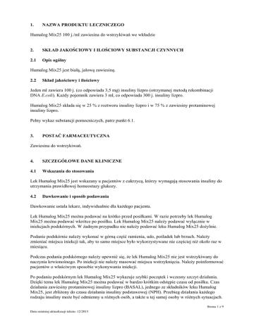 1. NAZWA PRODUKTU LECZNICZEGO Humalog Mix25 100 j./ml zawiesina do wstrzykiwań we wkładzie 2. SKŁAD JAKOŚCIOWY I ILOŚCIOWY SUBSTANCJI CZYNNYCH 2.1 Opis ogólny Humalog Mix25 jest białą, jałową zawiesiną. 2.2 Skład jakościowy i ilościowy Jeden ml zawiera 100 j. (co odpowiada 3,5 mg) insuliny lizpro (otrzymanej metodą rekombinacji DNA E.coli). Każdy pojemnik zawiera 3 ml, co odpowiada 300 j. insuliny lizpro. Humalog Mix25 składa się w 25 % z roztworu insuliny lizpro i w 75 % z zawiesiny protaminowej insuliny lizpro. Pełny wykaz substancji pomocniczych, patrz punkt 6.1. 3. POSTAĆ FARMACEUTYCZNA Zawiesina do wstrzykiwań. 4. SZCZEGÓŁOWE DANE KLINICZNE 4.1 Wskazania do stosowania Lek Humalog Mix25 jest wskazany u pacjentów z cukrzycą, którzy wymagają stosowania insuliny do utrzymania prawidłowej homeostazy glukozy. 4.2 Dawkowanie i sposób podawania Dawkowanie ustala lekarz, indywidualnie dla każdego pacjenta. Lek Humalog Mix25 można podawać na krótko przed posiłkami. W razie potrzeby lek Humalog Mix25 można podawać wkrótce po posiłku. Lek Humalog Mix25 należy podawać wyłącznie w iniekcjach podskórnych. W żadnym przypadku nie należy podawać leku Humalog Mix25 dożylnie. Podanie podskórnie należy wykonać w górną część ramienia, udo, pośladek lub brzuch. Należy zmieniać miejsca iniekcji tak, aby to samo miejsce było wykorzystywane nie częściej niż około raz w miesiącu. Podczas podania podskórnego należy upewnić się, że lek Humalog Mix25 nie jest wstrzykiwany do naczynia krwionośnego. Po iniekcji nie należy masować miejsca wstrzyknięcia. Należy poinformować pacjentów o właściwym sposobie wykonywania iniekcji. Po podaniu podskórnym lek Humalog Mix25 wykazuje szybki początek i wczesny szczyt działania. Dzięki temu lek Humalog Mix25 można podawać w bardzo krótkim odstępie czasu od posiłku. Czas działania zawiesiny protaminowej insuliny lizpro (BASAL), jednego ze składników leku Humalog Mix25, jest zbliżony do czasu działania insuliny podstawowej (NPH). Przebieg działania każdego rodzaju insuliny może być odmienny u różnych osób, a także u tej samej osoby w różnych sytuacjach. Strona 1 z 9 Data ostatniej aktualizacji tekstu: 12/2015 Podobnie jak w przypadku wszystkich innych rodzajów insuliny, czas działania leku Humalog Mix25 zależy od wielkości dawki, miejsca iniekcji, ukrwienia, temperatury i aktywności fizycznej 4.3 Przeciwwskazania Nadwrażliwość na insulinę lizpro lub na którąkolwiek substancję pomocniczą. Hipoglikemia. 4.4 Specjalne ostrzeżenia i środki ostrożności dotyczące stosowania W żadnym przypadku nie należy podawać leku Humalog Mix25 dożylnie. Zmianę typu lub marki stosowanej u pacjenta insuliny należy przeprowadzać pod ścisłym nadzorem lekarza. Zmiana mocy, marki (producenta), typu (krótkodziałająca, NPH, lente itp.), pochodzenia (insulina zwierzęca, ludzka, analog insuliny ludzkiej) i (lub) metody produkcji (rekombinacja DNA lub insulina pochodzenia zwierzęcego) może spowodować konieczność modyfikacji dawki. Sytuacje, które mogą spowodować zmianę lub osłabienie wczesnych objawów ostrzegawczych hipoglikemii: długotrwała cukrzyca, intensywna insulinoterapia, neuropatia cukrzycowa, przyjmowanie niektórych leków, np. beta-adrenolityków. Niektórzy pacjenci, u których po zmianie insuliny pochodzenia zwierzęcego na insulinę ludzką wystąpiła hipoglikemia, zgłaszali, że wczesne objawy ostrzegawcze hipoglikemii były słabiej wyrażone lub zupełnie inne niż odczuwane w przypadku stosowania poprzedniej insuliny. Niewyrównana hipoglikemia lub hiperglikemia może prowadzić do utraty przytomności, śpiączki lub zgonu. Stosowanie nieodpowiednich dawek lub przerwanie leczenia, zwłaszcza w przypadku cukrzycy insulinozależnej, może prowadzić do hiperglikemii i kwasicy ketonowej – stanów, które potencjalnie mogą być śmiertelne. W przypadku zaburzenia czynności nerek zapotrzebowanie na insulinę może być zmniejszone. W przypadku zaburzenia czynności wątroby, ze względu na ograniczenie zdolności wątroby do glukoneogenezy i osłabienie procesu rozkładu insuliny, zapotrzebowanie na insulinę może być zmniejszone. Jednakże, u pacjentów z przewlekłymi zaburzeniami czynności wątroby wzrost oporności na insulinę może spowodować zwiększenie zapotrzebowania organizmu na insulinę. Zapotrzebowanie na insulinę może być zwiększone podczas choroby lub zaburzeń emocjonalnych. Modyfikacja dawki może być również konieczna w przypadku, gdy pacjenci podejmują bardziej intensywny wysiłek fizyczny lub zmieniają sposób odżywiania. Ćwiczenia wykonywane bezpośrednio po posiłku mogą zwiększyć prawdopodobieństwo hipoglikemii. Podanie insuliny lizpro dzieciom poniżej 12 lat można rozważyć jedynie, gdy spodziewane są większe korzyści niż w przypadku stosowania insuliny krótkodziałającej. Jednoczesne stosowanie produktu Humalog Mix25 z pioglitazonem: Zgłaszano przypadki niewydolności serca w czasie jednoczesnego stosowania insuliny i pioglitazonu, szczególnie u pacjentów z czynnikami ryzyka niewydolności serca. Należy o tym pamiętać przed zastosowaniem leczenia skojarzonego insuliną Humalog Mix25 z pioglitazonem. W przypadku leczenia skojarzonego należy obserwować, czy u pacjentów nie występują objawy przedmiotowe i podmiotowe niewydolności serca, zwiększenie masy ciała i obrzęki. Jeśli wystąpi nasilenie objawów ze strony układu krążenia, należy przerwać stosowanie pioglitazonu. Strona 2 z 9 Data ostatniej aktualizacji tekstu: 12/2015 Instrukcja użycia i postępowania Aby uniknąć ewentualnego przeniesienia chorób, każdy wkład może być używany tylko przez jedną osobę, nawet, gdy igła na wstrzykiwaczu została zmieniona. 4.5 Interakcje z innymi produktami leczniczymi i inne rodzaje interakcji Zapotrzebowanie na insulinę może wzrosnąć pod wpływem substancji o działaniu h