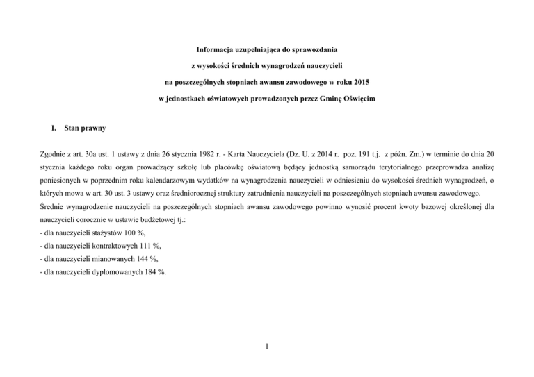 Informacja uzupełniająca do sprawozdania z wysokości średnich wynagrodzeń nauczycieli na poszczególnych stopniach awansu zawodowego w roku 2015 w jednostkach oświatowych prowadzonych przez Gminę Oświęcim I. Stan prawny Zgodnie z art. 30a ust. 1 ustawy z dnia 26 stycznia 1982 r. - Karta Nauczyciela (Dz. U. z 2014 r. poz. 191 t.j. z późn. Zm.) w terminie do dnia 20 stycznia każdego roku organ prowadzący szkołę lub placówkę oświatową będący jednostką samorządu terytorialnego przeprowadza analizę poniesionych w poprzednim roku kalendarzowym wydatków na wynagrodzenia nauczycieli w odniesieniu do wysokości średnich wynagrodzeń, o których mowa w art. 30 ust. 3 ustawy oraz średniorocznej struktury zatrudnienia nauczycieli na poszczególnych stopniach awansu zawodowego. Średnie wynagrodzenie nauczycieli na poszczególnych stopniach awansu zawodowego powinno wynosić procent kwoty bazowej określonej dla nauczycieli corocznie w ustawie budżetowej tj.: - dla nauczycieli stażystów 100 %, - dla nauczycieli kontraktowych 111 %, - dla nauczycieli mianowanych 144 %, - dla nauczycieli dyplomowanych 184 %. 1 Określona w ustawie budżetowej kwota bazowa w odniesieniu do 2015 r. wynosiła: od 1 stycznia do 31 grudnia 2.717,59 zł, Średnie wynagrodzenie nauczycieli na poszczególnych stopniach awansu zawodowego powinno kształtować się na poziomie: od 1 stycznia do 31 grudnia Nauczyciel stażysta Nauczyciel kontraktowy Nauczyciel mianowany Nauczyciel dyplomowany 2.717,59 3.016,52 3.913,33 5.000,37 SKŁADNIKI WYNAGRODZENIA NAUCZYCIELI UWZGLĘDNIANE DO WYSOKOŚCI ŚREDNICH WYNAGRODZEŃ Zgodnie z art. 30 ust. 1 ustawy - Karta Nauczyciela, wynagrodzenie nauczycieli składa się z: 1. wynagrodzenia zasadniczego; 2. dodatków: za wysługę lat, motywacyjnego, funkcyjnego oraz za warunki pracy; 3. wynagrodzenia za godziny ponadwymiarowe i godziny doraźnych zastępstw; 4. nagród i innych świadczeń wynikających ze stosunku pracy, z wyłączeniem świadczeń z zakładowego funduszu świadczeń socjalnych (art. 53) i dodatków socjalnych (art. 54). Świadczenia wynikające ze stosunku pracy: dodatki za warunki pracy, odprawy emerytalne, nagrody jubileuszowe, dodatkowe wynagrodzenie roczne (tzw. trzynastka) wynagrodzenie za pracę w nocy, zasiłek na zagospodarowanie, nagrody ze specjalnego funduszu nagród. 2 W przypadku nieosiągnięcia w roku 2015 wysokości średnich wymaganych wynagrodzeń, o których mowa powyżej, organ prowadzący szkołę, będący jednostką samorządu terytorialnego, ustala kwotę różnicy między wydatkami poniesionymi na wynagrodzenia nauczycieli w danym roku, a minimalnymi wydatkami na ten cel wymaganymi przepisami Karty Nauczyciela. Zgodnie z art. 30a ust. 3 Karty Nauczyciela tak wyliczona kwota różnicy jest dzielona między nauczycieli zatrudnionych i pobierających wynagrodzenie w roku, dla którego ustalono kwotę różnicy i wypłacana w terminie do dnia 31 stycznia roku następnego, w formie jednorazowego dodatku uzupełniającego. W terminie do dnia 10 lutego roku kalendarzowego następującego po roku, który podlegał analizie, organ prowadzący szkołę lub placówkę sporządza sprawozdanie z wysokości średnich wynagrodzeń nauczycieli na poszczególnych stopniach awansu zawodowego, z uwzględnieniem wysokości kwoty różnicy, o której mowa powyżej. Sprawozdanie to podlega przekazaniu, w terminie 7 dni od sporządzenia, Radzie Gminy Oświęcim, Regionalnej Izbie Obrachunkowej, dyrektorom jednostek oświatowych oraz związkom zawodowym zrzeszającym nauczycieli. Obwiązujący, jednolity wzór druku sprawozdania określa rozporządzenie Ministra Edukacji Narodowej z dnia 13 stycznia 2010 r. w sprawie sposobu opracowania sprawozdania z wysokości średnich wynagrodzeń nauczycieli na poszczególnych stopniach awansu zawodowego w szkołach prowadzonych przez jednostki samorządu terytorialnego (Dz. U. z 2010 Nr 6, poz. 35). II. Wydatki poniesione na wynagrodzenia nauczycieli w 2015 r. w jednostkach oświatowych prowadzonych przez Gminę Oświęcim. W wyniku przeprowadzonej analizy płac, stwierdzono iż, płace nauczycieli w Gminie Oświęcim w 2015 r. nie osiągnęły kwoty minimalnej określonej przepisami Karty Nauczyciela za wyjątkiem płac dla nauczycieli kontraktowych i dyplomowanych. Ustalono kwotę różnicy między wydatkami poniesionymi na wynagrodzenia nauczycieli w danym roku, a minimalnymi wydatkami na ten cel wymaganymi przepisami Karty Nauczyciela. Wydatki poniesione w 2015 r. na wynagrodzenia pracowników pedagogicznych zatrudnionych w jednostkach oświatowych prowadzonych przez Gminę Oświęcim wyniosły ogółem 9.902.368,41 zł, 3 Jednorazowy dodatek uzupełniający w roku 2015 wyniósł 33.904,54 zł Poniższa tabela przedstawia wysokość średnich wynagrodzeń nauczycieli wg stopni awansu zawodowego w Gminie Oświęcim w 2015r. Stopnie awansu zawodowego Liczba etatów (średnioroczna) Minimalne roczne wydatki, jakie powinny być poniesione na wynagrodzenia 1 2 3 4 1 2 3 4 Stażyści kontraktowi mianowani dyplomowani razem Lp. 9,04 22,91 24,14 126,91 183,00 294.912,87 829.181,02 1.133.769,97 7.615.363,50 9.873.227,36 Faktycznie poniesione wydatki na wynagrodzeni a nauczycieli Ogółem środki przeznaczone na wypłatę jednorazowego dodatku wyrównawczego (kol. 4 - kol.5) Ogółem środki przeznaczone na wynagrodzenia ponad minimum określone w KN (kol.4 –kol. 5) M-czna kwota dodatku uzupełniającego w przeliczeniu na 1 et. Nadwyżka wynagrodzenia ponad minimum określone w KN w przeliczeniu na 1 et. 5 6 7 10 11 282.009,77 865.990,61 1.112.768,53 7.641.599,50 9.902.368,41 12.903,10 0,00 21.001,44 0,00 33.904,54 4 0,00 36.806,59 0,00 26.236,00 63.042,59 118,94 0,00 72,50 0,00 x 0,00 133,88 0,00 17,23 x Średnie wynagrodzenie w 2015 6 000,00 5 017,73 5 000,37 5 000,00 3 841,37 4 000,00 3 149,97 3 000,00 2 599,65 3 913,33 3 016,52 2 717,59 2 000,00 1 000,00 stażyści kontraktowi mianowani średnie wynagrodzen