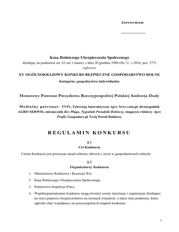 Zatwierdzam ........................... Kasa Rolniczego Ubezpieczenia Społecznego działając na podstawie art. 63 ust.1 ustawy z dnia 20 grudnia 1990 (Dz. U. z 2016, poz. 277) ogłasza XV OGÓLNOKRAJOWY KONKURS BEZPIECZNE GOSPODARSTWO ROLNE Kategoria: gospodarstwa indywidualne Honorowy Patronat Prezydenta Rzeczypospolitej Polskiej Andrzeja Dudy M e d i a l n y p a t r o n a t : TVP1, Telewizja Interaktywna Agro News com.pl, dwutygodnik AGRO SERWIS, miesięcznik Bez Pługa, Tygodnik Poradnik Rolniczy, magazyn rolniczy Agro Profil, Gospodarz.pl Twój Portal Rolniczy REGULAMIN KONKURSU §1 Cel Konkursu Celem Konkursu jest promocja zasad ochrony zdrowia i życia w gospodarstwach rolnych. §2 Organizatorzy Konkursu 1. Ministerstwo Rolnictwa i Rozwoju Wsi. 2. Kasa Rolniczego Ubezpieczenia Społecznego. 3. Państwowa Inspekcja Pracy. 4. Współorganizatorami konkursu mogą również zostać instytucje i organizacje działające na rzecz poprawy bezpieczeństwa na terenach wiejskich, a także inne podmioty, które zgłosiły chęć współpracy na poszczególnych etapach konkursu. 1 §3 Uczestnicy i zgłoszenie udziału w Konkursie 1. Do konkursu mogą być zgłaszane gospodarstwa, których właścicielami są osoby pełnoletnie prowadzące produkcyjną działalność rolniczą, ubezpieczone w KRUS (przynajmniej jeden z właścicieli). 2. W konkursie nie mogą uczestniczyć gospodarstwa, które już zdobyły miano najbezpieczniejszego gospodarstwa w kraju, tj. zwycięzcy poprzednich edycji Ogólnokrajowego Konkursu Bezpieczne Gospodarstwo Rolne. Przez okres kolejnych pięciu lat udziału w konkursie nie mogą brać zdobywcy II i III miejsca w finale krajowym, a przez okres dwóch kolejnych lat nie mogą brać udziału gospodarstwa sklasyfikowane w etapach regionalnych i wojewódzkich na miejscach I-III. 3. Zgłoszenia dokonuje się na formularzu, który stanowi załącznik nr 1 do Regulaminu. Wypełniony i podpisany formularz należy złożyć w najbliższej Placówce Terenowej lub Oddziale Regionalnym KRUS w nieprzekraczalnym terminie do 31 marca 2017 r. 4. Formularze zgłoszeniowe dostępne są w PT i OR KRUS, w prasie, na stronie internetowej KRUS oraz u współorganizatorów i patronów medialnych konkursu. §4 Kryteria oceny 1. Podstawą oceny gospodarstw są stwierdzone w nich zagrożenia. Komisje regionalna i wojewódzka odnotowują zagrożenia w „Arkuszu oceny gospodarstwa” (załącznik nr 2 Regulaminu). 2. Przy ocenie brane są pod uwagę: 1) ład i porządek w obrębie podwórza, zabudowań i stanowisk pracy, 2) stan budynków inwentarskich i gospodarczych, w tym: schodów i używanych drabin oraz instalacji i urządzeń elektrycznych, 3) wyposażenie maszyn i urządzeń używanych w gospodarstwie w osłony ruchomych części, podpory i inne zabezpieczenia przed wypadkami, 4) stan techniczny maszyn i urządzeń stosowanych w gospodarstwie, 5) warunki obsługi i bytowania zwierząt gospodarskich, 6) stosowanie, stan i jakość środków ochrony osobistej, 7) rozwiązania organizacyjne, technologiczne i techniczne wpływające na bezpieczeństwo osób pracujących i przebywających w gospodarstwie rolnym, 2 8) estetyka gospodarstw. 3 §5 Organizacja Konkursu 1. Postanowienia ogólne. 1) Konkurs zostanie ogłoszony w styczniu 2017 roku. Konkurs ma charakter ogólnokrajowy i przebiega co najmniej w trzech etapach. Za przebieg poszczególnych etapów odpowiedzialne są komisje konkursowe. 2) Komisję regionalną i wojewódzką powołuje dyrektor OR KRUS w porozumieniu z kierownikami PT i współorganizatorami. 3) Centralną Komisję Konkursową powołuje Prezes KRUS na wniosek Dyrektora Biura Prewencji i Rehabilitacji. Komisja ta nadzoruje przebieg Konkursu, odpowiada za przeprowadzenie etapu krajowego. 4) Komisje konkursowe etapu regionalnego i wojewódzkiego wizytują gospodarstwa, wyłaniają laureatów poszczególnych etapów, sporządzają protokóły z posiedzenia Komisji i przesyłają kopie do komisji konkursowej wyższego szczebla wraz z „Arkuszami oceny gospodarstw” i dokumentacją zdjęciową gospodarstw zwycięzców danego etapu. 5) Organizatorzy poszczególnych etapów Konkursu współuczestniczą w pokrywaniu kosztów organizacyjnych i zakupu nagród na zasadach uzgodnionych ze sobą. Organizatorzy mogą pozyskiwać nagrody od sponsorów. 6) Placówki Terenowe/Oddziały Regionalne KRUS oraz Biuro Prewencji i Rehabilitacji Centrali Kasy pełnią odpowiednio rolę sekretariatów komisji konkursowych i udostępniają swoje adresy do korespondencji związanej z Konkursem. 2. Rozstrzygnięcie Konkursu. 1) Etap regionalny Konkursu trwa od dnia jego ogłoszenia i nie dłużej niż do 19 maja 2017 roku. Obejmuje zasięgiem obszar działania wyznaczony przez Dyrektora Oddziału Regionalnego. Liczba uczestników jest nieograniczona. Komisja Regionalna wyłania laureatów i przekazuje do 25 maja 2017 roku dokumentację gospodarstw do Komisji Wojewódzkiej. 2) Etap wojewódzki Konkursu trwa nie dłużej niż do 16 czerwca 2017 roku. Uczestniczą w nim laureaci etapów regionalnych. 3) Komisja wojewódzka zapoznaje się z nadesłanymi „Arkuszami ocen gospodarstw” i dokumentacją zdjęciową. Przeprowadza wizytacje gospodarstw i ponownie ocenia gospodarstwa wg „Arkusza oceny gospodarstwa”. Wyłania zwycięzcę etapu wojewódzkiego Konkursu i przesyła do 23 czerwca 2017 roku do Centralnej Komisji 4 Konkursowej „Arkusze oceny gospodarstwa” wraz z protokołem z posiedzenia wojewódzkiej Komisji Konkursowej, dokumentacją zdjęciową z etapu regionalnego i wojewódzkiego. 4) Centralna Komisja Konkursowa zapoznaje się z dokumentacją z etapu regionalnego i wojewódzkiego, a w lipcu 2017 roku przeprowadza wizytacje 16. gospodarstw – zwycięzców etapów wojewódzkich Konkursu, a następnie w oparciu o własną ocenę udokumentowaną m.in. zdjęciami wyłania zwycięzcę – właściciela/i najbezpieczniejszego gospodarstwa w kraju i kolejnych laureatów finału konkursu.