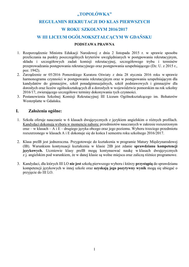 „TOPOLÓWKA” REGULAMIN REKRUTACJI DO KLAS PIERWSZYCH W ROKU SZKOLNYM 2016/2017 W III LICEUM OGÓLNOKSZTAŁCĄCYM W GDAŃSKU PODSTAWA PRAWNA 1. Rozporządzenie Ministra Edukacji Narodowej z dnia 2 listopada 2015 r. w sprawie sposobu przeliczania na punkty poszczególnych kryteriów uwzględnianych w postępowaniu rekrutacyjnym, składu i szczegółowych zadań komisji rekrutacyjnej, szczegółowego trybu i terminów przeprowadzania postępowania rekrutacyjnego oraz postępowania uzupełniającego (Dz. U. z 2015 r., poz. 1942). 2. Zarządzenie nr 05/2016 Pomorskiego Kuratora Oświaty z dnia 28 stycznia 2016 roku w sprawie harmonogramu czynności w postępowaniu rekrutacyjnym oraz w postępowaniu uzupełniającym dla kandydatów do gimnazjów, szkół ponadgimnazjalnych, szkół podstawowych i gimnazjów dla dorosłych oraz liceów ogólnokształcących dl a dorosłych w województwie pomorskim na rok szkolny 2016/17, zwierającego szczegółowe terminy dokonywania tych czynności. 3. Postanowienia Szkolnej Komisji Rekrutacyjnej III Liceum Ogólnokształcącego im. Bohaterów Westerplatte w Gdańsku. I. Założenia ogólne: 1. Szkoła oferuje nauczanie w 6 klasach dwujęzycznych z językiem angielskim o różnych profilach. Kandydaci dokonują wyboru w momencie naboru: przedmiotów nauczanych w zakresie rozszerzonym oraz – w klasach – A i E – drugiego języka obcego oraz jego poziomu. Wyboru trzeciego przedmiotu rozszerzonego w klasach A i E dokonuje się do końca I semestru roku szkolnego 2016/2017. 2. Klasa preIB jest jednoroczna. Przygotowuje do kształcenia w programie Matury Międzynarodowej (IB). Warunkiem kontynuacji kształcenia w klasie 2IB jest zdanie sprawdzianu kompetencji językowych. Uczniowie klasy preIB mogą kontynuować naukę w klasach dwujęzycznych z j. angielskim pod warunkiem, że w danej klasie są wolne miejsca oraz zaliczą różnice programowe. 3. Kandydaci, dla których III LO nie jest szkołą pierwszego wyboru i którzy przystąpią do sprawdzianu kompetencji językowych w innej szkole oraz uzyskają jego pozytywny wynik mogą się ubiegać o przyjęcie do III LO. 1 II. W roku szkolnym 2016/2017 proponujemy następujące klasy: KLASA „A” – DWUJĘZYCZNA Z J. ANGIELSKIM, ekonomiczna Przedmioty z rozszerzonym programem nauczania: • • • • MATEMATYKA (19h w cyklu trzyletnim) J. HISZPAŃSKI lub J. NIEMIECKI (początkujący lub kontynuacja)* Przedmioty rozszerzone do wyboru: WOS lub FIZYKA lub BIOLOGIA lub GEOGRAFIA. Nauczane języki: angielski (18h w cyklu trzyletnim), hiszpański lub niemiecki (13h w cyklu trzyletnim). • Przedmioty nauczane dwujęzycznie: min. dwa w każdym roku nauki, w zależności od wyborów ucznia i możliwości organizacyjnych szkoły • UWAGA! Obowiązuje sprawdzian kompetencji językowych z j. angielskiego; krótszy termin składania wniosków rekrutacyjnych! * początkujący – dla kandydatów, którzy nie uczyli się danego języka, kontynuacja – dla kandydatów, którzy chcą kontynuować naukę drugiego języka obcego KLASA „B” – DWUJĘZYCZNA Z J. ANGIELSKIM , biologiczno - chemiczna Przedmioty z rozszerzonym programem nauczania: • • • • • • BIOLOGIA (13h w cyklu trzyletnim) CHEMIA (12h w cyklu trzyletnim) Nauczane języki: angielski (18h w cyklu trzyletnim) i niemiecki (6h w cyklu trzyletnim). Dodatkowe godziny z matematyki (13h w cyklu trzyletnim). Przedmioty nauczane dwujęzycznie: biologia, chemia. UWAGA! Obowiązuje sprawdzian kompetencji językowych z j. angielskiego; krótszy termin składania wniosków rekrutacyjnych! KLASA „C” – DWUJĘZYCZNA Z J. ANGIELSKIM, humanistyczno - prawna Przedmioty z rozszerzonym programem nauczania: • • • • • • J. POLSKI (21h w cyklu trzyletnim) HISTORIA (12h w cyklu trzyletnim) WOS ( 7h w cyklu trzyletnim) Nauczane języki: angielski (18h w cyklu trzyletnim) i francuski (6h w cyklu trzyletnim). Przedmiot uzupełniający: podstawy prawa. Przedmioty nauczane dwujęzycznie: min. dwa w każdym roku nauki, w zależności od wyborów ucznia i możliwości organizacyjnych szkoły • UWAGA! Obowiązuje sprawdzian kompetencji językowych z j. angielskiego; krótszy termin składania wniosków rekrutacyjnych! 2 KLASA „D” – DWUJĘZYCZNA Z J. ANGIELSKIM, matematyczno - fizyczna Przedmioty z rozszerzonym programem nauczania: • MATEMATYKA (22h w cyklu trzyletnim) • FIZYKA (12h w cyklu trzyletnim) • Nauczane języki: angielski (18h w cyklu trzyletnim) i niemiecki lub hiszpański (6h w cyklu trzyletnim). • Przedmiot uzupełniający: grafika i multimedia - wykorzystanie nowoczesnych technologii; projektowanie stron www. • Przedmioty nauczane dwujęzycznie: min. dwa w każdym roku nauki, w zależności od wyborów ucznia i możliwości organizacyjnych szkoły • UWAGA! Obowiązuje sprawdzian kompetencji językowych z j. angielskiego; krótszy termin składania wniosków rekrutacyjnych! KLASA „E" - DWUJĘZYCZNA Z J. ANGIELSKIM, lingwistyczna Przedmioty z rozszerzonym programem nauczania: • • • • J. POLSKI (21h w cyklu trzyletnim) J. HISZPAŃSKI lub J. NIEMIECKI (początkujący lub kontynuacja)* Przedmioty rozszerzone do wyboru: WOS lub HISTORIA lub BIOLOGIA lub GEOGRAFIA. Nauczane języki: angielski (18h w cyklu trzyletnim), hiszpański lub niemiecki (13h w cyklu trzyletnim). • Przedmioty nauczane dwujęzycznie: min. dwa w każdym roku nauki, w zależności od wyborów ucznia i możliwości organizacyjnych szkoły • UWAGA! Obowiązuje sprawdzian kompetencji językowych z j. angielskiego; krótszy termin składania wniosków rekrutacyjnych! * początkujący – dla kandydatów, którzy nie uczyli się danego języka, kontynuacja – dla kandydatów, którzy chcą kontynuować naukę drugiego języka obcego KLASA „preIB” - DWUJĘZYCZNA Z J. ANGIELSKIM, przygotowująca do programu dyplomowego matury międzynarodowej • Tylko dla uczniów, którzy od II klasy chcą uczestniczyć w programie dyplomowym matury międzynarod