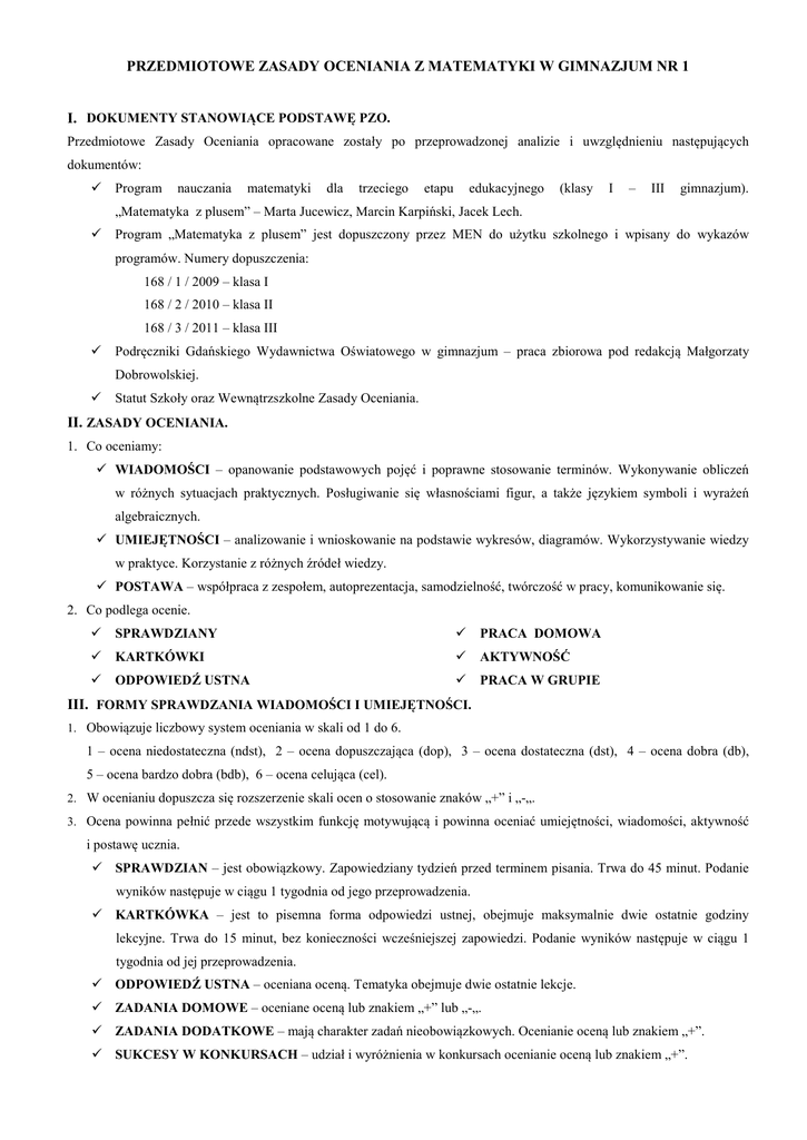 PRZEDMIOTOWE ZASADY OCENIANIA Z MATEMATYKI W GIMNAZJUM NR 1 I. DOKUMENTY STANOWIĄCE PODSTAWĘ PZO. Przedmiotowe Zasady Oceniania opracowane zostały po przeprowadzonej analizie i uwzględnieniu następujących dokumentów: Program nauczania matematyki dla trzeciego etapu edukacyjnego (klasy I – III gimnazjum). „Matematyka z plusem” – Marta Jucewicz, Marcin Karpiński, Jacek Lech. Program „Matematyka z plusem” jest dopuszczony przez MEN do użytku szkolnego i wpisany do wykazów programów. Numery dopuszczenia: 168 / 1 / 2009 – klasa I 168 / 2 / 2010 – klasa II 168 / 3 / 2011 – klasa III Podręczniki Gdańskiego Wydawnictwa Oświatowego w gimnazjum – praca zbiorowa pod redakcją Małgorzaty Dobrowolskiej. Statut Szkoły oraz Wewnątrzszkolne Zasady Oceniania. II. ZASADY OCENIANIA. 1. Co oceniamy: WIADOMOŚCI – opanowanie podstawowych pojęć i poprawne stosowanie terminów. Wykonywanie obliczeń w różnych sytuacjach praktycznych. Posługiwanie się własnościami figur, a także językiem symboli i wyrażeń algebraicznych. UMIEJĘTNOŚCI – analizowanie i wnioskowanie na podstawie wykresów, diagramów. Wykorzystywanie wiedzy w praktyce. Korzystanie z różnych źródeł wiedzy. POSTAWA – współpraca z zespołem, autoprezentacja, samodzielność, twórczość w pracy, komunikowanie się. 2. Co podlega ocenie. SPRAWDZIANY PRACA DOMOWA KARTKÓWKI AKTYWNOŚĆ ODPOWIEDŹ USTNA PRACA W GRUPIE III. FORMY SPRAWDZANIA WIADOMOŚCI I UMIEJĘTNOŚCI. 1. Obowiązuje liczbowy system oceniania w skali od 1 do 6. 1 – ocena niedostateczna (ndst), 2 – ocena dopuszczająca (dop), 3 – ocena dostateczna (dst), 4 – ocena dobra (db), 5 – ocena bardzo dobra (bdb), 6 – ocena celująca (cel). 2. W ocenianiu dopuszcza się rozszerzenie skali ocen o stosowanie znaków „+” i „-„. 3. Ocena powinna pełnić przede wszystkim funkcję motywującą i powinna oceniać umiejętności, wiadomości, aktywność i postawę ucznia. SPRAWDZIAN – jest obowiązkowy. Zapowiedziany tydzień przed terminem pisania. Trwa do 45 minut. Podanie wyników następuje w ciągu 1 tygodnia od jego przeprowadzenia. KARTKÓWKA – jest to pisemna forma odpowiedzi ustnej, obejmuje maksymalnie dwie ostatnie godziny lekcyjne. Trwa do 15 minut, bez konieczności wcześniejszej zapowiedzi. Podanie wyników następuje w ciągu 1 tygodnia od jej przeprowadzenia. ODPOWIEDŹ USTNA – oceniana oceną. Tematyka obejmuje dwie ostatnie lekcje. ZADANIA DOMOWE – oceniane oceną lub znakiem „+” lub „-„. ZADANIA DODATKOWE – mają charakter zadań nieobowiązkowych. Ocenianie oceną lub znakiem „+”. SUKCESY W KONKURSACH – udział i wyróżnienia w konkursach ocenianie oceną lub znakiem „+”. Poszczególnym formom sprawdzenia wiedzy i umiejętności przypisuje się następujące wagi: forma waga SPRAWDZIANY 3 lub 4 KARTKÓWKI 2 ODPOWIEDŹ USTNA 1 PRACA DOMOWA 1 lub 2 AKTYWNOŚĆ 1 PRACA W GRUPIE 1 SUKCESY W KONKURSACH 1, 2 lub 3 ZADANIA DODATKOWE 1 lub 2 4. Przygotowanie ucznia do zajęć. a. Uczeń ma prawo do dwukrotnego, w ciągu semestru nieprzygotowania do lekcji. Przez nieprzygotowanie do lekcji rozumiemy: brak zeszytu przedmiotowego, brak pracy domowej, brak pomocy potrzebnych do lekcji. Po wykorzystaniu określonego powyżej limitu uczeń otrzymuje za każde nieprzygotowanie do lekcji ocenę niedostateczną. Jeżeli uczeń nie zgłosi faktu nieprzygotowania na początku lekcji, otrzymuje ocenę niedostateczną. Przez początek lekcji rozumiemy moment po sprawdzeniu przez nauczyciela obecności. b. Jeżeli uczeń jest nieobecny na sprawdzianie, to po przyjściu do szkoły zobowiązany jest go napisać w ciągu dwóch tygodni, w terminie uzgodnionym z nauczycielem. W przypadku nieobecności jednodniowej, nieusprawiedliwionej na sprawdzianie uczeń zobowiązany jest napisać sprawdzian na najbliższych konsultacjach. c. Jeżeli uczeń jest nieobecny na sprawdzianie i nie napisał go na konsultacjach w wyznaczonym terminie przez nauczyciela, nauczyciel może nakazać temu uczniowi napisanie sprawdzianu na swojej lekcji. 5. W przypadku prac pisemnych przyjmujemy skalę punktową przeliczaną na oceny liczbowe wg kryteriów: 0% - 30% - ocena niedostateczna 31% - 50% - ocena dopuszczająca 51% - 74% - ocena dostateczna 75% - 90% - ocena dobra 91% - 95% - ocena bardzo dobra 96% - 100% - ocena celująca 6. Po dłuższej nieobecności ucznia w szkole (usprawiedliwionej – powyżej tygodnia) uczeń ma prawo nie być oceniany przez tydzień. 7. Ocena z odpowiedzi i zadań domowych nie podlega poprawie. 8. Średnia ważona stanowi wskazówkę przy wystawianiu oceny śródrocznej i rocznej. Ocena nie może być niższa, niż wskazanie średniej ważonej według następujących progów: progi ocena 0 - 1,69 ocena niedostateczna 1,7 - 2,49 ocena dopuszczająca 2,5 - 3,74 ocena dostateczna 3,75 - 4,74 ocena dobra 4,75 - 5,49 ocena bardzo dobra 5,5 - 6,0 ocena celująca 9. Na koniec semestru nie przewiduje się dodatkowych sprawdzianów zaliczeniowych. 10. Na koniec roku szkolnego uczeń nie może otrzymać oceny niższej niż średnia arytmetyczna średnich ważonych za pierwszy i drugi semestr zgodnie z progami zapisanymi w punkcie 8. Przy wystawianiu oceny końcowej nauczyciel bierze również pod uwagę: - postęp lub regres w nauce; - stosunek ucznia do przedmiotu; - dodatkowe osiągnięcia ucznia z przedmiotu; 11. O zagrożeniu oceną niedostateczną nauczyciel informuje ucznia oraz wychowawcę klasy na dwa tygodnie przed klasyfikacją. IV. POPRAWA UZYSKIWANYCH WYNIKÓW. 1. Uczeń, który otrzymał ze sprawdzianu ocenę niedostateczną lub inną dla niego niekorzystną ma prawo do poprawy w terminie 2 tygodni od podania wyników. Termin ustala nauczyciel. Poprawa sprawdzianu odbywa się na konsultacjach. 2. Uczeń ma możliwość poprawy sprawdzianu tylko raz. Forma poprawy jest pisemna. Do dziennika obok oceny uzyskanej poprzednio wpisuje się ocenę poprawioną. Przy wystawianiu ocen semest
