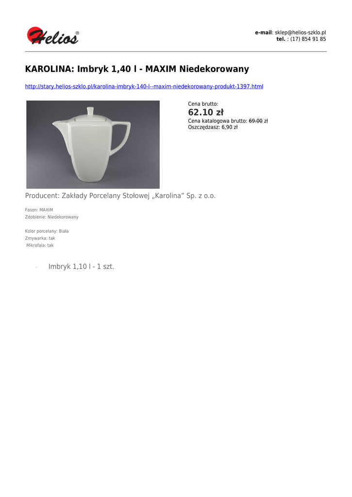 e-mail: [email protected] tel. : (17) 854 91 85 KAROLINA: Imbryk 1,40 l - MAXIM Niedekorowany http://stary.helios-szklo.pl/karolina-imbryk-140-l--maxim-niedekorowany-produkt-1397.html Cena brutto: 62.10 zł Cena katalogowa brutto: 69.00 zł Oszczędzasz: 6,90 zł Producent: Zakłady Porcelany Stołowej „Karolina” Sp. z o.o. Fason: MAXIM Zdobienie: Niedekorowany Kolor porcelany: Biała Zmywarka: tak Mikrofala: tak · Imbryk 1,10 l - 1 szt.