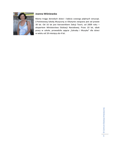 Joanna Wiśniewska © Centrum Edukacji Artystycznej Mama trojga dorosłych dzieci i babcia czworga pięknych wnucząt. Z Państwową Szkołą Muzyczną w Olsztynie związana jest od prawie 30 lat. Od 16 lat jest kierownikiem Sekcji Teorii, od 2009 roku – ekspertem Ministerstwa Edukacji Narodowej. Przez 10 lat, obok pracy w szkole, prowadziła zajęcia „Szkraby i Muzyka” dla dzieci w wieku od 18 miesięcy do 4 lat. 1 Joanna Wiśniewska PSM I i II stopnia im. Fryderyka Chopina w Olsztynie Piosenka z kanonem DO RE MI jako przykład wprowadzenia faktury monofonicznej, homofonicznej i polifonicznej oraz polirytmii W punkcie 1 przedstawiona jest melodia zwrotki z błędami. Uczeń ma dokonać korekty, zaznaczając błędy kółkiem. Wcześniej powinien przeanalizować ten fragment „w myśli”. Nauczyciel gra prawidłową melodię, która jest zapisana w punkcie 2. Jeśli połączymy zwrotki z getodźwiękami, powstanie polirytmia – równoczesne stosowanie różnych rytmów w różnych głosach. Gestodźwięki wykonujemy przez cały czas trwania zwrotki. Schemat przedstawiony w punkcie 3 powtórzy się cztery razy: nogi to dwa kroki w miejscu (lewa, prawa noga) na 1 i 2 ćwierćnutę, ręce to uderzenie rękoma o uda na 3 i 4 ćwierćnutę, pstryknięcie to pstryknięcie palcami na 1 ćwierćnutę kolejnego taktu. © Centrum Edukacji Artystycznej Fragment ten (punkt 2) jest przykładem monofonii – muzyki, którą tworzy wyłącznie jedna linia melodyczna. Należy określić interwały, ich przewroty, stopnie gamy oraz funkcje harmoniczne wynikające z przebiegu melodii. 2 Śpiew i gra z akompaniamentem fortepianowym są przykładem muzyki homofonicznej. Homofonia to technika kompozytorska, w której jeden głos jest główny, a inne tworzą akompaniament. Druga część piosenki to kanon. Uczniowie zapisują rytm tego fragmentu – punkt 4. Następnie transponują kanon do tonacji D-dur (po drugiej zwrotce) i E-dur (po trzeciej zwrotce) i śpiewają go literowo i solmizacyjnie we wskazanych tonacjach – punkt 5. Do refrenu (kanonu) uczniowie akompaniują sobie na dzwonkach (dwie grupy wykonują ostinato melodyczne). Podobnie jak podczas realizacji kanonu nazwami solmizacyjnymi © Centrum Edukacji Artystycznej Śpiew solmizacją w kanonie zaprezentuje polifonię – technikę kompozytorską, która polega na równoczesnym prowadzeniu samodzielnych i równorzędnych linii melodycznych. 3 i literowymi, po drugiej zwrotce uczniowie grają ostinato w tonacji D-dur, a po trzeciej – w E-dur. Dla utrwalenia faktury monofonicznej, homofonicznej i polifonicznej nauczyciel prezentuje wybrane przykłady z literatury muzycznej, np. C. Debussy – Syrinx (monofonia), W.A. Mozart – Eine kleine Nachtmusik, cz. III Menuet (homofonia), J.S. Bach – Credo z Mszy h-moll (polifonia). Podsumowanie Scenariusz jest swobodną propozycją dla nauczyciela. Można zrealizować całość na 2–3 lekcjach lub wybrać sobie dowolne zadanie. Dla utrwalenia poszczególnych typów faktury uczniowie mogą zaprezentować utwory, które wykonują na lekcjach instrumentu głównego. © Centrum Edukacji Artystycznej Na zakończenie uczniowie wykonują całą piosenki DO RE MI. Pierwsza część (zwrotka) połączona jest z gestodźwiękami. Po pierwszej zwrotce następuje refren w kanonie, połączony z ostinatem melodycznym, w tonacji C-dur. Następnie nauczyciel podaje akord D-dur i druga zwrotka oraz kanon wykonywane są w tonacji D-dur, zaś trzecia – w E-dur. 4 Utwory wykorzystane na lekcji: © Centrum Edukacji Artystycznej 1. Claude Debussy – Syrinx 2. Wolfgang Amadeus Mozart – Eine kleine Nachtmusik, cz. III Menuet 3. Johann Sebastian Bach – Credo z Mszy h-moll 5