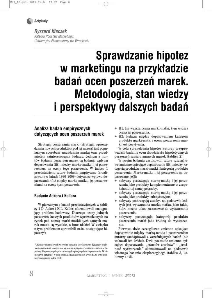 MiR_A2.qxd 2013-03-04 17:07 Page 8 Artykuły Ryszard Kłeczek Katedra Podstaw Marketingu, Uniwersytet Ekonomiczny we Wrocławiu Sprawdzanie hipotez w marketingu na przykładzie badań ocen poszerzeń marek. Metodologia, stan wiedzy i perspektywy dalszych badań Analiza badań empirycznych dotyczących ocen poszerzeń marek Strategia poszerzania marki (strategia wprowadzania nowych produktów pod jej nazwą) jest popularnym sposobem zarządzania marką oraz przedmiotem zainteresowania badaczy. Jednym z nurtów badania poszerzeń marek są badania wpływu dopasowania (fit) między marką-matką i jej poszerzeniem na oceny tego poszerzenia. W tablicy 1 przedstawiono cztery badania empiryczne (zrealizowane w latach 1990–2009) dotyczące wpływu dopasowania (fit) między marką-matką i jej poszerzeniami na oceny tych poszerzeń. Badanie Aakera i Kellera W pierwszym z badań przedstawionych w tablicy 1 D. Aaker i K.L. Keller, sformułowali następujący problem badawczy: Dlaczego oceny jednych poszerzeń (nowych produktów wprowadzonych na rynek pod nazwą marki-matki) tych samych marek-matek są wysokie, a inne niskie? W związku z tym problemem sprawdzili m.in. następujące hipotezy1: 1 Autorzy sformułowali w swoim badaniu trzy hipotezy dotyczące wpływu dopasowania między marką matką a jej poszerzeniami — odrębne hipotezy dla poszczególnych zmiennych opisujących to dopasowanie. W niniejszym artykule, w celu zwiększenia klarowności wywodu, te trzy hipotezy zastąpiono jedną (H2). 8 z H1: Im wyższa ocena marki-matki, tym wyższa ocena jej poszerzenia. z H2: Relacja między dopasowaniem kategorii produktu marki-matki i oceną poszerzenia marki jest pozytywna. W celu sprawdzenia hipotez autorzy przeprowadzili badanie ocen dwudziestu hipotetycznych poszerzeń sześciu znanych marek (tablica 2). W swoim badaniu zastosowali cztery szczegółowe zmienne opisujące dopasowanie (fit) między kategorią produktu marki-matki i kategorią produktu poszerzenia. Marka-matka i jej poszerzenie są dopasowane, jeśli: z nabywcy postrzegają markę-matkę i jej poszerzenia jako produkty komplementarne w zaspokajaniu tej samej potrzeby, z nabywcy postrzegają markę-matkę i jej poszerzenia jako produkty substytucyjne, z nabywcy postrzegają zasoby, na podstawie których jest wytwarzana marka-matka, jako takie, które można także zastosować do wytwarzania poszerzenia, z nabywcy postrzegają kategorię produktu poszerzenia marki jako trudną do wytworzenia. Pierwsze dwie szczegółowe zmienne opisujące dopasowanie między marką-matką i poszerzeniem autorzy zaadaptowali z wcześniejszych badań (nie wskazali ich źródeł). Dwie pozostałe zmienne opisujące dopasowanie: „transfer zasobów” i „trudność wytworzenia” skonstruowali na podstawie własnego badania eksploracyjnego (tablica 3, kolumny 4 i 5). MARKETING I RYNEK 3/2013 MiR_A2.qxd 2013-03-04 17:07 Page 9 Artykuły Tablica 1. Badania empiryczne dotyczące wpływu postrzeganego dopasowania między marka-matką i jej poszerzeniami na konsumenckie oceny tych poszerzeń Badanie Hipotezy dotyczące Zmienne opisujące wpływu dopasowania kategorię na oceny poszerzeń dopasowania (fit) 1 2 1. Implikacje menedżerskie Wyniki badania 2. Implikacje dla przyszłych badań 3 4 Substytucyjność, komplementarność, transfer, trudność Niektóre zmienne opisujące dopasowanie (fit) wpływają na transfer skojarzeń z marki-matki na poszerzenia, pozostałe nie wpływają D. Aaker, K.L. Keller, Consumer Evaluations of Brand Extensions, „Journal of Marketing” 1990, January, s. 27–41 (study 1)* H1: Im wyższa ocena marki-matki, tym wyższa ocena jej poszerzenia D. Papadimitriou, A. Apostolopoulou, I. Loukas, The Role of Perceived Fit in Fans’ Evaluation of Sports Brand Extensions, „International Journal of Sports Marketing & Sponsorship” 2004, July, s. 31–48 H1: Postrzegane dopasowanie między marką klubu sportowego i jej poszerzeniami wpływa pozytywnie na ocenę tych poszerzeń I. Buil, L. de Chernatony, Brand Extension Strategies: Perceived Fit, Brand Type, and Culture Influences, „European Journal of Marketing” 2009, No. 11/12, s. 1300–1324 Te same zmienne, co Konsumencka ocena w badaniu D. Aakera poszerzeń marek jest i K.L. Kellera korzystniejsza, gdy konsumenci postrzegają duże dopasowanie marki-matki i poszerzenia, niż gdy postrzegają to dopasowanie jako małe B.-H. Chang, S.M. Chan-Olmsted, Success Factors of Cable Network Brand Extension: Focusing on the Parent Network, Composition, Fit, Consumer Characteristics, and Viewing Habits, „Journal of Broadcasting & Electronic Media” 2010, No. 4, s. 641–656 Dopasowanie między marką-matką telewizji kablowej a jej poszerzeniem (nowym kanałem tematycznym) wpływa pozytywnie na oceny tego poszerzenia H2: Zależność między dopasowaniem kategorii produkt marki-matki a oceną poszerzenia marki jest pozytywna Ocena marki-matki nie wpływa na oceny poszerzeń Kompatybilność, spójność, podobieństwo, odpowiedniość 5 1. Menedżerowie mogą oczekiwać pozytywnego transferu wizerunku w takich kategoriach produktu, w których zmienne dopasowania działają pozytywnie 2. Trzeba poszukiwać (w eksploracyjnych badaniach jakościowych) innych zmiennych składających się na kategorię dopasowania Niektóre zmienne opisujące dopasowanie (fit) wpływają na oceny poszerzeń 1. Brak implikacji menedżerskich Konsumenckie oceny poszerzeń marek są bardziej korzystne, gdy konsumenci postrzegają większe dopasowanie między marką-matką a poszerzeniem 1. Menedżerowie powinni wprowadzać poszerzenia marek o wysokim dopasowaniu (fit) do marek-matek Dopasowanie wpływa na oceny poszerzeń, ale inne zmienne (np. postawa wobec marki-matki, postrzegane zróżnicowanie jakości w portfelu produktów marki-matki, percepcja liczby submarek, innowacyjność widza) także wpływają na te oceny 1. Przy wprowadzaniu nowych kanałów tematycznych menedżerowie powinni br