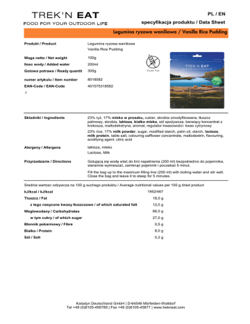 PL / EN specyfikacja produktu / Data Sheet Legumina ryzowa waniliowa / Vanilla Rice Pudding Legumina ryzowa waniliowa Produkt / Product Vanilla Rice Pudding Waga netto / Net weight 100g Ilosc wody / Added water 200ml Gotowa potrawa / Ready quantit 300g numer artykulu / Item number 8018582 EAN-Code / EAN-Code 401575318582 / 23% ryż, 17% mleko w proszku, cukier, skrobia zmodyfikowana, tłuszcz palmowy, skrobia, laktoza, białko mleka, sól spożywcza, barwiący koncentrat z krokosza, maltodekstryna, aromat, regulator kwasowości: kwas cytrynowy Skladniki / Ingredients 23% rice, 17% milk powder, sugar, modified starch, palm oil, starch, lactose, milk protein, table salt, colouring safflower concentrate, maltodextrin, flavouring, acidifying agent: citric acid laktoza, mleko Alergeny / Allergens Lactose, Milk Przyrzadzanie / Directions Gotującą się wodę wlać do linii napełnienia (200 ml) bezpośrednio do pojemnika, starannie wymieszać, zamknąć pojemnik i poczekać 5 minut. Fill the bag up to the maximum filling line (200 ml) with boiling water and stir well. Close the bag and leave it to steep for 5 minutes. Srednia wartosc odzywcza na 100 g suchego produktu / Average nutritional values per 100 g dried product 1952/467 kJ/kcal / kJ/kcal 18,0 g Tluszcz / Fat z tego nasycone kwasy tłuszczowe / of which saturated fatt Weglowodany / Carbohydrates w tym cukry / of which sugar 12,0 g 66,0 g 27,0 g Błonnik pokarmowy / Fibre 0,5 g Bialko / Protein 8,0 g Sól / Salt 0,2 g Katadyn Deutschland GmbH | D-64546 Mörfelden-Walldorf Tel +49 (0)6105-456789 | Fax +49 (0)6105-45877 | www.trekneat.com