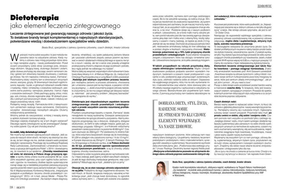 ZDROWIE ZDROWIE Dietoterapia jako element leczenia zintegrowanego Leczenie zintegrowane jest gwarancją naszego zdrowia i jakości życia. To światowe brandy terapii komplementarnej o najwyższych standaryzacjach, potwierdzane wiedzą i doświadczeniem specjalistów wielu dziedzin. Beata Bruś, specjalistka z zakresu żywienia człowieka, coach dietetyk, kreator zdrowia W yobrazić można sobie wszystko i to jest metoda niezawodna także na odzyskanie zdrowia. Kiedy myślimy o zdrowiu nasz mózg przywołuje różne obrazy i tego narzędzia użyjmy - naszej podświadomości. Przed oczami przywołajmy sobie obraz szczerego pola, okraszonego słońcem, falującą trawą, otulonego zbożami i ziołami, gdzie drzewa pochylają się otaczając swoimi ramionami ziemię i gdzieś tam drewniany bazarek zbudowany z cedrowego drzewa. Na nim napisana z lekkością nazwa „Farmacia”. Podchodzimy bliżej i widzimy tam w drewnianych skrzyniach owoce, warzywa, grzyby. W drewnianych beczkach ogórki kiszone, kapustę i buraki, w glinianych dzbanach zsiadłe mleko i maślankę, mleko i śmietankę z orzeszków cedrowych, pierwotne ziarna pszenicy: samopsza, plaskurka i kamut, mąka z orzeszków cedrowych. Chleb pachnący gryką, orkisz, miód, jaja, sok z brzozy, złociste regionalne oleje. W słoikach powidła z późnych pomarszczonych śliwek, nalewki i mikstury oddające prawdziwą naturę roślin. Podajemy swoją receptę. Farmaceuta-rolnik z niewymuszonym uśmiechem realizuje nasze zamówienie. Odchodzimy szczęśliwi doświadczając niezwykłych zakupów. Otulamy wdzięcznością sprzedawcę. Wróćmy jednak do rzeczywistości, w której z receptą stoimy w aptece zirytowani życiową sytuacją. Dlaczego częściej znajdujemy się w tym drugim wariancie? Dlaczego raporty onkologiczne są tak przerażające? Zadajemy sobie pytanie: Czy rak jest chorobą strachu? Co zrobić, żeby doświadczyć zmiany? Nie musimy być przecież częścią ponurych statystyk. Jeśli zapuka do naszych drzwi strach, nie bójmy się otworzyć bo okaże się, że tam nikogo nie ma. Jednak czasami warto przejrzeć statystyki i opracowania. Powołując się na publikacje Rządowej Rady Ludnościowej ,,Zachorowalność i umieralność na nowotwory a sytuacja demograficzna Polski” z 2014 r. dowiadujemy się, że nowotwór to już epidemia. „Choroby nowotworowe od wielu lat stanowią w Polsce druga przyczynę zgonów, w wyniku której umiera rocznie przeciętnie 96 tys. osób (25% wszystkich zgonów), przy czym ogólna liczba zachorowań i zgonów na nowotwory złośliwe będzie systematycznie rosnąć stając się w niedalekiej przyszłości pierwszą przyczyną zgonów przed 65 rokiem życia zarówno kobiet jak i mężczyzn”. Na III Międzynarodowej Konferencji Medycznej „Integracyjne podejście w profilaktyce i leczeniu chorób przewlekłych i onkologicznych” 2015 r. dr n.med. Janusz Meder – Prezes Polskiej Unii Onkologii powiedział: „Na każdym etapie diagnozy, 38 leczenia, rehabilitacji, czy opieki paliatywnej zarówno lekarze jak i pozostali członkowie zespołu zawsze powinni się kierować w swoich działaniach miłością bliźniego w oparciu nie tylko o rozum i wiedzę, ale też o serce oraz prawdę umiejętnie przekazywaną choremu etapowo do jego oczekiwań i potrzeb, lecz nigdy jednak nie odbierając mu nadziei”. Można dalej się wesprzeć wspaniałymi sformułowaniami światowej sławy lekarzy m.in. dr Mariusz Wilga dyr. ds. medycznych Onkologii Psychospołecznej w Long Beach (USA) powiedział: „Nadzieja jest istotnym czynnikiem procesu leczenia, jest niezbędna zarówno w procesie zdrowienia, chorowania jak i umierania i zawsze jest na nią miejsce, a pacjenci i ich bliscy jej pragną (...). Jeżeli zrozumiemy pojęcie zdrowej nadziei, to zrozumiemy, że nie ma czegoś takiego jak fałszywa nadzieja, natomiast jest poważny problem „fałszywej beznadziei” i „przywiązania do wyniku”. Dietoterapia jest niepodważalnym aspektem leczenia zintegrowanego chorób przewlekłych i onkologicznych a przede wszystkim szeroko rozumianej profilaktyki zdrowia. Przykład z przydrożnego bazarku o nazwie „Farmacia” działa niewątpliwie na naszą wyobraźnię. Dzisiejsze zanieczyszczenie środowiska nie sprzyja zdrowemu pożywieniu. Alarmy ekologiczne przyprawiają nas o dreszcze, dziękujemy zbiegowi okoliczności, że Dehli to tylko odległe miejsce, gdzie pyłu zawieszonego przypada 150mg/m3, a w Krakowie oddychamy powietrzem zanieczyszczonym na poziomie 40-80mg/m3. Czasami dochodzi do 200mg/m3. Pył zawieszony to drobna frakcja, która wdychana bezpośredni dostaje się do krwioobiegu. W USA w ubiegłym roku zaostrzono normę z 14 do 12 mg/m3, w Europie dopuszcza się 25mg/m3. Z danych Polskiego Alarmu Smogowego w Krakowie wynika, że w Polsce dochodzi do 45 tys. przedwczesnych zgonów spowodowanych zanieczyszczonym powietrzem, a są to choroby układu krążenia, choroby nowotworowe, astma. Odpowiedzmy sobie na pytanie jakiej jakości są hodowane rośliny i mięso zwierząt, jeżeli żyjemy w takich warunkach i dodajmy, że jeśli do tego dochodzą manipulacje genetyczne, więc czym jesteśmy? Wsłuchując się w myśl: „Jesteśmy tym co jemy.” Okazuje się, że za stan naszego zdrowia odpowiedzialne są jelita. Podejdźmy do tego zagadnienia obrazowo. Harald Hosch, dr filozofii, terapeuta medycyny naturalnej w Hallenbergu pisał „Jeśli choruje kwiat doniczkowy, to ogrodnik zaleca wymianę ziemi. (…) Nawet jeśli zostanie ona zaatako- wana przez szkodniki, wymiana ziemi pomaga zadziwiająco często. Bo to nie szkodniki sprawiają, że roślina choruje. Winna jest jej niezdolność do zwalczenia napastników. Jej system odpornościowy jest zachwiany, bo jak inaczej można by wytłumaczyć fakt, że ze wszystkich roślin na parapecie choruje właśnie ta, a nie inna”. Podobnie dzieje się z naszym podłożem w jelitach. Udowodniono, że w łonie matki mamy sterylne jelita, sam 