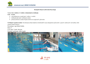 SCENARIUSZE ZAJĘĆ SZKOŁY W RUCHU Konspekt lekcji wychowania fizycznego Temat: Gry i zabawy w wodzie z elementami rywalizacji. Cele – Uczeń: zna podstawowe zasady gier i zabaw w wodzie doskonali pływanie wybranym stylem potraf zachować zasady bezpieczeństwa na zajęciach z pływania Cel lekcji w języku ucznia: Na dzisiejszej lekcji będziecie doskonalili swoje umiejętności pływackie w grach i zabawach i utrwalimy sobie zasady bezpieczeństwa. Prowadzący: mgr Robert Redlin Klasa: 4 Czas zajęć: 2 godz. lekcyjne Przybory i przyrządy: deski, krążki SCENARIUSZE ZAJĘĆ Tok lekcji SZKOŁY W RUCHU Nazwa zabawy, ćwiczenia Czas; Przebieg ćwiczenia liczba powtórzeń Uwagi organizacyjno-metodyczne Komendy nauczyciela Część wstępna Sprawy organizacyjnoporządkowe Zbiórka w szeregu, powitanie, sprawdzenie obecności, kontrola ubioru, czystości ciała, podanie tematu lekcji oraz przedstawienie celów lekcji w języku ucznia. 2min. N.: Zbiórka w szeregu! Ćwiczenia na lądzie 10min 10x -krążenie RR w przód, w tył, naprzemianstronne -w opadzie T naprzemianstronne wymachy RR -skłony T w bok, tył -krążenia T w P i L stronę -j.w. krążenie bioder -przysiady -tzw. ,,pajacyki” Zwracamy uwagę na to, aby każde dziecko miało odpowiednio ilość miejsca do ćw. X X X X X X X X X N N.: Luźna rozsypka! Część główna „Zawodnicy” 4 min. Uczniowie przepływają krótkie odcinki 25 metrowe 8 razy dowolnym sposobem. Wygrywa uczeń , który najładniej Nauczyciel zwraca uwagę na technikę pływania. SCENARIUSZE ZAJĘĆ SZKOŁY W RUCHU przepłynie określony dystans. N.: Stajemy w szeregu przy ściance basenu ! Na mój sygnał pływamy dowolnym sposobem! „Sztafeta” „Zawrót głowy” „Żabki” 4 min. 5 min. 5 min. Zawodnicy ustawiają sie na brzegu basenu w dwóch rzędach obok słupków startowych. Na sygnał prowadzącego pierwsi z rzędów wykonują skok startowy i płyną kraulem do bojki oddalonej od startu 10-15 metrów, dotykają ją i wracają na brzeg dotykając ręki następnego w drużynie. Wygrywa zespół który pierwszy ukończy sztafetę. Pokaz wykonywany przez ćwiczącego w wodzie. Na sygnał startowy N uczeń wykonuje start z wody i płynie kraulem na piersiach do wyznaczonego miejsca. Na tym odcinku musi wykonać 3 koziołki. Powrót w dowolny sposób. Kolejny zawodnik startuje, gdy poprzedni klepnie go w ramię. Ustawienie: w wodzie przy brzegu basenu. Na sygnał startowy N pierwszy uczeń wykonuje start z wody i płynie żabą do wyznaczonego miejsca, tam zabiera z dna krążek i wraca z nim żabką. Przekazuje krążek następnej osobie, ta płynie z krążkiem, odkłada go na miejsce i wraca itd. Wygrywa ta drużyna, która pierwsza ukończy zadanie. Ustawienie: w wodzie przy brzegu basenu. N.: Proszę o zachowanie ostrożności podczas wyścigu! Dzieci mogą sobie pomagać rękami przy koziołku. Krążek trzeba położyć na dno, a nie tylko wrzucić. SCENARIUSZE ZAJĘĆ SZKOŁY W RUCHU „Zderzenie” „Sztafeta zmienna” „Tonący brzytwy się chwyta” „Dziwny potwór” 5 min. 5 min. 5 min. 5 min. Pierwsi rzędów na sygnał N płyną do połowy baseny nogami do kraula- deska zanurzona pionowo w wodzie. Dzieci spotykają się w połowie basenu, gdzie zderzają się deskami, z powrotem płyną na plecach- deska na brzuchu. gdy dopłyną do rzędów przekazują deskę następnym z rzędów. Wygrywa ta drużyna, która pierwsza ukończy wyścig. Ustawienie: przy brzegu basenu z obu stron równa liczba osób. Na sygnał startowy N pierwsi z rzędów płyną z deską nogami do delfina, przekazują deskę kolejnej osobie na drugim brzegu. Ta płynie nogami do grzbietu, kolejna NN do żabki, a ostatnia NN do kraula i od początku. Wygrywa zespół, który pierwszy ukończy wyścig. Ustawienie: przy brzegu basenu z obu stron równa liczba osób. Na gwizdek N uczeń z jednej strony basenu płynie na boku trzymając deskę z przodu, gdy dopłynie do drużyny przekazuje deskę kolejnej osobie i ta robi to samo. Wygrywa ta drużyna, której zawodnicy szybciej ukończą wyścig. Ustawienie: przy brzegu basenu po obu stronach. Na sygnał startowy N pierwszy uczeń wykonuje skok ze słupka i płynie: RR do żabki, NN do delfina, do wyznaczonego miejsca i wraca w dowolny sposób. Startuje następny, gdy ten dotknie ścianki. Wygrywa ta drużyna, która pierwsza Ustawienie: za słupkami startowymi. Głowę należy trzymać płasko na wodzie. N.: Bierzemy deski! Dzieci muszą wykonywać ćwiczenie dokładnie. Należy zwracać uwagę na poprawną pracę nóg. Należy zwracać uwagę na koordynację ruchową. SCENARIUSZE ZAJĘĆ SZKOŁY W RUCHU ukończy wyścig. „Pociąg” 5 min. Na sygnał N pierwszy z rzędu płynie żabką na drugą stronę. Tam kolejny uczeń chwyta go w pasie i płyną razem: pierwszy RR do żabki, drugi NN do żabki. Płyną na drugą stronę, gdzie przyczepia się kolejna osoba itd., aż wszyscy będą płynąć razem. Ustawienie: przy brzegu basenu z obu stron równa liczba osób. Zabawę należy wykonywać powoli, żeby pierwszy pływak nie był mocno zmęczony. Część końcowa Ćwiczenia uspokajające „Meduza“ Czynności organizacyjnoporządkowe Opracował: Robert Redlin 3 min. 10 wydechów do wody; ćwiczący leżą na wodzie, NN i RR szeroko. 2 min. N.: Zbiórka w szeregu! Zbiórka, sprawdzenie obecności, podsumowanie lekcji, pożegnanie.