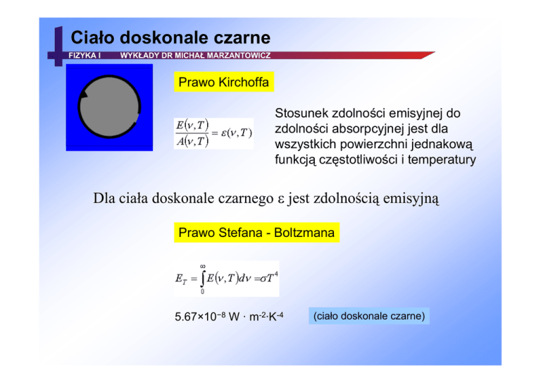 Ciało doskonale czarne Prawo Kirchoffa Stosunek zdolności emisyjnej do zdolności absorpcyjnej jest dla wszystkich powierzchni jednakową funkcją częstotliwości i temperatury Dla ciała doskonale czarnego ε jest zdolnością emisyjną Prawo Stefana - Boltzmana 5.67×10−8 W · m-2·K-4 (ciało doskonale czarne) Zdolność emisyjna / absorpcyjna Prawo przesunięć Wiena Widmo energetyczne latarki Widmo słońca Pomiar temperatury Słońce: temperatura efektywna 5778 K – odpowiada długości światła 502 nm „Katastrofa ultrafioletowa” Wzór Rayleigha-Jeansa Wzór Plancka Zjawisko fotoelektryczne zewnętrzne hν=W+eU0 Energia fotonu Energia elektronu Praca wyjścia z metalu Efekt Comptona hν0+m0c2=hν+mc2 p0=pr+mv Przesunięcie Comptona nie zależy od materiału rozpraszającego hν 0 hν = cosθ + mv cos φ c c hν 0= sin θ − mv sin φ c c − c ν ν0 = h (1 − cosθ ) m0 c Korpuskularna natura światła Kreacja pary elektron-pozyton Zachowane: -Ładunek -Pęd -Energia (Emin=1,2 MeV) Promieniowanie rentgenowskie Linie charakterystyczne Widmo ciągłe Minimalna długość fali Elektron traci całą energię w pojedynczym oddziaływaniu z jądrem tarczy Odkrycie elektronu Doświadczenie Thomsona (1897 r.) q/m = 1.7·1011 C/kg Masa cząstki naładowanej promieniowania katodowego jest około 2000 razy mniejsza niż masa zjonizowanego wodoru (protonu). Odkrycie elektronu Eksperyment Milikana : wyznaczenie ładunku elektronu e = 1.602·10-19 C m = 9.109·10-31 kg