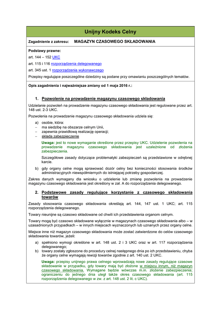 Unijny Kodeks Celny Zagadnienie z zakresu: MAGAZYN CZASOWEGO SKŁADOWANIA Podstawy prawne: art. 144 – 152 UKC art. 115 i 116 rozporządzenia delegowanego art. 345 ust. 1 rozporządzenia wykonawczego Przepisy regulujące poszczególne dziedziny są podane przy omawianiu poszczególnych tematów. Opis zagadnienia i najważniejsze zmiany od 1 maja 2016 r.: 1. Pozwolenie na prowadzenie magazynu czasowego składowania Udzielanie pozwoleń na prowadzenie magazynu czasowego składowania jest regulowane przez art. 148 ust. 2-3 UKC. Pozwolenia na prowadzenie magazynu czasowego składowania udziela się: a) osobie, która: ma siedzibę na obszarze celnym Unii, zapewnia prawidłową realizację operacji; składa zabezpieczenie Uwaga: jest to nowe wymaganie określone przez przepisy UKC. Udzielenie pozwolenia na prowadzenie magazynu czasowego składowania jest uzależnione od złożenia zabezpieczenia. Szczegółowe zasady dotyczące problematyki zabezpieczeń są przedstawione w odrębnej karcie. b) gdy organy celne mogą sprawować dozór celny bez konieczności stosowania środków administracyjnych niewspółmiernych do istniejącej potrzeby gospodarczej. Zakres danych wymagany dla wniosku o udzielenie lub zmianę pozwolenia na prowadzenie magazynu czasowego składowania jest określony w zał. A do rozporządzenia delegowanego. 2. Podstawowe zasady regulujące korzystanie z czasowego składowania towarów Zasady stosowania czasowego składowania określają art. 144, 147 ust. 1 UKC; art. 115 rozporządzenia delegowanego. Towary nieunijne są czasowo składowane od chwili ich przedstawienia organom celnym. Towary mogą być czasowo składowane wyłącznie w magazynach czasowego składowania albo – w uzasadnionych przypadkach – w innych miejscach wyznaczonych lub uznanych przez organy celne. Miejsce inne niż magazyn czasowego składowania może zostać zatwierdzone do celów czasowego składowania towarów, jeżeli: a) spełniono wymogi określone w art. 148 ust. 2 i 3 UKC oraz w art. 117 rozporządzenia delegowanego; b) towary zostały zgłoszone do procedury celnej następnego dnia po ich przedstawieniu, chyba że organy celne wymagają rewizji towarów zgodnie z art. 140 ust. 2 UKC. Uwaga: przepisy unijnego prawa celnego wprowadzają nowe zasady regulujące czasowe składowanie w przypadku, gdy towary mają być złożone w miejscu innym, niż magazyn czasowego składowania. Wymagane będzie wówczas m.in. złożenie zabezpieczenia; ograniczeniu do jednego dnia uległ także okres czasowego składowania (art. 115 rozporządzenia delegowanego w zw. z art. 148 ust. 2 lit. c UKC). Zabezpieczenie z tytułu czasowego składowania nie będzie wymagane w przypadku, gdy osoba uzyskała przed 1 maja 2016 r. pozwolenie na prowadzenie magazynu czasowego składowania (dodatkowe wyjaśnienia dla posiadaczy pozwoleń na prowadzenie magazynu czasowego składowania w okresie przejściowym podano w pkt 5). 3. Termin czasowego składowania Termin czasowego składowania określa art. 149 UKC Objęcie procedurą celną albo powrotny wywóz towarów, które są przedmiotem czasowego składowania musi nastąpić w terminie 90 dni. Termin ten nie podlega przedłużeniu. Do operacji czasowego składowania rozpoczętych przed dniem 1 maja 2016 r. stosuje się przepisy UKC określające termin składowania, to znaczy wydłuża się go do 90 dni. Termin składowania ulega zmniejszeniu o liczbę dni, które zostały wykorzystane przed dniem 1 maja 2016 r. 4. Przepisy krajowe Zasadnicze kwestie regulujące czasowe składowanie są określone w unijnym prawie celnym, odpowiednio: problematyka wydawania pozwoleń w art. 148 ust. 2-3 UKC i kwestie dotyczące prowadzenia ewidencji w art. art. 148 ust. 4 UKC i art. 116 rozporządzenia delegowanego. Prawo krajowe nie zawiera odrębnych regulacji dotyczących czasowego składowania. 5. Zasady regulujące prowadzenie magazynu czasowego składowania w okresie przejściowym Zasady obowiązujące w okresie przejściowym określa art. 250 ust. 1 rozporządzenia delegowanego; art. 345 ust. 1 rozporządzenia wykonawczego. Pozwolenia na prowadzenie magazynów czasowego składowania udzielone przed 1 maja 2016 r. zachowują ważność po 1 maja 2016 r. W okresie przejściowym nie jest wymagane złożenie zabezpieczenia, o którym mowa w art. 148 ust. 2 lit. c UKC. Ważność zachowują także ewidencje towarowe prowadzone w magazynie czasowego składowania. Regulowanie sytuacji towarów objętych czasowym składowaniem odbywa się na podstawie przepisów nowego prawa unijnego. Uwaga: pozwolenia na prowadzenie magazynów czasowego składowania udzielone przed 1 maja 2016 r. podlegają ponownej ocenie. W wyniku ponownej oceny posiadane pozwolenie zostanie cofnięte oraz – jeśli spełnione będą warunki określone w przepisach prawa celnego – zostanie wydane nowe pozwolenie. Zgodnie z art. 250 ust. 1 rozporządzenia delegowanego organ celny jest zobowiązany do przeprowadzenia ponownej oceny i wydania rozstrzygnięcia w sprawie przed dniem 1 maja 2019 r. Szczegółowe zasady dotyczące przeprowadzenia ponownej oceny są przedstawione w odrębnej karcie. Dodatkowe informacje: Ponowna ocena pozwoleń wydanych przed 1 maja 2016 r. Data ostatniej aktualizacji: 7 grudnia 2016 r.