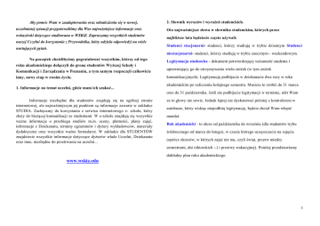 Aby pomóc Wam w zaadaptowaniu oraz odnalezieniu się w nowej, uczelnianej sytuacji przygotowaliśmy dla Was najważniejsze informacje oraz wskazówki dotyczące studiowana w WSKiZ. Zapraszamy wszystkich studentów 2. Słownik wyrazów i wyrażeń studenckich. Oto najważniejsze słowa w słowniku studenckim, których przez najbliższe lata będziecie często używali: naszej Uczelni do korzystania z Przewodnika, który udziela odpowiedzi na wiele Studenci stacjonarni- studenci, którzy studiują w trybie dziennym Studenci nurtujących pytań. niestacjonarni- studenci, którzy studiują w trybie zaocznym - weekendowym. Na początek chcielibyśmy pogratulować wszystkim, którzy od tego roku akademickiego dołączyli do grona studentów Wyższej Szkoły i Komunikacji i Zarządzania w Poznaniu, a tym samym rozpoczęli całkowicie inny, nowy etap w swoim życiu. 1. Informacje na temat uczelni, gdzie mam ich szukać... Legitymacja studencka - dokument potwierdzający tożsamość studenta i uprawniający go do otrzymywania wielu zniżek (w tym zniżek komunikacyjnych). Legitymację podbijacie w dziekanacie dwa razy w roku akademickim po zaliczeniu kolejnego semestru. Musicie to zrobić do 31 marca oraz do 31 października. Jeśli nie podbijecie legitymacji w terminie, nikt Wam Informacje niezbędne dla studentów znajdują się na ogólnej stronie internetowej, ale najważniejszym jej punktem są informacje zawarte w zakładce STUDIA. Zachęcamy do korzystania z serwisu internetowego e- szkoła, który służy do bieżącej komunikacji ze studentami. W e-szkole znajdują się wszystkie ważne informacje o przebiegu studiów m.in. oceny, płatności, plany zajęć, informacje z Dziekanatu, terminy egzaminów i dyżury wykładowców, materiały dydaktyczne oraz wszystkie ważne formularze. W zakładce dla STUDENTÓW znajdziecie wszystkie informacje dotyczące dyżurów władz Uczelni, Dziekanatu oraz inne, niezbędne do przetrwania na uczelni... za to głowy nie urwie. Jednak lepiej nie dyskutować później z kontrolerem w autobusie, który widząc niepodbitą legitymację, będzie chciał Wam wlepić mandat. Rok akademicki - to okres od października do września (dla studentów trybu śródrocznego od marca do lutego), w czasie którego uczęszczacie na zajęcia (oprócz okresów, w których zajęć nie ma, czyli świąt, przerw miedzy semestrami, dni rektorskich :-) i przerwy wakacyjnej). Poniżej przedstawiamy dokładny plan roku akademickiego. www.wskiz.edu 1 Harmonogram roku akademickiego – Zima 2011/2012 Nr tygodnia Daty 1 16.09.2011-18.09.2011 2 23.09.2011-25.09.2011 3 30.09.2011-02.10.2011 4 03.10.2011-09.10.2011 5 10.10.2011-16.10.2011 6 17.10.2011-23.10.2011 7 24.10.2011-30.10.2011 8 31.10.2011-06.11.2011 9 07.11.2011-13.11.2011 10 14.11.2011-20.11.2011 11 21.11.2011-27.11.2011 12 28.11.2011-04.12.2011 13 05.12.2011-11.12.2011 14 12.12.2011-18.12.2011 17 02.01.2012-08.01.2012 18 09.01.2012-15.01.2012 19, 20 * 16.01.2012-29.01.2012 21, 22 ** 30.01.2012-10.02.2012 * – sesja egzaminacyjna ** – sesja poprawkowa Grupy rozpoczynające zajęcia Nr tygodnia Grupa 1 3CI, 3CZ, 4CI, 5CP, 5AP, 5CZ, 7CZ, 8CI, 8CZ 2 3CP, 3CR, 5CI, 5CR, 5AR, 5CS, 7CI 4 3AI, 3AZ, 5AI, 5AZ, 7AI, 7AZ w październiku 1C, 1A A – grupa stacjonarna C – grupa niestacjonarna I – Informatyka O – Ochrona Środowiska P – Pedagogika R – Zarządzanie T – Automatyka i Robotyka Z – Zarządzanie i Inżynieria Produkcji Indeks - najważniejszy dokument dla studenta. W indeksie przez cały okres studiów zbieracie oceny oraz podpisy wykładowców potwierdzające zaliczenie przez Was danego przedmiotu. Indeks jest zdawany do dziekanatu dwa razy w czasie roku akademickieg o. Po zdaniu wszystkich egzaminów i uzyskaniu zaliczeń przewidzianych w roku akademickim należy oddać indeks i kartę okresowych osiągnięć studenta do Dziekanatu w terminie do 20 lutego po sesji zimowej, a po sesji letniej do 20 września. Brak, chociaż jednego podpisu powoduje brak możliwości przyjęcia Waszego indeksu przez Dziekanat. Niezdanie indeksu w terminie jest wielkim błędem i może pociągnąć za sobą wiele niemiłych konsekwencji. Jakich? Lepiej dla Was, abyście nigdy się o tym nie dowiedzieli (bo chyba nie chcecie zostać skreśleni z listy studentów :-) Tak więc zdajemy indeks w terminie wraz z wypełnioną kartą okresowych osiągnięć studenta, lub wypełniamy odpowiednie podanie. Bardzo często wykładowcy nie wpisują daty egzaminu lub zaliczenia ćwiczeń. Możecie to zrobić sami. Lepiej, aby nie przyszło Wam do głowy wpisania sobie oceny lub podpisania się za wykładowcę - grozi to... tego też lepiej nie wiedzieć. Studenci, którzy nie zdadzą egzaminów lub nie uzyskają zaliczeń, muszą w w/w terminie złożyć stosowne podanie o przedłużenie sesji lub powtarzanie przedmiotu. Opłata za przedłużenie sesji nie dłużej niż dwa tygodnie, po ostatecznym terminie składania indeksów w Dziekanacie wynosi 60 zł., powyżej dwóch tygodni 200 zł. Szczegółowe informacje dot. opłat zawarte są w Regulaminie Opłat dostępnym na stronie www.wskiz.edu Numer albumu - Tym numerem będziecie się posługiwali przez cały okres studiów. Legitymacja studencka i indeks będą posiadały ten sam numer. To numer albumu studenta, który warto zapamiętać, ponieważ na 2 jego podstawie kwestura generuje indywidualne numery kont, na które wpłaca się czesne (opłaty należy wnosić wyłącznie w formie przelewu). (licencjacką, inżynierską) i uzyskać pozytywne recenzje oraz zdać egzamin dyplomowy - będzie Was to dotyczyło za parę lat :-) Starosta Roku/Semestru - przedstawiciel studentów danego roku/semestru, reprezentujący ich interesy i upoważniony do pobierania w dziekanacie indeksów oraz indywidualnych kart osiągnięć studenta (kart zaliczeniowych). On ma prawo do kontaktowania się z poszczególnymi wykładowcami w sprawach niezwykle ważnych dla danego roku/semestru: Wybierzcie więc sp