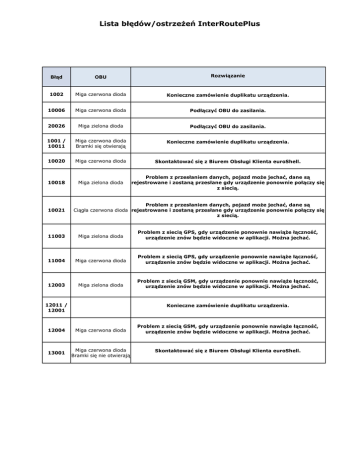 Lista błędów/ostrzeżeń InterRoutePlus Błąd OBU Rozwiązanie 1002 Miga czerwona dioda Konieczne zamówienie duplikatu urządzenia. 10006 Miga czerwona dioda Podłączyć OBU do zasilania. 20026 Miga zielona dioda Podłączyć OBU do zasilania. 1001 / 10011 Miga czerwona dioda Bramki się otwierają Konieczne zamówienie duplikatu urządzenia. 10020 Miga czerwona dioda Skontaktować się z Biurem Obsługi Klienta euroShell. 10018 Miga zielona dioda Problem z przesłaniem danych, pojazd może jechać, dane są rejestrowane i zostaną przesłane gdy urządzenie ponownie połączy się z siecią. 10021 Problem z przesłaniem danych, pojazd może jechać, dane są Ciągła czerwona dioda rejestrowane i zostaną przesłane gdy urządzenie ponownie połączy się z siecią. 11003 Miga zielona dioda Problem z siecią GPS, gdy urządzenie ponownie nawiąże łączność, urządzenie znów będzie widoczne w aplikacji. Można jechać. 11004 Miga czerwona dioda Problem z siecią GPS, gdy urządzenie ponownie nawiąże łączność, urządzenie znów będzie widoczne w aplikacji. Można jechać. 12003 Miga zielona dioda Problem z siecią GSM, gdy urządzenie ponownie nawiąże łączność, urządzenie znów będzie widoczne w aplikacji. Można jechać. 12011 / 12001 Konieczne zamówienie duplikatu urządzenia. 12004 Miga czerwona dioda Problem z siecią GSM, gdy urządzenie ponownie nawiąże łączność, urządzenie znów będzie widoczne w aplikacji. Można jechać. 13001 Miga czerwona dioda Bramki się nie otwierają Skontaktować się z Biurem Obsługi Klienta euroShell.