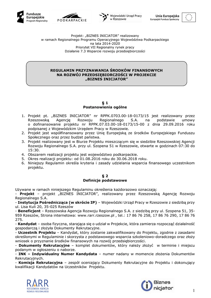 Projekt: „BIZNES INICJATOR” realizowany w ramach Regionalnego Programu Operacyjnego Województwa Podkarpackiego na lata 2014-2020 Priorytet VII Regionalny rynek pracy Działanie 7.3 Wsparcie rozwoju przedsiębiorczości REGULAMIN PRZYZNAWANIA ŚRODKÓW FINANSOWYCH NA ROZWÓJ PRZEDSIĘBIORCZOŚCI W PROJEKCIE „BIZNES INICJATOR” §1 Postanowienia ogólne 1. Projekt pt. „BIZNES INICJATOR” nr RPPK.0703.00-18-0173/15 jest realizowany przez Rzeszowską Agencję Rozwoju Regionalnego S.A. na podstawie umowy o dofinansowanie projektu nr RPPK.07.03.00-18-0173/15-00 z dnia 29.09.2016 roku podpisanej z Wojewódzkim Urzędem Pracy w Rzeszowie. 2. Projekt jest współfinansowany przez Unię Europejską ze środków Europejskiego Funduszu Społecznego oraz przez budżet państwa. 3. Projekt realizowany jest w Biurze Projektu mieszczącym się w siedzibie Rzeszowskiej Agencji Rozwoju Regionalnego S.A. przy ul. Szopena 51 w Rzeszowie, otwarte w godzinach 07:30 do 15:30. 4. Obszarem realizacji projektu jest województwo podkarpackie. 5. Okres realizacji projektu: od 01.08.2016 roku do 30.06.2018 roku. 6. Niniejszy Regulamin określa kryteria i zasady udzielania wsparcia finansowego uczestnikom projektu. §2 Definicje podstawowe Używane w ramach niniejszego Regulaminu określenia każdorazowo oznaczają: - Projekt – projekt „BIZNES INICJATOR”, realizowany przez Rzeszowską Agencję Rozwoju Regionalnego S.A. - Instytucja Pośrednicząca (w skrócie IP) – Wojewódzki Urząd Pracy w Rzeszowie z siedzibą przy ul. Lisa Kuli 20, 35-025 Rzeszów - Beneficjent – Rzeszowska Agencja Rozwoju Regionalnego S.A. z siedzibą przy ul. Szopena 51, 35959 Rzeszów, Strona internetowa: www.rarr.rzeszow.pl , tel.: 17 86 76 258, 17 86 76 290, 17 86 76 275. - Kandydat – osoba fizyczna, starająca się o udział w Projekcie, która zamierza rozpocząć działalność gospodarczą i złożyła Dokumenty Rekrutacyjne. - Uczestnik Projektu – Kandydat, który zostanie zakwalifikowany do Projektu, zgodnie z zasadami określonymi w Regulaminie i skorzysta z podstawowego wsparcia szkoleniowo-doradczego oraz złoży wniosek o przyznanie środków finansowych na rozwój przedsiębiorczości. - Dokumenty Rekrutacyjne – komplet dokumentów, który należy złożyć w terminie i miejscu podanym w ogłoszeniu o naborze. - INK – Indywidualny Numer Kandydata – numer nadany w momencie złożenia Dokumentów Rekrutacyjnych. - Komisja Rekrutacyjna – zespół oceniający Dokumenty Rekrutacyjne do Projektu i dokonujący kwalifikacji Kandydatów na Uczestników Projektu. 1 - Komisja Oceny Wniosków – Komisja przyznająca środki finansowe na rozwój przedsiębiorczości. Zespół oceniający biznes plany i kwalifikujący wnioski do otrzymania wsparcia finansowego. - Wsparcie finansowe - bezzwrotna pomoc finansowa, udzielana Uczestnikowi Projektu w formie jednorazowej dotacji na rozpoczęcie działalności gospodarczej, ułatwiająca sfinansowanie pierwszych wydatków inwestycyjnych, związanych z rozpoczętą przez Uczestnika Projektu działalnością gospodarczą. Maksymalna wysokość dotacji inwestycyjnej wynosi 23 300,00 złotych. - Wsparcie pomostowe – wsparcie udzielane w dwóch formach: wsparcie pomostowe finansowe - bezzwrotna pomoc finansowa dla Uczestnika Projektu w formie comiesięcznej dotacji wypłacane przez okres nie dłuższy niż 12 miesięcy, licząc od daty podpisania umowy na otrzymanie wsparcia finansowego i pomostowego. wsparcie pomostowe w postaci usług doradczo-szkoleniowych o charakterze specjalistycznym. §3 Wsparcie finansowe i pomostowe - ogólne warunki 1. Odbiorcami wsparcia finansowego oraz pomostowego nie mogą być osoby które: • posiadały aktywny wpis do CEIDG, były zarejestrowane jako przedsiębiorcy w KRS lub prowadziły działalność gospodarczą na podstawie odrębnych przepisów w okresie 12 miesięcy poprzedzających dzień przystąpienia do projektu, • były karane za przestępstwo skarbowe oraz nie korzystają w pełni z praw publicznych i nie posiadają pełnej zdolności do czynności prawnych, • korzystają równolegle z innych bezzwrotnych środków publicznych na rozpoczęcie działalności gospodarczej w tym zwłaszcza ze środków Funduszu Pracy, PFRON oraz w ramach Działania 7.3 RPO WP 2014-2020, • w bieżącym roku kalendarzowym oraz dwóch poprzedzających go latach kalendarzowych korzystały z pomocy de minimis, której wartość brutto łącznie z pomocą, o którą się ubiegają, przekraczałaby równowartość w złotych kwoty 200 000 euro, a w przypadku działalności gospodarczej w sektorze transportu drogowego - równowartość w złotych kwoty 100 000 euro, obliczonych według średniego kursu Narodowego Banku Polskiego obowiązującego w dniu udzielenia pomocy, • pozostają w związku małżeńskim lub w faktycznym pożyciu albo w stosunku pokrewieństwa i powinowactwa w linii prostej, pokrewieństwa i powinowactwa w linii bocznej do drugiego stopnia z Beneficjentem, i/lub pracownikiem Beneficjenta, • pozostają / pozostawały w ciągu ostatnich dwóch lat w stosunku pracy lub innym (umowa zlecenie, umowa o dzieło lub inne) z Beneficjentem, • zamierzają rozpocząć działalność gospodarczą prowadzoną wcześniej przez członka rodziny, z wykorzystaniem zasobów materialnych (pomieszczenia, sprzęt itp.) stanowiących zaplecze dla tej działalności, w przypadku gdy członek rodziny zaprzestał prowadzenia działalności gospodarczej nie później niż miesiąc przed dniem złożenia przez Uczestnika Projektu Formularza rekrutacyjnego, • zamierzają prowadzić działalność gospodarczą jednocześnie o tym samym profilu co przedsiębiorstwo prowadzone przez członka rodziny i pod tym samym adresem, z wykorzystaniem pomieszczeń w których jest prowadzona działalność. 2. Ponadto Uczestnicy Projektu muszą spełniać wymagania określone w Regulaminie rekrutacji i uczestnictwa projektu „BIZNES INICJATOR”. 3. Uczestnicy 