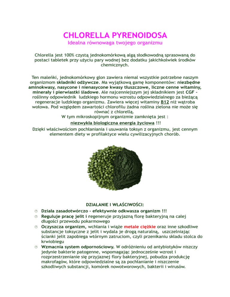 CHLORELLA PYRENOIDOSA Idealna równowaga twojego organizmu Chlorella jest 100% czystą jednokomórkową algą słodkowodną sprasowaną do postaci tabletek przy użyciu pary wodnej bez dodatku jakichkolwiek środków chemicznych. Ten maleńki, jednokomórkowy glon zawiera niemal wszystkie potrzebne naszym organizmom składniki odżywcze. Ma wyjątkową gamę komponentów: niezbędne aminokwasy, nasycone i nienasycone kwasy tłuszczowe, liczne cenne witaminy, minerały i pierwiastki śladowe. Ale najcenniejszym jej składnikiem jest CGF roślinny odpowiednik ludzkiego hormonu wzrostu odpowiedzialnego za bieżącą regeneracje ludzkiego organizmu. Zawiera więcej witaminy B12 niż wątroba wołowa. Pod względem zawartości chlorofilu żadna roślina zielona nie może się równać z chlorellą. W tym mikroskopijnym organizmie zamknięta jest : niezwykła biologiczna energia życiowa !!! Dzięki właściwościom pochłaniania i usuwania toksyn z organizmu, jest cennym elementem diety w profilaktyce wielu cywilizacyjnych chorób. DZIAŁANIE I WŁAŚCIWOŚCI: Działa zasadotwórczo – efektywnie odkwasza organizm !!! Reguluje pracę jelit i regeneruje przyjazną florę bakteryjną na całej długości przewodu pokarmowego Oczyszcza organizm, wchłania i wiąże metale ciężkie oraz inne szkodliwe substancje toksyczne z jelit i wydala je drogą naturalną, uszczelniając ścianki jelit zapobiega wtórnym zatruciom, czyli przenikaniu składu stolca do krwiobiegu Wzmacnia system odpornościowy. W odróżnieniu od antybiotyków niszczy jedynie bakterie patogenne, wspomagając jednocześnie wzrost i rozprzestrzenianie się przyjaznej flory bakteryjnej, pobudza produkcję makrofagów, które odpowiedzialne są za pochłanianie i niszczenie szkodliwych substancji, komórek nowotworowych, bakterii i wirusów. W okresie jesienno-zimowym jest idealnym środkiem w profilaktyce przeciwgrypowej Odmładza organizm, przyspiesza regenerację uszkodzonych tkanek oraz DNA (kodu genetycznego ludzkiej komórki). Jest bogata w biologicznie czynne substancje o charakterze antyoksydacyjnym, które chronią komórki przed niszczącym działaniem wolnych rodników powodujących przedwczesne starzenie się organizmu. Zapobiega chorobom serca, skóry, arteriosklerozie oraz zaćmie. Znaczna zawartość ksantofilu przeciwdziała pogarszaniu się wzroku !!! Poprawia kondycję psychiczną i fizyczną, poprawia pamięć oraz koncentrację, stymuluje energię i siły życiowe Posiada największą zawartość chlorofilu ze wszystkich roślin zielonych rosnących na naszej planecie, dzięki czemu poprawia dotlenienie oraz obraz krwi, przyśpiesza gojenie ran i chroni przed stanem zapalnym. Pomaga w schorzeniach chronicznych takich jak reumatyzm , artretyzm, cukrzyca, zaburzenia ciśnienia, trawienia i wchłaniania, jak również w wirusowych i bakteryjnych infekcjach oraz grzybicach. Zawiera więcej witaminy B12 niż pieczeń wołowa i 11 razy więcej wapnia niż krowie mleko Najlepsze dawkowanie chlorelli Najlepiej spożywać od 5 do 10 gramów (20-40 tabletek) chlorelli dziennie, w rozbiciu na trzy porcje, najkorzystniej w formie Koktajlu. Opis sporządzenia i skład Koktajlu dostępny u nas. Taka dawka jest dobrze tolerowane zarówno przez dorosłych jak i dzieci. A zapewnia pełną ochronę i regenerację organizmu. PRZYJMUJ MNIE A OBDARZĘ CIĘ DOBRYM ZDRÓWIEM