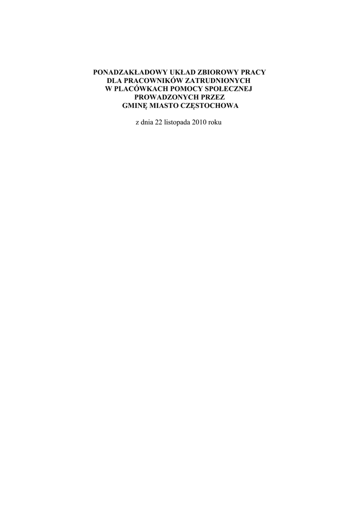 PONADZAKŁADOWY UKŁAD ZBIOROWY PRACY DLA PRACOWNIKÓW ZATRUDNIONYCH W PLACÓWKACH POMOCY SPOŁECZNEJ PROWADZONYCH PRZEZ GMINĘ MIASTO CZĘSTOCHOWA z dnia 22 listopada 2010 roku PONADZAKŁADOWY UKŁAD ZBIOROWY PRACY DLA PRACOWNIKÓW ZATRUDNIONYCH W PLACÓWKACH POMOCY SPOŁECZNEJ PROWADZONYCH PRZEZ GMINĘ MIASTO CZĘSTOCHOWA zawarty w dniu 22 listopada 2010 roku w Częstochowie pomiędzy: pełniącym funkcję Prezydenta Miasta Częstochowy z siedzibą w Częstochowie, ul. Śląska 11/13, 42-217 Częstochowa oraz Zarządem Regionu Częstochowskiego NSZZ „Solidarność” z siedzibą w Częstochowie, ul. Łódzka 8/12, 42-202 Częstochowa PREAMBUŁA STRONY, DZIAŁAJĄC W DOBREJ WIERZE, DEKLARUJĄ WOLĘ PRZESTRZEGANIA POSTANOWIEŃ ZAWARTYCH W UKŁADZIE I ZOBOWIĄZUJĄ SIĘ WZAJEMNIE DO TAKIEGO POSTĘPOWANIA, KTÓRE BĘDZIE MIAŁO NA CELU DOBRO PLACÓWEK POMOCY SPOŁECZNEJ ORAZ PRAWIDŁOWE ICH FUNKCJONOWANIE I FINANSOWANIE, A TAKŻE DO WSPÓŁDZIAŁANIA W CELU STAŁEJ, SYSTEMATYCZNEJ POPRAWY WARUNKÓW PRACY I PŁACY PRACOWNIKÓW. STRONY DOŁOŻĄ WSZELKICH STARAŃ, ABY NIE DOPUSZCZAĆ DO POWSTANIA SPORÓW ZBIOROWYCH. 2 ROZDZIAŁ I ZAKRES PODMIOTOWY I PRZEDMIOTOWY UKŁADU § 1. 1. Ponadzakładowy Układ Zbiorowy Pracy dla Pracowników Zatrudnionych w Placówkach Pomocy Społecznej Prowadzonych przez Gminę Miasto Częstochowa, zwany dalej „Układem”, zawiera się dla pracowników zatrudnionych na podstawie umowy o pracę w placówkach pomocy społecznej, prowadzonych przez Gminę Miasto Częstochowa i wymienionych w Załączniku nr 1 do Układu. 2. W zakresie ustalonym Układem jego postanowienia mają również zastosowanie do emerytów i rencistów – pracowników, którzy przeszli na emeryturę lub rentę z placówek pomocy społecznej objętych Układem. § 2. Układ określa warunki, jakim powinna odpowiadać treść stosunku pracy, wzajemne zobowiązania stron Układu, a także ogólne zasady współpracy ze związkami zawodowymi. ROZDZIAŁ II POSTANOWIENIA WSTĘPNE WYJAŚNIENIE PODSTAWOWYCH POJĘĆ § 3. Ilekroć w Układzie jest mowa o: 1) „placówce pomocy społecznej” – rozumie się przez to placówki pomocy społecznej objęte Układem wymienione w Załączniku nr 1 do Układu, 2) „organie prowadzącym” – rozumie się przez to Gminę Miasto Częstochowa, 3) „pracownikach” – rozumie się przez to wszystkie osoby zatrudnione na podstawie umowy o pracę w placówkach pomocy społecznej, 4) „pracodawcy” – rozumie się przez to placówkę pomocy społecznej zatrudniającą pracowników, w imieniu której czynności w sprawach z zakresu prawa pracy dokonuje dyrektor, 5) „dyrektor” - rozumie się przez to dyrektora właściwej placówki pomocy społecznej, 6) „organizacji związkowej”– rozumie się przez to Zarząd Regionu Częstochowskiego NSZZ „Solidarność” z siedzibą w Częstochowie przy ul. Łódzkiej 8/12, 7) „Fundusz” - rozumie się przez to Zakładowy Fundusz Świadczeń Socjalnych, 8) „zakładowa organizacja związkowa” - rozumie się przez to organizację związkową działającą w placówkach pomocy społecznej, 9) „minimalne wynagrodzenie zasadnicze” - rozumie się przez to najniższe wynagrodzenie zasadnicze w danej kategorii zaszeregowania określone w Załączniku nr 3 do Układu, 3 § 4. 1. Tabela stanowisk, kategorii zaszeregowania i wymagań kwalifikacyjnych pracowników stanowi Załącznik nr 2 do Układu. 2. Tabela rozpiętości miesięcznych stawek wynagrodzenia zasadniczego pracowników stanowi Załącznik nr 3 do Układu. ROZDZIAŁ III STOSUNEK PRACY § 5. 1. Docelową formą umowy o pracę, stosowaną dla pracowników objętych Układem, jest umowa na czas nieokreślony. 2. Pracownik zatrudniony w placówce pomocy społecznej na podstawie umowy o pracę na czas określony, ma prawo złożyć do pracodawcy - w terminie 3 dni od dnia wejścia w życie Układu - wniosek o przekształcenie umowy o pracę zawartej na czas określony w umowę o pracę zawartą na czas nieokreślony, z zastrzeżeniem ust. 3. 3. Wniosek, o którym mowa w ust. 2, może złożyć pracownik, którego łączny okres pracy na podstawie umowy o pracę na czas określony między tymi samymi stronami stosunku pracy w dniu wejścia w życie Układu, wynosi co najmniej 21 miesięcy. 4. Złożenie przez pracownika wniosku, o którym mowa w ust. 2, skutkuje przekształceniem umowy zawartej na czas określony w umowę zawartą na czas nieokreślony z dniem złożenia wniosku przez pracownika. § 6. 1. Pracownik zatrudniony na podstawie umowy o pracę na czas określony, którego stosunek pracy nawiązany został po dniu wejścia w życie Układu, ma prawo złożyć do pracodawcy wniosek o przekształcenie umowy o pracę zawartej na czas określony w umowę o pracę zawartą na czas nieokreślony, z zastrzeżeniem ust. 2 i 3. 2. Wniosek, o którym mowa w ust. 1, może złożyć pracownik, którego umowa na czas określony zawarta została na okres trwający 21 miesięcy i dłużej. 3. Wniosek, o którym mowa w ust. 1, pracownik powinien złożyć do pracodawcy w terminie 30 dni przed upływem okresu, na jaki została zawarta umowa. 4. Za datę przekształcenia umowy, o której mowa w ust. 2, uznaje się ostatni dzień trwania umowy. § 7. Postanowienia § 5 i § 6 nie dotyczą umów o pracę na zastępstwo, umów o pracę zawartych w ramach robót publicznych, umów o pracę zawartych w ramach prac interwencyjnych oraz umów zawartych na realizację programów finansowanych ze środków zewnętrznych. 4 § 8. Pracodawca nie może wypowiedzieć umowy o pracę pracownikowi, któremu brakuje nie więcej niż 5 lat do osiągnięcia wieku emerytalnego, jeżeli okres zatrudnienia umożliwia mu uzyskanie prawa do emerytury z osiągnięciem tego wieku. § 9. 1. Okres wypowiedzenia umowy o pracę zawartej na okres próbny wynosi: 1) 3 dni robocze, jeżeli okres próbny nie przekracza 2 tygodni, 2) 2 tygodnie, jeżeli okres próbny jest dłuższy niż 2 t
