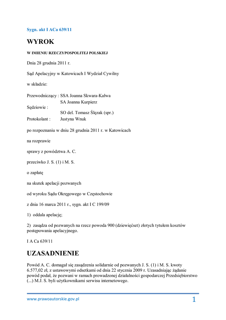 Sygn. akt I ACa 639/11 WYROK W IMIENIU RZECZYPOSPOLITEJ POLSKIEJ Dnia 28 grudnia 2011 r. Sąd Apelacyjny w Katowicach I Wydział Cywilny w składzie: Przewodniczący : SSA Joanna Skwara-Kałwa SA Joanna Kurpierz Sędziowie : SO del. Tomasz Ślęzak (spr.) Protokolant : Justyna Wnuk po rozpoznaniu w dniu 28 grudnia 2011 r. w Katowicach na rozprawie sprawy z powództwa A. C. przeciwko J. S. (1) i M. S. o zapłatę na skutek apelacji pozwanych od wyroku Sądu Okręgowego w Częstochowie z dnia 16 marca 2011 r., sygn. akt I C 199/09 1) oddala apelację; 2) zasądza od pozwanych na rzecz powoda 900 (dziewięćset) złotych tytułem kosztów postępowania apelacyjnego. I A Ca 639/11 UZASADNIENIE Powód A. C. domagał się zasądzenia solidarnie od pozwanych J. S. (1) i M. S. kwoty 6.577,02 zł, z ustawowymi odsetkami od dnia 22 stycznia 2009 r. Uzasadniając żądanie powód podał, że pozwani w ramach prowadzonej działalności gospodarczej Przedsiębiorstwo (...) M.J. S. byli użytkownikami serwisu internetowego. www.prawoautorskie.gov.pl 1 Działalność tą prowadzili wspólnie do dnia 21 lutego 2005 r., kiedy to J. S. (1) wykreślona została z ewidencji działalności gospodarczej. W wymienionym serwisie, od września 2002 r. co najmniej do dnia 28 lutego 2006 r. rozpowszechniali bez uprawnienia trzy fragmenty Mapy (...) Wydawnictwa (...). W ocenie powoda, zgodnie z dyspozycją art. 79 ust. 1 pkt 3b prawa autorskiego, jest on uprawniony do dochodzenia od pozwanych, jako naruszających przysługujące mu majątkowe prawa autorskie, kwoty stanowiącej trzykrotność stosownego wynagrodzenia, które w chwili jego dochodzenia byłoby należne tytułem udzielenia zgody na korzystanie i rozpowszechnianie fragmentów mapy Polski. W niniejszej sprawie jest to kwota 6.577,02 zł, wynikająca z cennika powoda obowiązującego od dnia 1 grudnia 2006 r. Zawinienie pozwanych, według powoda, nie budzi wątpliwości, bowiem korzystając bez uprawnienia z mapy musieli wiedzieć o objęciu ochroną prawa autorskiego tego produktu, bowiem oryginalna mapa powoda posiada w wyraźny sposób umieszczoną informację o prawach autorskich twórcy. W odpowiedzi na pozew pozwani przyznali, że w 2002 r. zlecili założenie strony internetowej firmie (...). Materiały do założenia strony uzgodnione zostały z firmą (...) i jej przekazane, za wyjątkiem fragmentu mapy. Pozwani przyznali, że są w posiadaniu opakowania produktu pudełka, które nie posiada informacji o prawach autorskich przysługujących twórcy. W związku z powyższym w ocenie pozwanych naruszenie przez nich praw autorskich nastąpiło w sposób nieświadomy. Winę za naruszenie praw autorskich powoda ponosi firma (...), która zajmując się tworzeniem stron internetowych powinna wiedzieć, że w przypadku umieszczenia na tworzonej stronie mapy potrzebne jest zawarcie umowy licencyjnej. Firma (...) natychmiast po otrzymaniu informacji od (...) , dotyczącej bezprawnego umieszczenia fragmentu mapy za pośrednictwem firmy (...), w lutym 2006 r. usunęła ze strony internetowej umieszczony w niej fragment mapy. Ponieważ do pisma z dnia 25 stycznia 2006 r. firma (...) nie dołączyła żadnego cennika ani żadnego wyjaśnienia w zakresie roszczeń finansowych, zdaniem pozwanych cennik sporządzono na użytek wniesionej sprawy. Niezależnie od powyższego pozwani zarzucili, że ceny wskazane w cenniku licencyjnym powoda są kilkanaście, a nawet kilkadziesiąt razy wyższe od cen rynkowych, nadto w cenniku powód posługuje się nielegalną jednostką miar nie wymienioną w rozporządzeniu Rady Ministrów z dnia 30 listopada 2006 r. w sprawie legalnych jednostek miar. Ostatecznie pozwani zarzucili, że wina leży po stronie firmy (...), która nie powiadomiła ich o potrzebie zawarcia umowy licencyjnej. Pozwani zarzucili także, że pozew powinien być skierowany tylko do osoby prowadzącej działalność gospodarczą, a pozwana J. S. (1) działalności takiej nie prowadzi od dnia 22 lutego 2005 r. Wyrokiem z dnia 16 marca 2011 roku Sąd Okręgowy w Częstochowie zasądził od pozwanych solidarnie dochodzoną pozwem kwotę, zaokrąglając ją do pełnego złotego, wraz z ustawowymi odsetkami i orzekł o kosztach procesu. Sąd pierwszej instancji ustalił, że powód prowadzi działalność gospodarczą, a nazwa jego firmy to (...) A. C. i posiada pełne autorskie prawa majątkowe do cyfrowej mapy Polski i wszelkich programów komputerowych zawierających tę mapę lub jej fragmenty. Powód współpracuje z M. O. prowadzącym działalność gospodarczą pod firmą (...) w Ł., w zakresie tworzenia utworów kartograficznych, udzielania sublicencji osobom trzecim na ich rozpowszechnianie oraz wykrywania naruszeń praw autorskich do tych do tych utworów i prowadzenia wszelkich działań zmierzających do uregulowania stanu prawnego zreprodukowanych i nielegalnie rozpowszechnianych fragmentów map. www.prawoautorskie.gov.pl 2 Na podstawie pełnomocnictwa z dnia 8 października 2004 r. powód upoważnił M. O. oraz pracowników jego firmy (...) do podejmowania prawem dozwolonych działań mających na celu zapobieganie naruszeniu majątkowych praw autorskich do map cyfrowych, dochodzenia za straty związane z takimi naruszeniami oraz doprowadzania do zaniechania takich naruszeń. W dniu 15 maja 1991 r. pozwany M. S. zarejestrował działalność gospodarczą pod nazwą Przedsiębiorstwo (...) M.J.S. /(...) 'M.J.S.w N.. Do dnia 21 lutego 2005 r. zarejestrowana jako współwłaściciel firmy pozostawała pozwana J. S. (1). W 2002 r. na zlecenie pozwanych Biuro (...) S.C W. A. S. w C. ( obecnie (...)) wykonało stronę internetową ich przedsiębiorstwa, którą następnie umieszczono pod adresem Zawartość strony internetowej, przed jej uruchomieniem, uzgodniona została z pozwanymi, pozwani przekazali Biuru (...) wszystkie materiały potrzebne do wykonania strony, w tym zdjęcia, logo, płytę CD z zamieszczoną na niej mapą Polski wydawnictwa (..