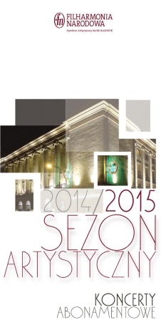 60 lat sprzedaż abonamentów w nowym gmachu Z OKAZJI OTWARCIA ODBUDOWANEGO GMACHU FILHARMONII UROCZYSTY KONCERT SYMFONICZNY MUZYKI POLSKIEJ INAUGURUJĄCY V MIĘDZYNARODOWY KONKURS IM. FRYDERYKA CHOPINA* 21 lutego 1955, godz. 20.00 ORKIESTRA FILHARMONII NARODOWEJ Witold ROWICKI dyrygent Wanda WIŁKOMIRSKA skrzypce Stanisław MONIUSZKO – Uwertura koncertowa Bajka Karol SZYMANOWSKI – I Koncert skrzypcowy op. 35 Witold LUTOSŁAWSKI – Koncert na orkiestrę * z broszury programowej koncertu 21 II 1955 WYMIANA OD 21 LIPCA DO 6 WRZEŚNIA Wymiana i sprzedaż dla osób posiadających abonamenty w ubiegłym sezonie z zachowaniem prawa do zajmowanych wcześniej miejsc. W przypadku wymiany abonamentów możliwość płatności przelewem po uprzednim potwierdzeniu kontynuacji drogą mailową lub faksem. Odbiór abonamentów możliwy w dniu pierwszego koncertu. Sprzedaż od 8 do 20 września Sprzedaż dla osób nieposiadających abonamentów w ubiegłym sezonie. Sprzedaż w kasach Filharmonii oraz na witrynie internetowej www.filharmonia.pl. informacje DODATKOWE Od 21 lipca 2014 będzie można nabyć bilety na koncerty inaugurujące nowy sezon artystyczny (3 i 4 X), od 22 września 2014 na koncerty odbywające się w październiku, a od 29 września – nabyć oraz zarezerwować z obowiązkiem wykupienia w ciągu 7 dni bilety na koncerty filharmoniczne całego sezonu artystycznego. Uprzejmie informujemy, że pierwsze trzy rzędy parteru Sali Koncertowej nie są objęte sprzedażą abonamentową, ze względu na konieczność rozbudowy estrady przy niektórych koncertach. Zwroty pieniędzy za bilety możliwe są tylko za okazaniem paragonu fiskalnego najpóźniej tydzień przed koncertem. Koszty biletów w ramach abonamentów będą zwracane tylko w przypadku odwołania koncertu. Podstawą do zwrotu jest abonament i paragon fiskalny. Aktualizacja programu została zakończona 20 maja 2014. Filharmonia zastrzega sobie możliwość zmiany programu i wykonawców oraz wyłączenia miejsc na balkonie I na koncertach kameralnych odbywających się w Sali Koncertowej. INFORMACJA I REZERWACJA BILETÓW pon.-pt. w godz. 9.00-15.00, tel. 22 55 17 127, 22 55 17 149, 22 55 17 188. Od 21 lipca do końca sierpnia kasy będą czynne codziennie z wyjątkiem sobót i niedziel w godzinach: 10.00-14.00 i 15.00-19.00. Od 1 września kasy będą czynne codziennie od poniedziałku do soboty w godzinach: 10.00-14.00 i 15.00-19.00, w niedziele, w dniach koncertów dla dzieci, w godzinach 10.00-14.00. 3 RODZAJE ABONAMENTÓW Abonament A1 Koncerty symfoniczne, Sala Koncertowa 5 koncertów, cena: 323, 278, 256, 192 zł 23 listopada 2014; 9 stycznia 2015; 13 lutego 2015; 13 marca 2015; 12 czerwca 2015 Abonament A2 Koncerty symfoniczne, Sala Koncertowa 5 koncertów, cena: 340, 295, 259, 200 zł 22 listopada 2014; 10 stycznia 2015; 14 lutego 2015; 14 marca 2015; 9 maja 2015 Abonament B1 Koncerty symfoniczne, Sala Koncertowa 5 koncertów, cena: 357, 312, 280, 213 zł 24 października 2014; 28 listopada 2014; 20 lutego 2015; 20 marca 2015; 24 kwietnia 2015 Abonament B2 Koncerty symfoniczne, Sala Koncertowa 5 koncertów, cena: 357, 312, 280, 213 zł 29 listopada 2014; 17 stycznia 2015; 21 lutego 2015; 21 marca 2015; 25 kwietnia 2015 Abonament C1 Koncerty symfoniczne, Sala Koncertowa 6 koncertów, cena: 442, 388, 348, 264 zł 7 listopada 2014; 5 grudnia 2014; 23 stycznia 2015; 27 lutego 2015; 17 kwietnia 2015; 29 maja 2015 Abonament C2 Koncerty symfoniczne, Sala Koncertowa 6 koncertów, cena: 442, 388, 348, 264 zł 8 listopada 2014; 6 grudnia 2014; 24 stycznia 2015; 28 lutego 2015; 18 kwietnia 2015; 30 maja 2015 Abonament Dm1 (dzieci młodsze 3-6 lat) Poranne koncerty dla dzieci, Sala Koncertowa 6 koncertów, cena: 150, 120 zł 26 października 2014; 30 listopada 2014; 14 grudnia 2014; 8 lutego 2015; 8 marca 2015; 12 kwietnia 2015 Abonament Ds1 (dzieci starsze 7-12 lat) Popołudniowe koncerty dla dzieci, Sala Koncertowa 6 koncertów, cena: 150, 120 zł 26 października 2014; 30 listopada 2014; 14 grudnia 2014; 4 stycznia 2015; 8 lutego 2015; 12 kwietnia 2015 Abonament Dm2 (dzieci młodsze 3-6 lat) Poranne koncerty dla dzieci, Sala Koncertowa 6 koncertów, cena: 150, 120 zł 12 października 2014; 9 listopada 2014; 21 grudnia 2014; 18 stycznia 2015; 15 lutego 2015; 10 maja 2015 Abonament Ds2 (dzieci starsze 7-12 lat) Popołudniowe koncerty dla dzieci, Sala Koncertowa 6 koncertów, cena: 150, 120 zł 12 października 2014; 9 listopada 2014; 21 grudnia 2014; 15 lutego 2015; 26 kwietnia 2015; 10 maja 2015 Abonament Pm1 (dzieci młodsze 3-6 lat) Poranki dla Małych Melomanów, Sala Kameralna 5 koncertów, cena: 115 zł 28 września 2014; 23 listopada 2014; 11 stycznia 2015; 15 marca 2015; 17 maja 2015 Abonament Ps1 (dzieci starsze 7-12 lat) Popołudnia dla Małych Melomanów, Sala Kameralna 5 koncertów, cena: 115 zł 28 września 2014; 23 listopada 2014; 11 stycznia 2015; 15 marca 2015; 17 maja 2015 Abonament D1 Koncerty symfoniczne, Sala Koncertowa 6 koncertów, cena: 391, 337, 285, 225 zł 10 października 2014; 12 grudnia 2014; 30 stycznia 2015; 6 lutego 2015; 6 marca 2015; 10 kwietnia 2015 Abonament Pm2 (dzieci młodsze 3-6 lat) Poranki dla Małych Melomanów, Sala Kameralna 5 koncertów, cena: 115 zł 19 października 2014; 7 grudnia 2014; 22 lutego 2015; 19 kwietnia 2015; 31 maja 2015 Abonament D2 Koncerty symfoniczne, Sala Koncertowa 6 koncertów, cena: 391, 337, 285, 225 zł 11 października 2014; 13 grudnia 2014; 31 stycznia 2015; 7 lutego 2015; 7 marca 2015; 11 kwietnia 2015 Abonament Ps2 (dzieci starsze 7-12 lat) Popołudnia dla Małych Melomanów, Sala Kameralna 5 koncertów, cena: 115 zł 19 października 2014; 7 grudnia 2014; 22 lutego 2015; 19 kwietnia 2015; 31 maja 2015 Abonament K2 Koncerty kameralne, Sala Koncertowa 4 koncerty, cena: 340, 287, 242, 199 zł 25 listopada 2014; 9 grudnia 2014; 13 stycznia 2015; 14 kwietnia 2015 Abonament MD Muzyka dawna, Sala Koncertowa 5 koncertów, cena: 561, 465, 406, 339 zł 5 listopa