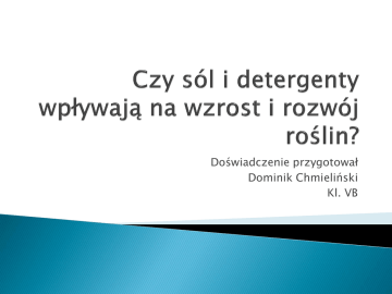 Doświadczenie przygotował Dominik Chmieliński Kl. VB Sól i detergenty wpływają na wzrost i rozwój roślin. Sól kuchenna,łyżeczka,torebka nasion rzeżuchy,woda wodociągowa,wata,trzy małe słoiki,trzy spodki,płyn do mycia naczyń(detergent). Postawiłem na parapecie w kuchni trzy spodki, na których ułożyłem trochę waty. Posiałem na wacie nasiona rzeżuchy i podlałem je wodą. Podlałem nasiona wodą z wodociągu. Popodlewałem każdy ze spodków. Rzeżucha zaczynała trochę kiełkować. Podlałem jak zwykle rzeżuchę. Powoli robiła się dojrzała. Podlałem rzeżuchę wodą i zobaczyłem, że urosła. Następnie przygotowałem słoiki z: wodą z wodociągu (W), wodą z solą kuchenną (S), wodą z detergentem (D). Podlałem rzeżuchę po 1 łyżeczce wody z detergentem,wody z solą kuchenną i wodą wodociągową. Podlałem rośliny trzema łyżeczkami tego wszystkiego, co poprzedniego dnia. Zauważyłem po kilkunastu minutach, że rzeżucha podlewana wodą z solą zwiędła, a rzeżucha podlewana roztworem wody z detergentem przestała rosnąć i zaczęła opadać. Nareszcie skończyłem! Z moich obserwacji wynika, że roślina podlewana wodą z wodociągu dalej rosła i była zielona, a pozostałe zwiędły i zmarniały. Sól i detergenty wpływają na wzrost i rozwój roślin, więc moja hipoteza się sprawdziła. Dziękuję za uwagę
