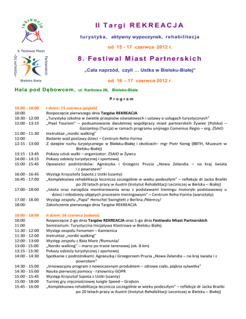 II T a r g i R E K R E A C J A turystyka, aktywny wypoczynek, rehabilitacja od 15 - 17 czerwca 2012 r. 8 . F e s t iw a l M i a s t P a r t n e r s k i c h „Cała naprzód, czyli … Ustka w Bielsku-Białej” od 16 – 17 czerwca 2012 r. Hala pod Dębowcem , ul. Karbowa 26, Bielsko-Biała Program 10:00 - 18:00 10:00 10:30 - 12:00 12:00 - 13:15 11:00 - 11:30 12:00 12:15 - 13:00 13:15 - 13:45 14:00 - 14:15 15:00 - 15:45 16:00 - 16:45 16:45 - 17:00 17:00 - 18:00 17.00 - 18.00 18:00 10:00 - 18:00 10:00 11:00 11:30 - 12:00 11:30 - 12:00 12:00 - 13:00 13:00 - 15:00 13:15 - 13:30 14:00 - 14:30 14:30 - 15:00 14:30 - 15:00 15:00 - 15:45 15:00 - 18:00 15:45 - 16:00 I dzień: 15 czerwca (piątek) Rozpoczęcie pierwszego dnia Targów REKREACJA „Turystyka szkolna w świetle przepisów oświatowych i ustawy o usługach turystycznych” „Pixel Tourism” – podsumowanie dwuletniej współpracy miast partnerskich Żywiec (Polska) – Gaziantep (Turcja) w ramach programu unijnego Comenius Regio – org. ZSAiO Instruktaż „nordic walking” Badanie wad postawy dzieci – Centrum Reha-Forma Z dziejów ruchu turystycznego w Bielsku-Białej i okolicach– mgr Piotr Kenig (BBTH, Muzeum w Bielsku-Białej) Pokazy sztuk walki – organizator: ZSAiO w Żywcu Pokazy odzieży turystycznej i sportowej Opowieści podróżników: Agnieszka i Grzegorz Prucia „Nowa Zelandia – na kraj świata i z powrotem” Występ Krzysztofa Szpota z Ustki (szanty) „Kompleksowa rehabilitacja lecznicza szczególnie w wieku podeszłym” – refleksje dr Jacka Brańki po 20 latach pracy w Austrii (Instytut Rehabilitacji Leczniczej w Bielsku – Białej) „Istota oraz narzędzia monitorowania wraz z podstawami treningu motoryki podstawowej u dzieci i młodzieży objętych procesem treningowym” – Centrum Reha-Forma (warsztaty) Występ zespołu „Papa” Henschel Swingtett z Berlina /Niemcy/ Zakończenie pierwszego dnia Targów REKREACJA II dzień: 16 czerwca (sobota) Rozpoczęcie 2-go dnia Targów REKREACJA oraz 1-go dnia Festiwalu Miast Partnerskich Seminarium: Turystyczna Inicjatywa Klastrowa w Bielsku-Białej Występ zespołu Fenomen – Kamienica Instruktaż „nordic walking” Występ zespołu z Baia Mare /Rumunia/ „Nordic walking” – marsz po trasie terenowej (ok. 8 km) Pokazy odzieży turystycznej i sportowej Spotkanie z podróżnikami: Agnieszką i Grzegorzem Prucia „Nowa Zelandia – na kraj świata i z powrotem” „Innowacyjny program z nowoczesnym produktem – zdrowe ciało, piękna sylwetka” Nauka pierwszej pomocy - ratownicy GOPR Występ Krzysztof Szpota z Ustki (szanty) Turniej gry zręcznościowej Jungle Speed – Grajkon „Kompleksowa rehabilitacja lecznicza szczególnie w wieku podeszłym” – refleksje dr Jacka Brańki po 20 latach pracy w Austrii (Instytut Rehabilitacji Leczniczej w Bielsku – Białej) 16:00 - 17:00 Występ zespołu Play It Again Sam z Wolfsburga /Niemcy/ 16:30 - 17:00 17:00 - 18:00 18.00 Instruktaż „Nordic walking” Występ zespołu „Papa” Henschel Swingtett z Berlina /Niemcy/ Zakończenie 2-go dnia Targów REKREACJA oraz 1-go dnia Festiwalu Miast Partnerskich 10:00 - 18:00 10.00 10:30 - 11:30 11:30 - 12:00 12:00 - 12:45 12:45 - 13:15 13:15 - 13:30 III dzień: 17 czerwca (niedziela) Rozpoczęcie 3-go dnia Targów REKREACJA oraz 2-go dnia Festiwalu Miast Partnerskich Występ zespołu Kamienica – pokazy odzieży sportowej i turystycznej „Nordic walking” – instruktaż Występ zespołu z Baia Mare /Rumunia/ Występ zespołu Kamienica – pokazy odzieży sportowej i turystycznej „Kompleksowa rehabilitacja lecznicza szczególnie w wieku podeszłym” – refleksje dr Jacka Brańki po 20 latach pracy w Austrii (Instytut Rehabilitacji Leczniczej w Bielsku-Białej) Spotkanie z podróżnikami: Agnieszką i Grzegorzem Prucia „Nowa Zelandia – na kraj świata i z powrotem” „Himalaje – góry niezwykłe” – spotkanie z podróżnikiem Krzysztofem Cieślawskim Akcja honorowego krwiodawstwa (autobus przed halą) Nauka pierwszej pomocy - ratownicy GOPR Występ zespołu V 8 Band z Żyliny /Słowacja/ Występ zespołu Play It Again Sam z Wolfsburga /Niemcy/ Występ Krzysztofa Szpota z Ustki (szanty) Zakończenie Targów REKREACJA oraz Festiwalu Miast Partnerskich 13:30 - 14:00 14:00 - 15:00 14:00 - 16:00 14:15 - 14:45 15:00 - 16:00 16:00 - 17:00 17:00 - 18:00 18:00 Impreza towarzysząca: „Cała naprzód, czyli … Ustka w Bielsku-Białej” - stoisko promocyjne - degustacja ryb morskich: smażonych, wędzonych i świeżych, oraz innych specjałów - występ usteckiego wokalisty Krzysztof Szpota Przez cały okres trwania targów na stoiskach prezentowane będą oferty regionów turystycznych i biur podróży Dodatkowo w czasie targów organizowane będą: - instruktaże sztucznego oddychania i masażu serca na elektronicznym fantomie - konkursy zręcznościowe (ścianka wspinaczkowa, dmuchane zjeżdżalnie, itp.) - rozgrywki w badmintona i tenisa stołowego, „large ball”, rzuty piłkami, itp. - pokazy promocyjnych filmów i zdjęć regionów i atrakcji turystycznych - konkursy z upominkami - rozgrywki w grach plenerowych MÖLKKY - Grajkon – gry dla każdego - quady, gokarty i inne pojazdy - urządzenia do ćwiczeń - pokazy wizażu i kosmetologii - czynny będzie salonik dla dzieci z zabawami i organizowanymi zajęciami, (np. malowanie twarzy, itp.) Organizatorzy zastrzegają sobie prawo do zmian w programie