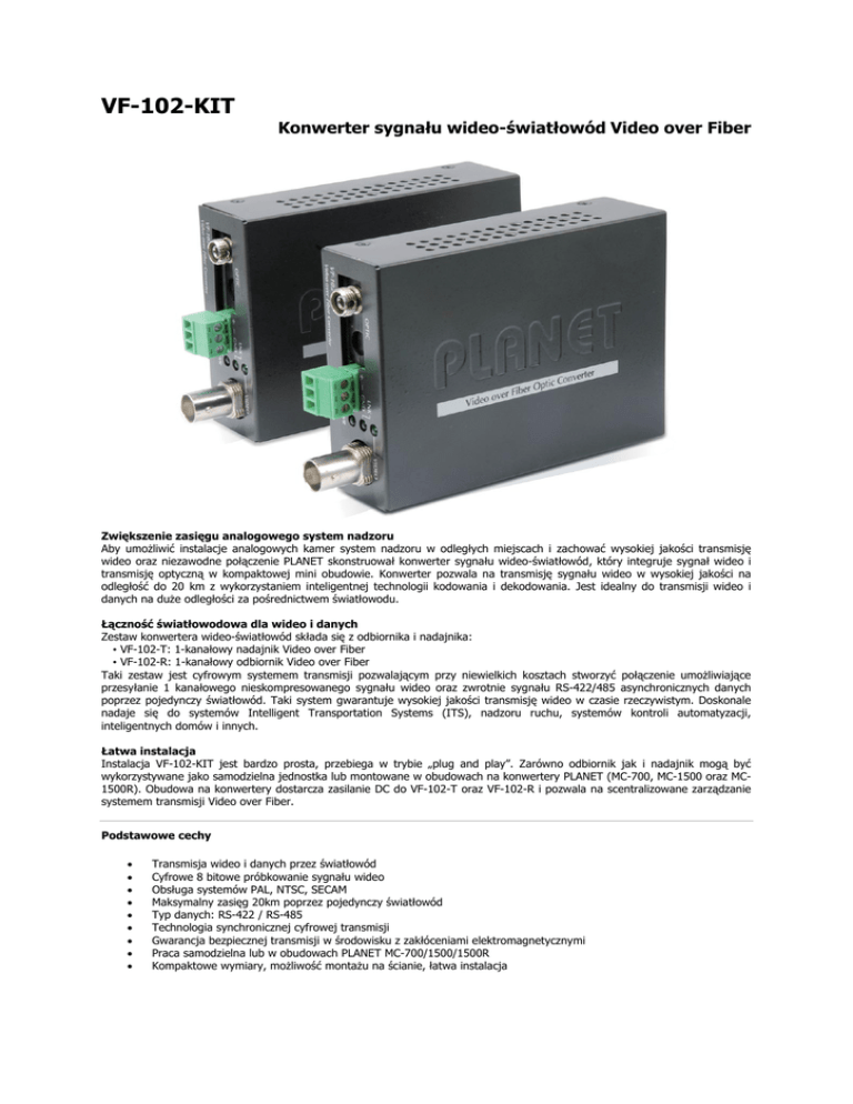VF-102-KIT Konwerter sygnału wideo-światłowód Video over Fiber Zwiększenie zasięgu analogowego system nadzoru Aby umożliwić instalacje analogowych kamer system nadzoru w odległych miejscach i zachować wysokiej jakości transmisję wideo oraz niezawodne połączenie PLANET skonstruował konwerter sygnału wideo-światłowód, który integruje sygnał wideo i transmisję optyczną w kompaktowej mini obudowie. Konwerter pozwala na transmisję sygnału wideo w wysokiej jakości na odległość do 20 km z wykorzystaniem inteligentnej technologii kodowania i dekodowania. Jest idealny do transmisji wideo i danych na duże odległości za pośrednictwem światłowodu. Łączność światłowodowa dla wideo i danych Zestaw konwertera wideo-światłowód składa się z odbiornika i nadajnika: • VF-102-T: 1-kanałowy nadajnik Video over Fiber • VF-102-R: 1-kanałowy odbiornik Video over Fiber Taki zestaw jest cyfrowym systemem transmisji pozwalającym przy niewielkich kosztach stworzyć połączenie umożliwiające przesyłanie 1 kanałowego nieskompresowanego sygnału wideo oraz zwrotnie sygnału RS-422/485 asynchronicznych danych poprzez pojedynczy światłowód. Taki system gwarantuje wysokiej jakości transmisję wideo w czasie rzeczywistym. Doskonale nadaje się do systemów Intelligent Transportation Systems (ITS), nadzoru ruchu, systemów kontroli automatyzacji, inteligentnych domów i innych. Łatwa instalacja Instalacja VF-102-KIT jest bardzo prosta, przebiega w trybie „plug and play”. Zarówno odbiornik jak i nadajnik mogą być wykorzystywane jako samodzielna jednostka lub montowane w obudowach na konwertery PLANET (MC-700, MC-1500 oraz MC1500R). Obudowa na konwertery dostarcza zasilanie DC do VF-102-T oraz VF-102-R i pozwala na scentralizowane zarządzanie systemem transmisji Video over Fiber. Podstawowe cechy • • • • • • • • • Transmisja wideo i danych przez światłowód Cyfrowe 8 bitowe próbkowanie sygnału wideo Obsługa systemów PAL, NTSC, SECAM Maksymalny zasięg 20km poprzez pojedynczy światłowód Typ danych: RS-422 / RS-485 Technologia synchronicznej cyfrowej transmisji Gwarancja bezpiecznej transmisji w środowisku z zakłóceniami elektromagnetycznymi Praca samodzielna lub w obudowach PLANET MC-700/1500/1500R Kompaktowe wymiary, możliwość montażu na ścianie, łatwa instalacja Przeznaczenie Zestaw VF-102-KIT składa się z 1 kanałowego nadajnika oraz odbiornika video over fiber pozwalających na transmisję sygnału wideo oraz RS-422/485 poprzez niezawodne połączenie światłowodowe. Jest idealnym rozwiązaniem dla systemów nadzoru wymagających wysokiej jakości obrazu i wysokiej wydajności transmisji na dużych odległościach. VF-102-KIT jest łatwy w instalacji, nie ma konieczności skomplikowanej konfiguracji. Nadajnik oraz odbiornik mogą pracować samodzielnie lub w obudowie zbiorczej na konwertery. Bezobsługowość oraz kompaktowa obudowa pozwalają na wykorzystanie zestawu w różnych zastosowaniach. Zasięg do 20km transmisji wideo pozwala na stosowanie VF-102-KIT w zastosowaniach: • • • • • • • • Systemy Intelligent Transportation Systems (ITS) Pobór opłat drogowych Monitorowanie ruchu Zarządzanie ruchem lotniczym Sygnalizacja kolejowa Telemedycyna i Telekonferencje Nadzór w przemyśle Inteligentne budynki Dane techniczne Model VF-102-T / VF-102-R Wideo Kanały 1 dwukierunkowy Standard sygnału NTSC / PAL Łącze wideo BNC Oporność Wejście / Wyjście 75ohm Napięcie Wejście / Wyjście 1.0 Vpp Pasmo wideo 6.5MHz Próbkowanie sygnału wideo 8/10 bit Differential Gain (DG) <1.3% Differential Phase (DP) <1.3° Sygnał/szum 63dB Dane Kanały 1 kanał Protokoły RS-422 / RS-485 Tryb oracy Simplex Łącze danych 3 pin Przepustowość DC-115.2Kbps Zasięg RS-485: 0-1200m Bit Error Rate (BER) < 10ns Interfejs optyczny Łącze FC Światłowód Single mode, single fiber Zasięg Do 20km VF-102-T: TX: 1310nm RX: 1550nm Długość fali VF-102-R: TX: 1550nm RX: 1310nm Moc wyjściowa (dBm) Maks. : -7 Min. -14 Czułość odbiornika (dBm) -32dBm Maksymalna strata 18dB Maks. Moc wejściowa (dBm) 0 Okablowanie 9/125μm single-mode Sprzęt Diody LED • Zasilanie • Wideo - połączenie • Światłowód – połączenie Wymiary (Szer. x Gł. x Wys.) 94 x 70 x 26 mm Waga 215g Zasilanie 5V / 2A Zużycie prądu 4.8W (maks.) Konstrukcja Metalowa Kompatybilne obudowy MC-700 / MC-1500 / MC-1500R Standardy Certyfikaty FCC Part 15 Class A, CE Warunki pracy Praca Temperatura: -10 ~ 60 stopni C Wilgotność względna: 0 ~ 95% (bez kondensacji) Składowanie Temperatura: -40 ~ 85 stopni C Wilgotność względna: 5 ~ 95% (bez kondensacji) Producent i dystrybutor zastrzegają sobie prawo do zmiany specyfikacji technicznej bez dodatkowej informacji. Wszelkie nazwy firmowe i znaki są chronione prawem i należą do ich właścicieli.