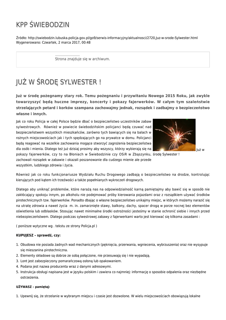 KPP ŚWIEBODZIN Źródło: http://swiebodzin.lubuska.policja.gov.pl/go9/serwis-informacyjny/aktualnosci/2720,Juz-w-srode-Sylwester.html Wygenerowano: Czwartek, 2 marca 2017, 00:48 Strona znajduje się w archiwum. JUŻ W ŚRODĘ SYLWESTER ! Już w środę pożegnamy stary rok. Temu pożegnaniu i przywitaniu Nowego 2015 Roku, jak zwykle towarzyszyć będą huczne imprezy, koncerty i pokazy fajerwerków. W całym tym szaleństwie strzelających petard i korków szampana zachowajmy jednak, rozsądek i zadbajmy o bezpieczeństwo własne i innych. Jak co roku Policja w całej Polsce będzie dbać o bezpieczeństwo uczestników zabaw sylwestrowych. Również w powiecie świebodzińskim policjanci będą czuwać nad bezpieczeństwem wszystkich mieszkańców, zarówno tych bawiących się na balach w rożnych miejscowościach jak i tych spędzających go na prywatce w domu. Policjanci będą reagować na wszelkie zachowania mogące stworzyć zagrożenia bezpieczeństwa dla osób i mienia. Dlatego też już dzisiaj prosimy aby wszyscy, którzy wybierają się na Już w pokazy fajerwerków, czy to na Błoniach w Świebodzinie czy OSiR w Zbąszynku, środę Sylwester ! zachowali rozsądek w zabawie i okazali poszanowanie dla cudzego mienie ale przede wszystkim, ludzkiego zdrowia i życia. Również jak co roku funkcjonariusze Wydziału Ruchu Drogowego zadbają o bezpieczeństwo na drodze, kontrolując kierujących pod kątem ich trzeźwości a także popełnianych wykroczeń drogowych. Dlatego aby uniknąć problemów, które narażą nas na odpowiedzialność karną pamiętajmy aby bawić się w sposób nie zakłócający spokoju innym, po alkoholu nie podejmować próby kierowania pojazdami oraz z rozsądkiem używać środków pirotechnicznych tzw. fajerwerków. Ponadto dbając o własne bezpieczeństwo unikajmy miejsc, w których możemy narazić się na utratę zdrowia a nawet życia m. in. zamarznięte stawy, balkony, dachy, spacer drogą w porze nocnej bez elementów oświetlenia lub odblasków. Stosując nawet minimalne środki ostrożności jesteśmy w stanie ochronić siebie i innych przed niebezpieczeństwem. Dlatego podczas sylwestrowej zabawy z fajerwerkami warto jest kierować się kilkoma zasadami : ( poniższe wytyczne wg . tekstu ze strony Policja.pl ) KUPUJESZ – sprawdź, czy: 1. Obudowa nie posiada żadnych wad mechanicznych (pęknięcia, przerwania, wgniecenia, wybrzuszenia) oraz nie wysypuje się mieszanina pirotechniczna. 2. Elementy składowe są dobrze ze sobą połączone, nie przesuwają się i nie wypadają. 3. Lont jest zabezpieczony pomarańczową osłoną lub opakowaniem. 4. Podana jest nazwa producenta wraz z danymi adresowymi. 5. Instrukcja obsługi napisana jest w języku polskim i zawiera co najmniej: informację o sposobie odpalenia oraz niezbędne ostrzeżenia. UŻYWASZ – pamiętaj: 1. Upewnij się, że strzelanie w wybranym miejscu i czasie jest dozwolone. W wielu miejscowościach obowiązują lokalne rozporządzenia, które ograniczają możliwość korzystania z wyrobów pirotechnicznych, np. tylko w noc sylwestrową. 2. Czytaj instrukcje. Bezwzględnie przestrzegaj zaleceń producenta. Zwróć uwagę na ostrzeżenia. 3. Zachowaj bezpieczną odległość – jest ona podana w instrukcji obsługi. Nigdy nie pochylaj się nad ładunkiem - stań z boku i trzymaj źródło ognia w wyciągniętej ręce. 4. Wybierz miejsce, w którym - korzystając z fajerwerków - nie zrobisz nikomu krzywdy i niczego nie zniszczysz. Sprawdź, czy na drodze ładunku nie znajdują się drzewa lub linie energetyczne. 5. Sprzedaż wyrobów pirotechnicznych nieletnim, użytkowanie fajerwerków w sposób niebezpieczny czy zakłócanie porządku zgłoś na Policję. 6. Gdy doszło do wypadku, wezwij służby ratownicze: straż pożarną, pogotowie. Ocena: 0/5 (0) Tweetnij