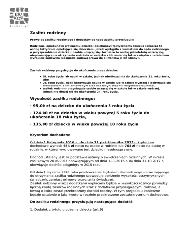 Zasiłek rodzinny Prawo do zasiłku rodzinnego i dodatków do tego zasiłku przysługuje: Rodzicom, opiekunowi prawnemu dziecka; opiekunowi faktycznemu dziecka (oznacza to osobę faktycznie opiekującą się dzieckiem, jeżeli wystąpiła z wnioskiem do sądu rodzinnego o przysposobienie dziecka); osobie uczącej się. (oznacza to osobę pełnoletnią uczącą się, niepozostającą na utrzymaniu rodziców w związku z ich śmiercią lub w związku z ustaleniem wyrokiem sądowym lub ugodą sądową prawa do alimentów z ich strony). Zasiłek rodzinny przysługuje do ukończenia przez dziecko: 18. roku życia lub nauki w szkole, jednak nie dłużej niż do ukończenia 21. roku życia, albo 24. roku życia, jeżeli kontynuuje naukę w szkole lub w szkole wyższej i legitymuje się orzeczeniem o umiarkowanym albo znacznym stopniu niepełnosprawności, zasiłek rodzinny przysługuje osobie uczącej się w szkole lub w szkole wyższej, jednak nie dłużej niż do ukończenia 24. roku życia. Wysokość zasiłku rodzinnego: · 95,00 zł na dziecko do ukończenia 5 roku życia · 124,00 zł na dziecko w wieku powyżej 5 roku życia do ukończenia 18 roku życia, · 135,00 zł dziecko w wieku powyżej 18 roku życia Kryterium dochodowe Od dnia 1 listopada 2016 r. do dnia 31 października 2017 r. kryterium dochodowe wynosi: 674 zł netto na osobę w rodzinie lub 764 zł netto na osobę w rodzinie, w której wychowywane jest dziecko niepełnosprawne. Dochód ustalany jest na podstawie ustawy o świadczeniach rodzinnych. W okresie zasiłkowym 2016/2017 obowiązującym od dnia 1.11.2016 r. do dnia 31.10.2017 r. obowiązuje dochód osiągnięty w 2015 roku. Od dnia 1 stycznia 2016 roku przekroczenie kryterium dochodowego uprawniającego do otrzymania zasiłku rodzinnego spowoduje obniżenie wysokości otrzymywanych świadczeń, zamiast odmowy przyznania świadczeń. Zasiłek rodzinny wraz z dodatkami wypłacany będzie w wysokości różnicy pomiędzy łączną kwotą zasiłków rodzinnych wraz z dodatkami przysługującymi rodzinie, a kwotą o którą został przekroczony dochód rodziny. W tym przypadku konieczne będzie ustalenie o jaką kwotę w rodzinie przekroczone zostało kryterium dochodowe. Do zasiłku rodzinnego przysługują następujące dodatki: 1. Dodatek z tytułu urodzenia dziecka (art.9) 2. Dodatek z tytułu opieki nad dzieckiem w okresie korzystania z urlopu wychowawczego (art.10) 3. Dodatek z tytułu samotnego wychowywania dziecka (art. 11 a) 4. Dodatek z tytułu wychowywania dziecka w rodzinie wielodzietnej (art. 12a) 5. Dodatek z tytułu kształcenia i rehabilitacji dziecka niepełnosprawnego (art. 13) 6. Dodatek z tytułu rozpoczęcia roku szkolnego (art. 14) 7. Dodatek z tytułu podjęcia przez dziecko nauki w szkole poza miejscem zamieszkania (art. 15) Wnioskodawca w zależności od jego sytuacji osobistej jest zobowiązany dołączyć do wniosku o ustalenie prawa do zasiłku rodzinnego oraz dodatków do zasiłku rodzinnego następujące dokumenty: 1) zaświadczenie szkoły albo oświadczenie o uczęszczaniu dziecka do szkoły – w przypadku gdy dziecko ukończyło 18. rok życia; wzór zaświadczenia i oświadczenia określa załącznik nr 2 do rozporządzenia; 2) zaświadczenie szkoły wyższej albo oświadczenie o uczęszczaniu do szkoły wyższej – w przypadku osoby uczącej się lub osoby legitymującej się orzeczeniem o umiarkowanym albo znacznym stopniu niepełnosprawności, jeżeli osoba uczy się w szkole wyższej; wzór zaświadczenia i oświadczenia określa załącznik nr 3 do rozporządzenia; 3) dokumenty stwierdzające wysokość dochodu rodziny, w tym odpowiednio: a) oświadczenia członków rodziny o dochodach osiągniętych w roku kalendarzowym poprzedzającym okres zasiłkowy, innych niż dochody podlegające opodatkowaniu podatkiem dochodowym od osób fizycznych na zasadach określonych w art. 27, art. 30b, art. 30c, art. 30e i art. 30f ustawy z dnia 26 lipca 1991 r. o podatku dochodowym od osób fizycznych (Dz. U. z 2012 r. poz. 361, z późn. zm.3); wzór oświadczenia określa załącznik nr 4 do rozporządzenia, b) oświadczenia członków rodziny rozliczających się na podstawie przepisów o zryczałtowanym podatku dochodowym od niektórych przychodów osiąganych przez osoby fizyczne o dochodzie osiągniętym w roku kalendarzowym poprzedzającym okres zasiłkowy; wzór oświadczenia określa załącznik nr 5 do rozporządzenia, c) zaświadczenie właściwego organu gminy, nakaz płatniczy albo oświadczenie o wielkości gospodarstwa rolnego wyrażonej w hektarach przeliczeniowych ogólnej powierzchni w roku kalendarzowym poprzedzającym okres zasiłkowy; wzór oświadczenia określa załącznik nr 6 do rozporządzenia, d) umowę dzierżawy – w przypadku oddania części lub całości znajdującego się w posiadaniu rodziny gospodarstwa rolnego w dzierżawę, na podstawie umowy zawartej stosownie do przepisów o ubezpieczeniu społecznym rolników, albo oddania gospodarstwa rolnego w dzierżawę w związku z pobieraniem renty określonej w przepisach o wspieraniu rozwoju obszarów wiejskich ze środków pochodzących z Sekcji Gwarancji Europejskiego Funduszu Orientacji i Gwarancji Rolnej, e) umowę o wniesieniu wkładów gruntowych – w przypadku wniesienia gospodarstwa rolnego do użytkowania przez rolniczą spółdzielnię produkcyjną, f) odpis podlegającego wykonaniu orzeczenia sądu zasądzającego alimenty na rzecz osób w rodzinie lub poza rodziną lub odpis protokołu posiedzenia zawierającego treść ugody sądowej, lub odpis zatwierdzonej przez sąd ugody zawartej przed mediatorem, zobowiązujących do alimentów na rzecz osób w rodzinie lub poza rodziną, g) przekazy lub przelewy pieniężne dokumentujące wysokość zapłaconych alimentów, jeżeli członkowie rodziny są zobowiązani orzeczeniem sądu, ugodą sądową lub ugodą zawartą przed mediatorem do ich płacenia na rzecz osoby spoza rodziny, h) w przypadku gdy osoba upr