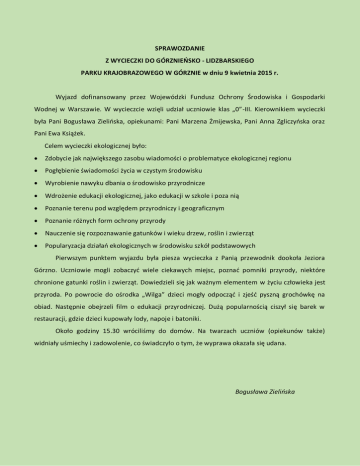 SPRAWOZDANIE Z WYCIECZKI DO GÓRZNIEŃSKO - LIDZBARSKIEGO PARKU KRAJOBRAZOWEGO W GÓRZNIE w dniu 9 kwietnia 2015 r. Wyjazd dofinansowany przez Wojewódzki Fundusz Ochrony Środowiska i Gospodarki Wodnej w Warszawie. W wycieczcie wzięli udział uczniowie klas „0”-III. Kierownikiem wycieczki była Pani Bogusława Zielińska, opiekunami: Pani Marzena Żmijewska, Pani Anna Zgliczyńska oraz Pani Ewa Książek. Celem wycieczki ekologicznej było: Zdobycie jak największego zasobu wiadomości o problematyce ekologicznej regionu Pogłębienie świadomości życia w czystym środowisku Wyrobienie nawyku dbania o środowisko przyrodnicze Wdrożenie edukacji ekologicznej, jako edukacji w szkole i poza nią Poznanie terenu pod względem przyrodniczy i geograficznym Poznanie różnych form ochrony przyrody Nauczenie się rozpoznawanie gatunków i wieku drzew, roślin i zwierząt Popularyzacja działań ekologicznych w środowisku szkół podstawowych Pierwszym punktem wyjazdu była piesza wycieczka z Panią przewodnik dookoła Jeziora Górzno. Uczniowie mogli zobaczyć wiele ciekawych miejsc, poznać pomniki przyrody, niektóre chronione gatunki roślin i zwierząt. Dowiedzieli się jak ważnym elementem w życiu człowieka jest przyroda. Po powrocie do ośrodka „Wilga” dzieci mogły odpocząć i zjeść pyszną grochówkę na obiad. Następnie obejrzeli film o edukacji przyrodniczej. Dużą popularnością ciszył się barek w restauracji, gdzie dzieci kupowały lody, napoje i batoniki. Około godziny 15.30 wróciliśmy do domów. Na twarzach uczniów (opiekunów także) widniały uśmiechy i zadowolenie, co świadczyło o tym, że wyprawa okazała się udana. Bogusława Zielińska